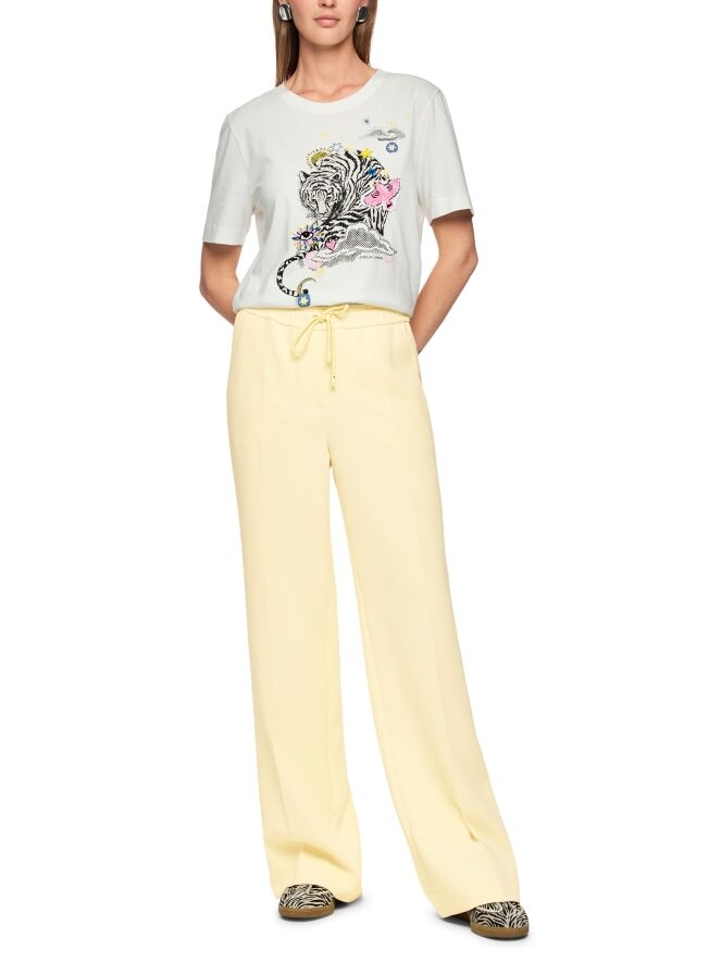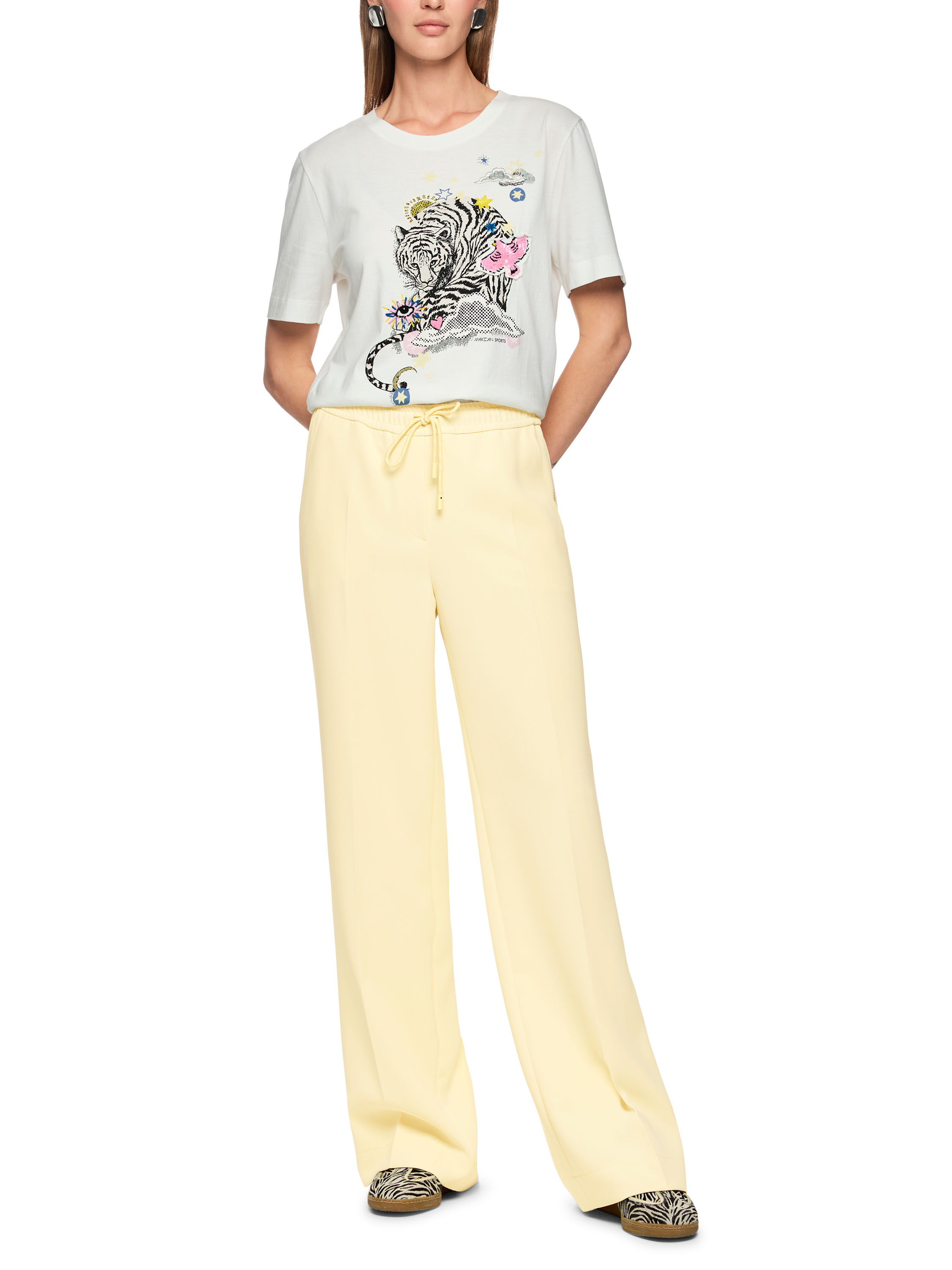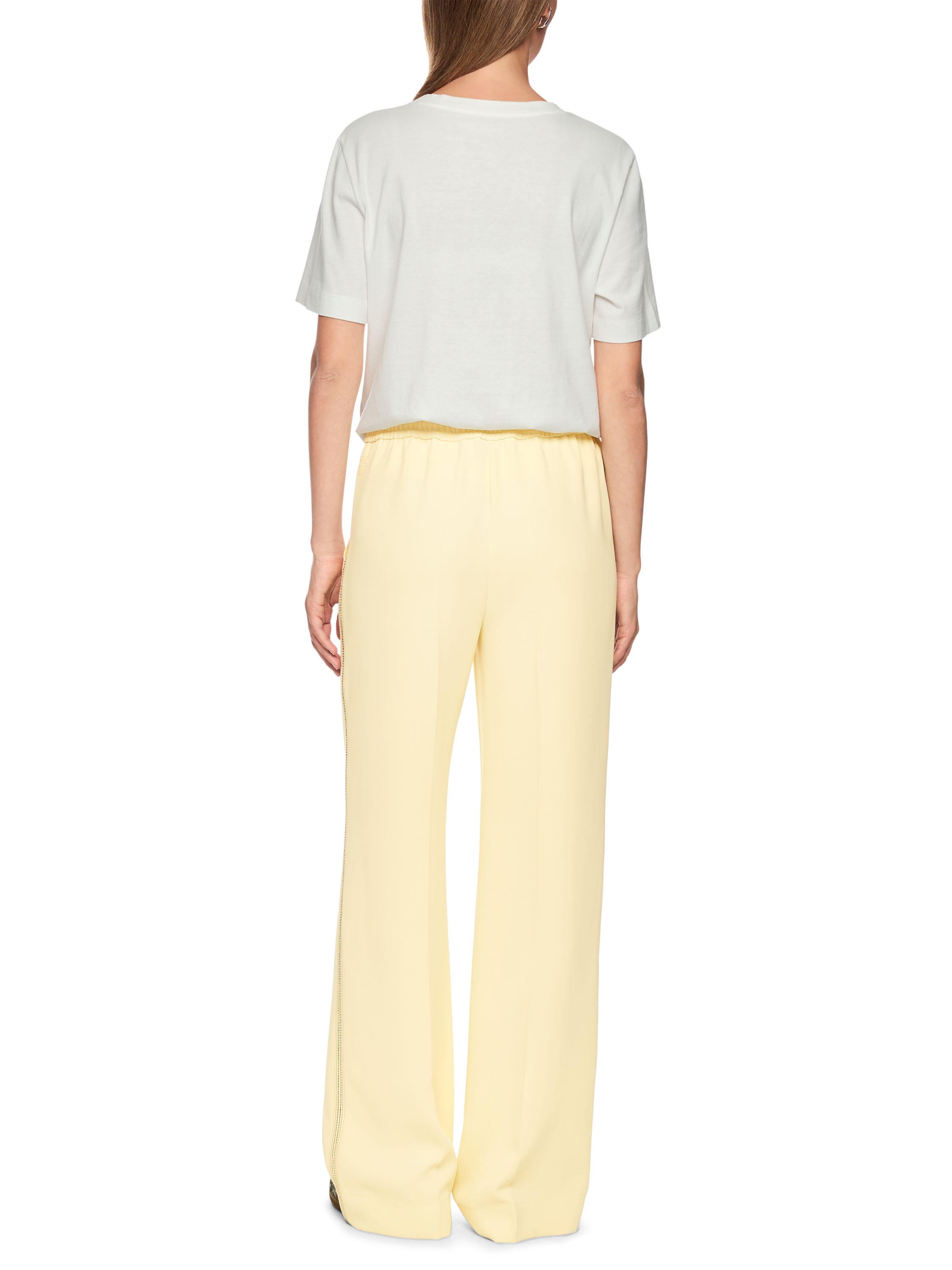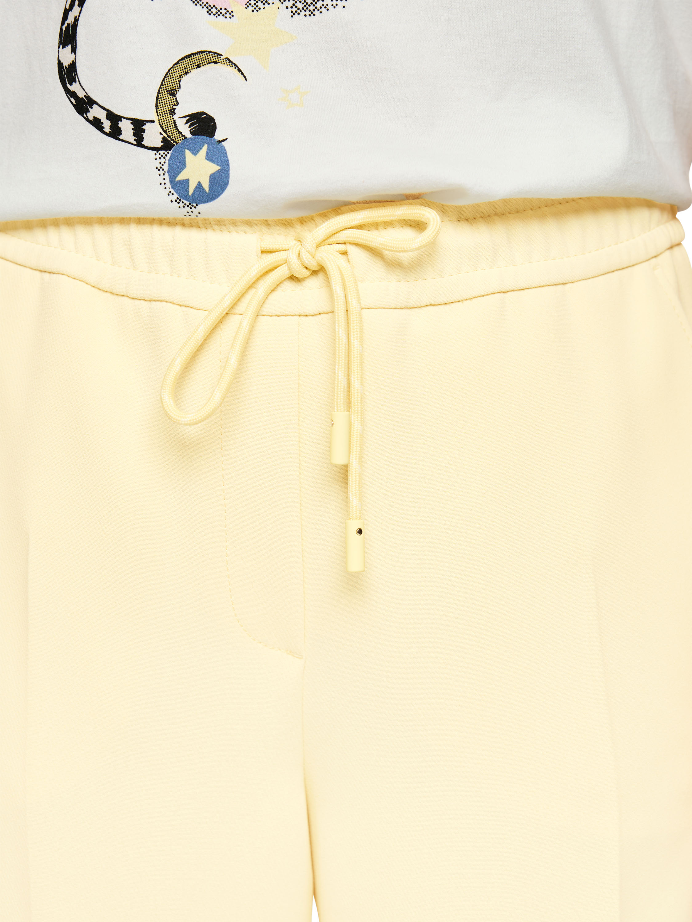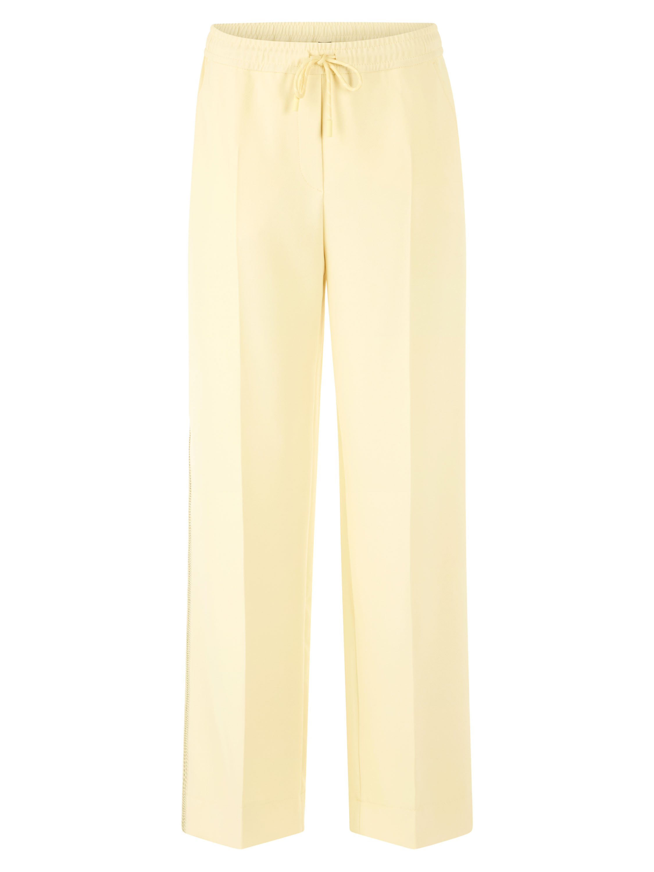 A pair of joggers from Marc Cain in pastel yellow. The waistband features a finely gathered elastic band with a drawstring in a tunnel design. At the centre of the straight-cut legs is a pressed crease. The trousers have slit pockets, and along the sides runs a trim with three sand-coloured stitch lines. These trousers can be washed at 30 degrees.