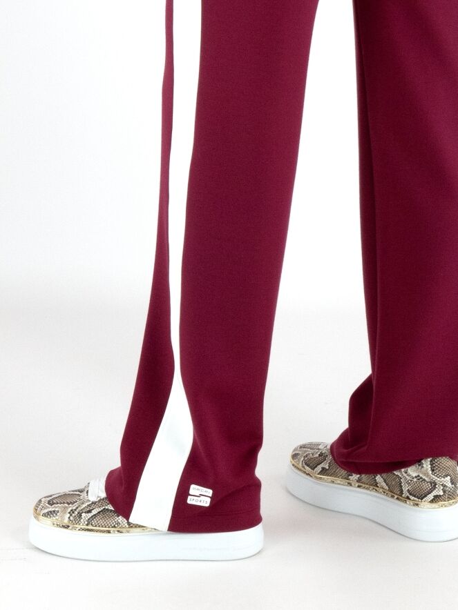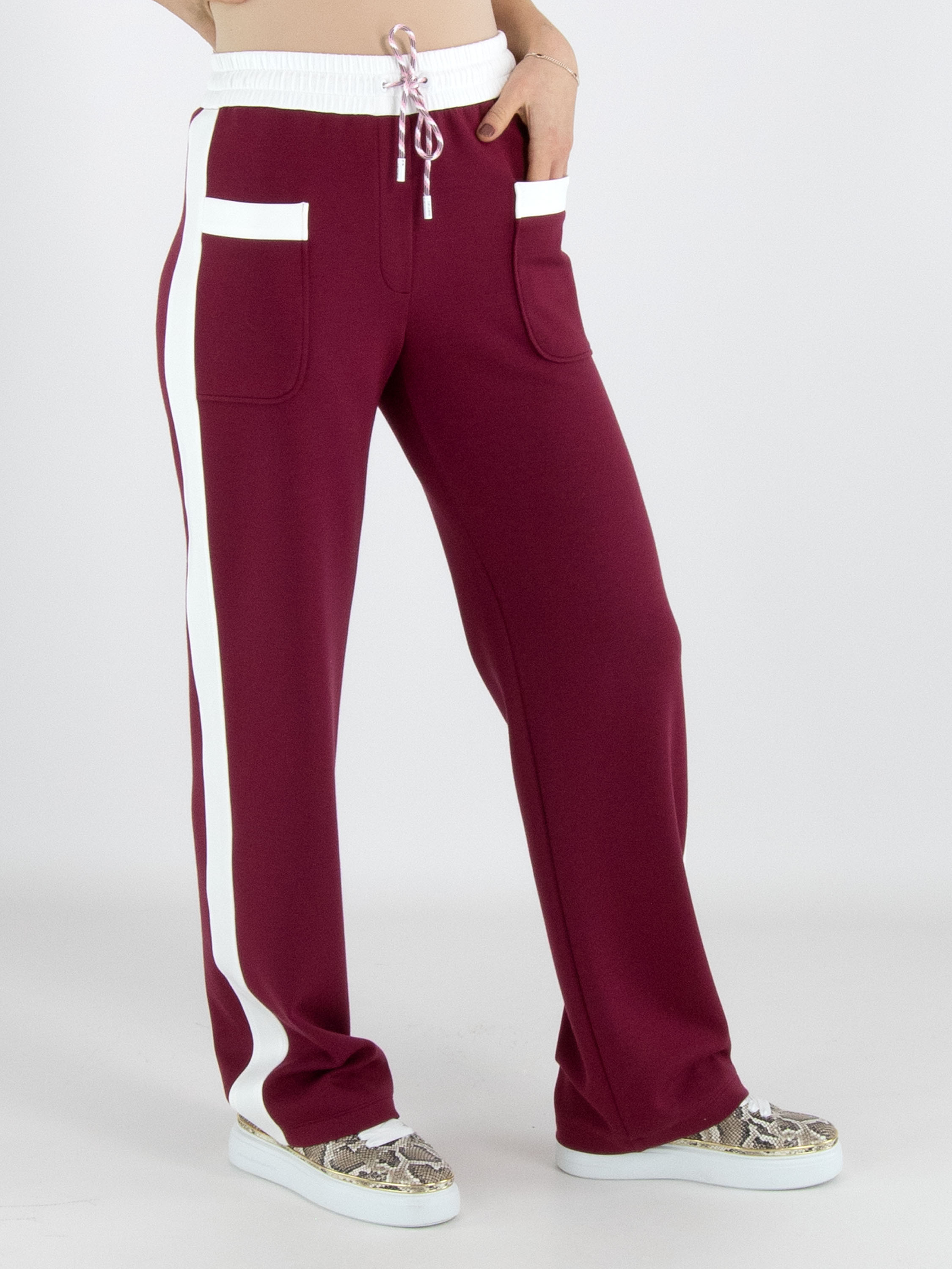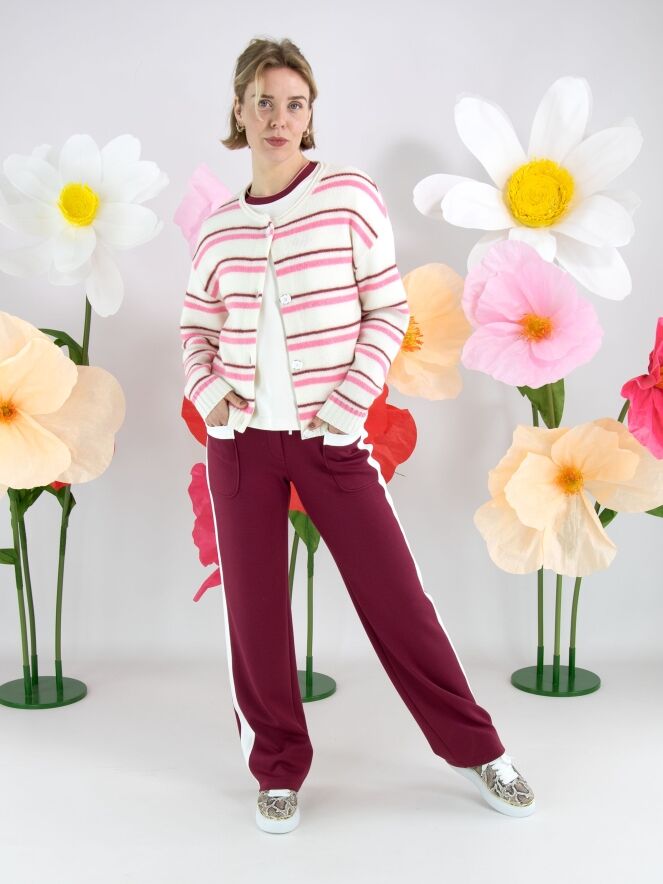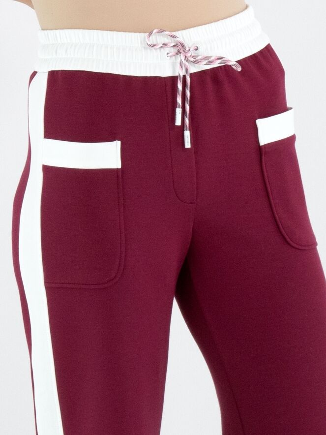 A pair of joggers from Marc Cain in burgundy. The waistband features a wide, finely gathered elastic band in off-white with a drawstring in a tunnel design. Along the straight-cut legs runs a wide off-white trim on the sides. These trousers can be washed at 30 degrees.