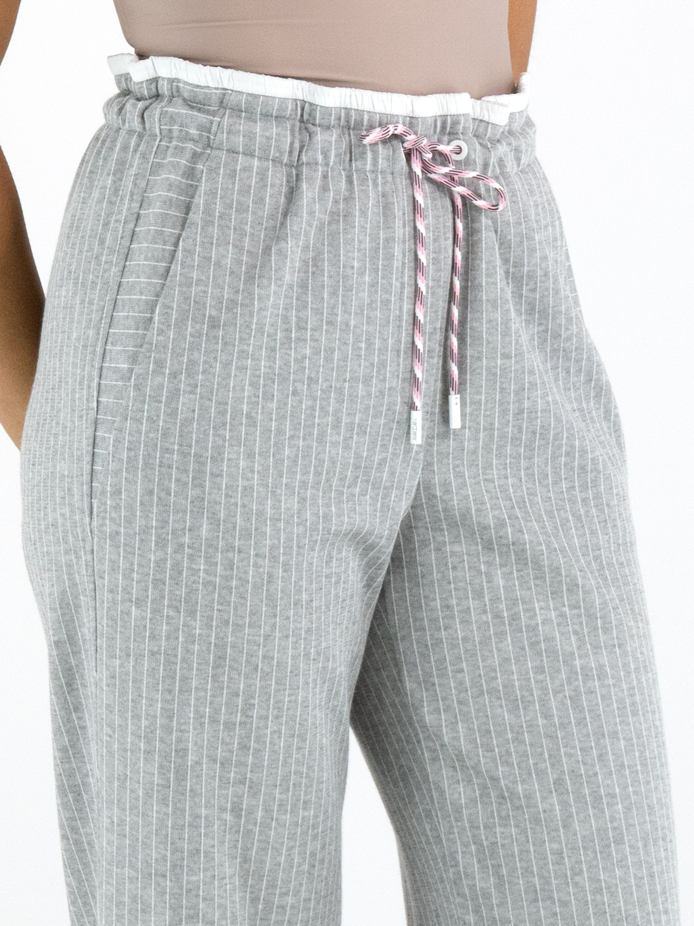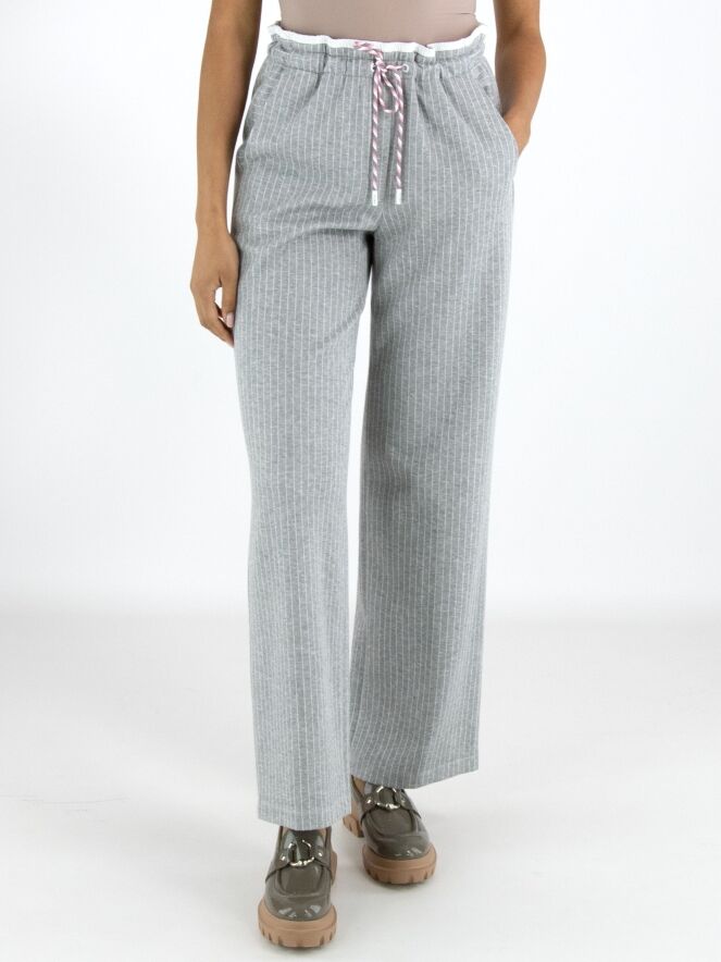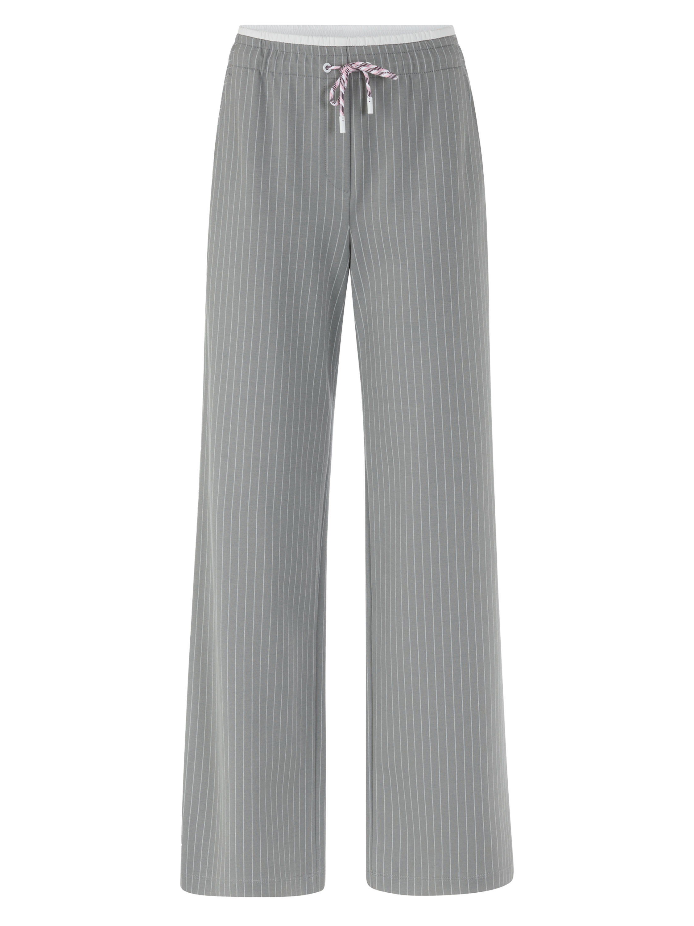 Jogging trousers from Marc Cain in a chalk-stripe print in light grey and white. The waistband features an elastic band with a drawstring in a tunnel design. The trousers have slit pockets and can be washed at 30 degrees.