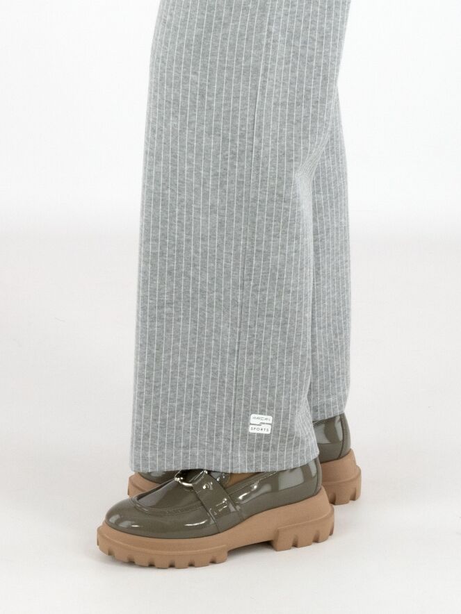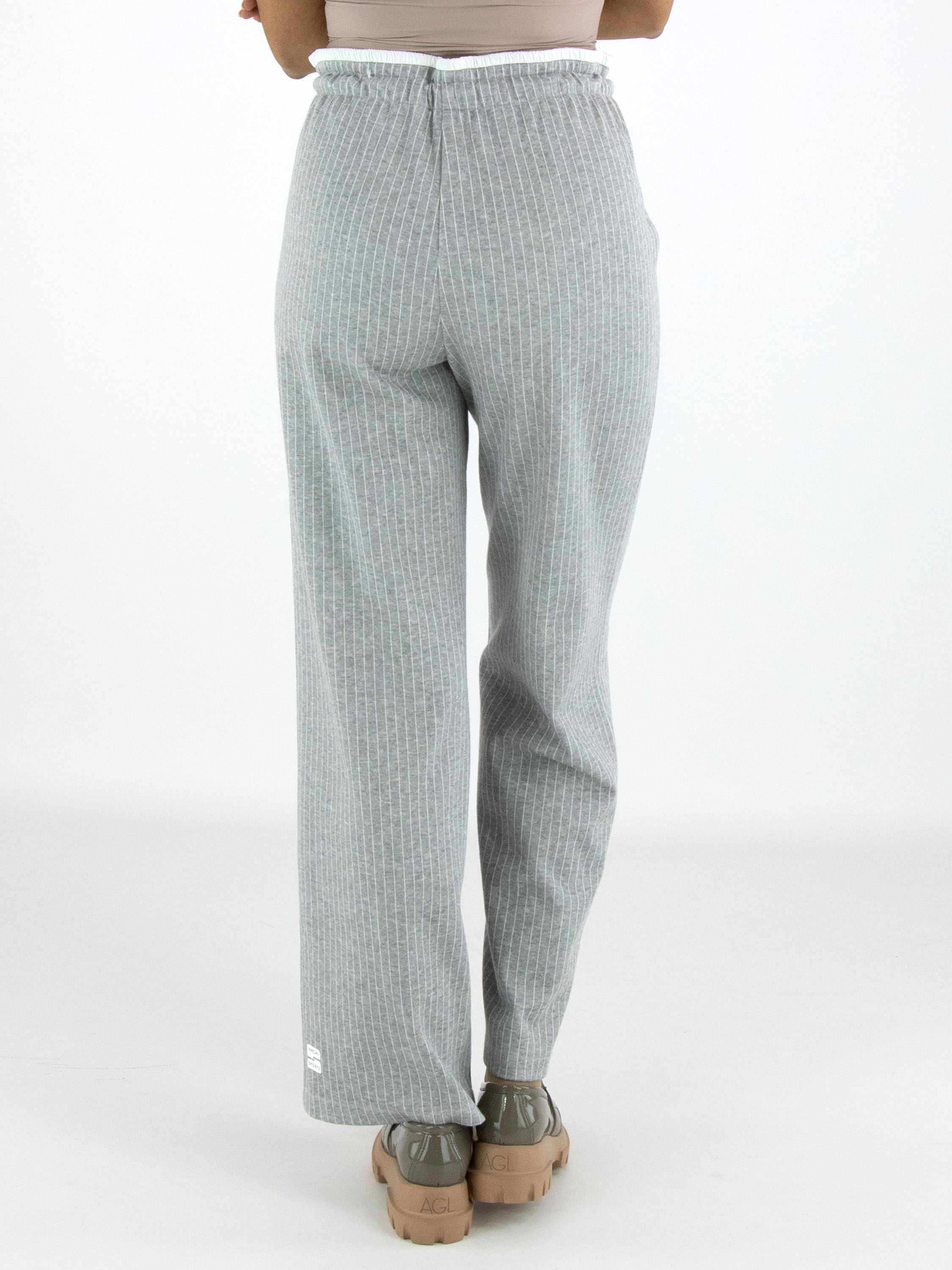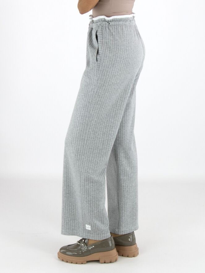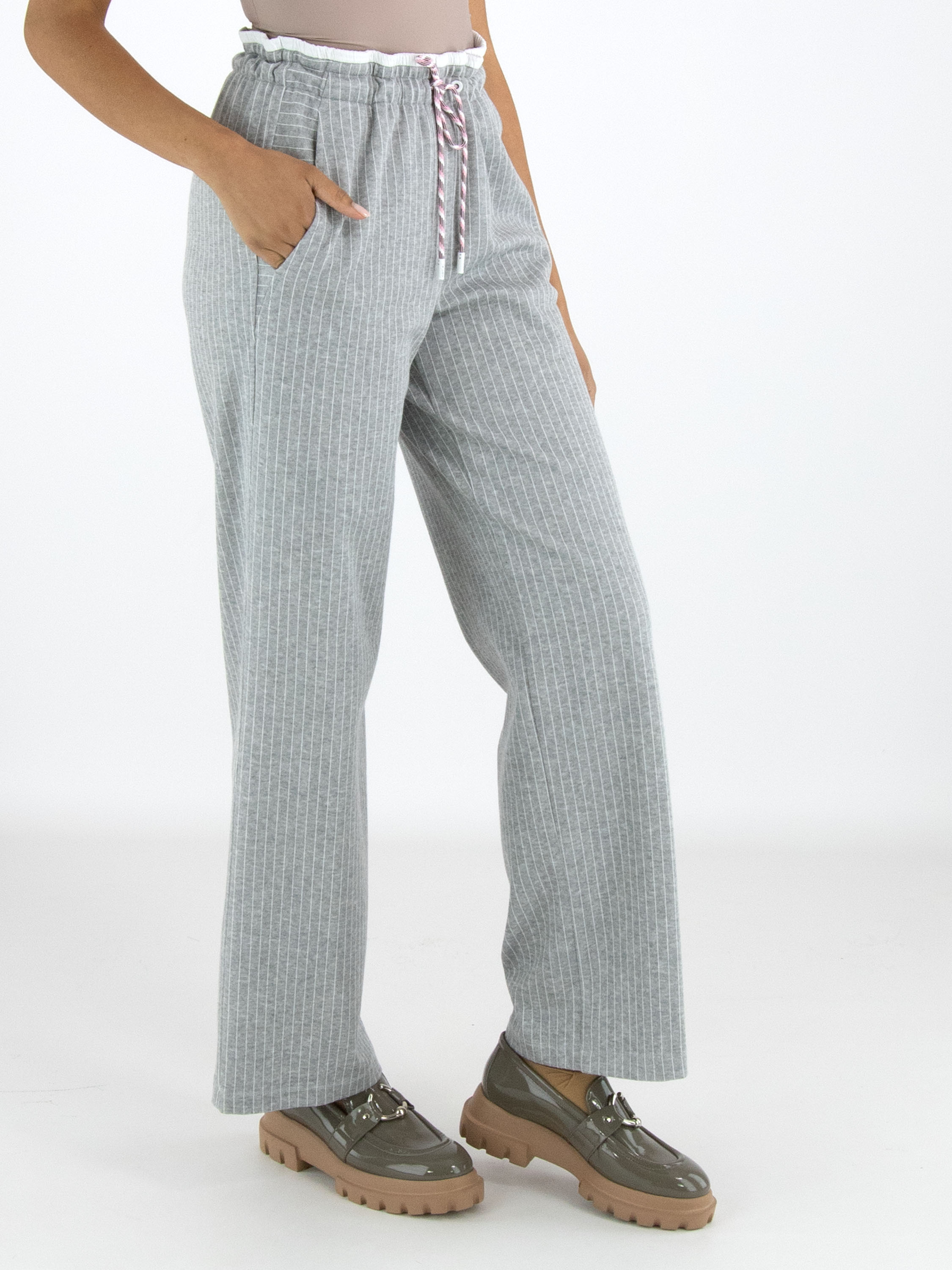 Jogging trousers from Marc Cain in a chalk-stripe print in light grey and white. The waistband features an elastic band with a drawstring in a tunnel design. The trousers have slit pockets and can be washed at 30 degrees.