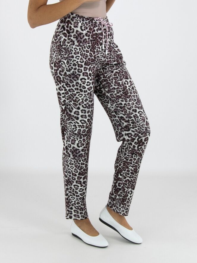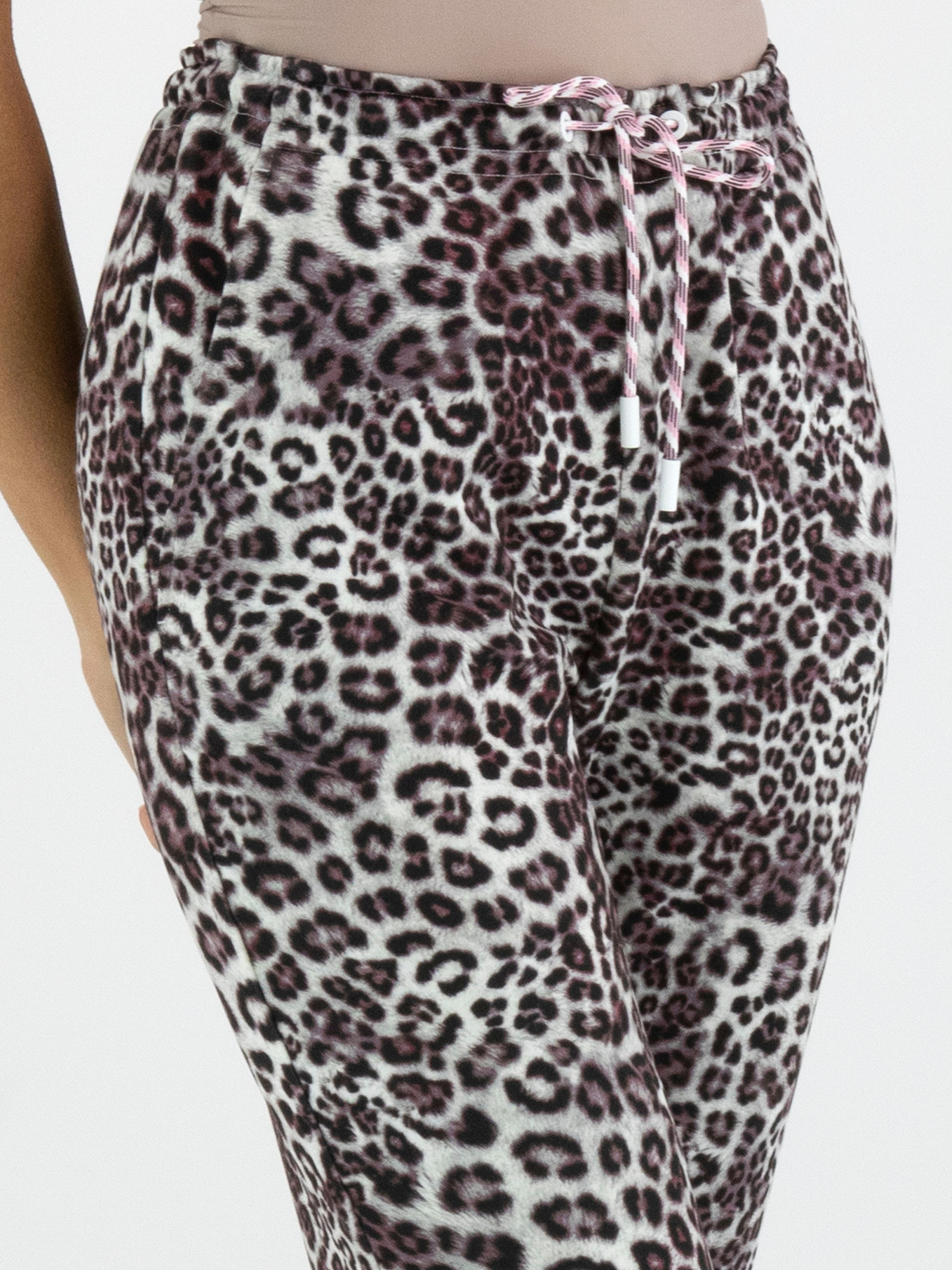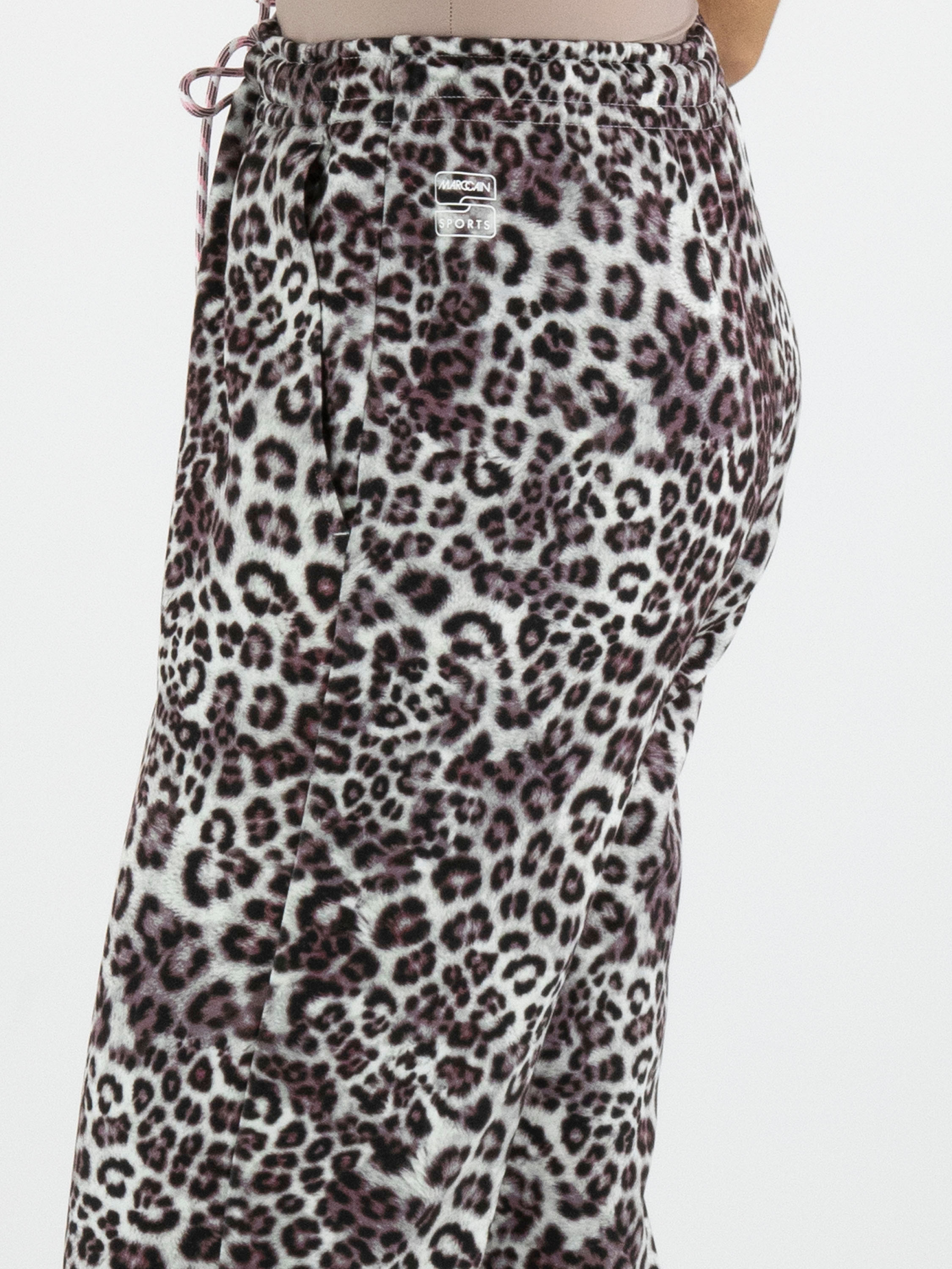 Trousers in a scuba quality from Marc Cain in a leopard print with various shades of grey, burgundy and white. The waistband features an elastic band with a drawstring in a tunnel design. The trousers have slit pockets and can be washed at 30 degrees.