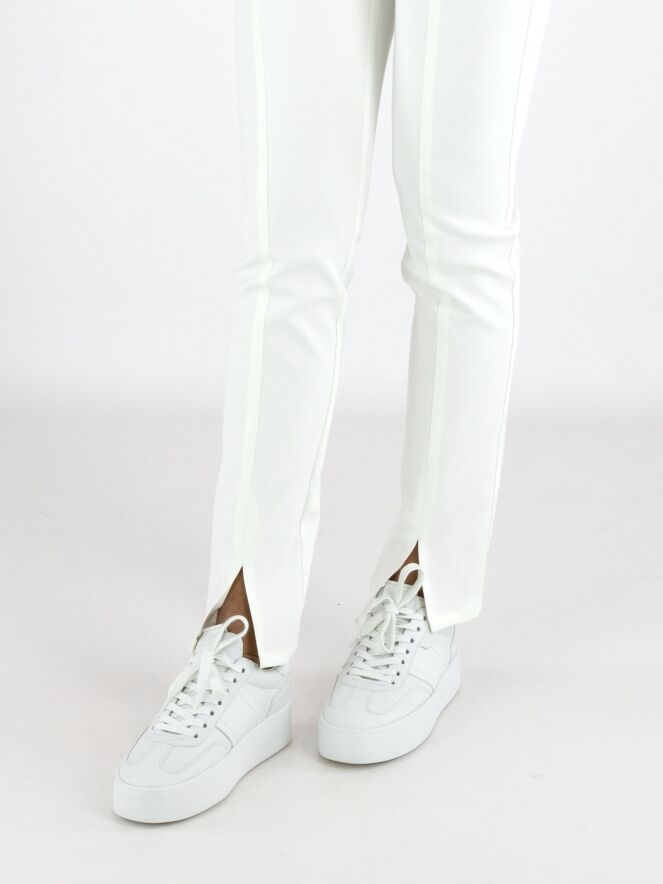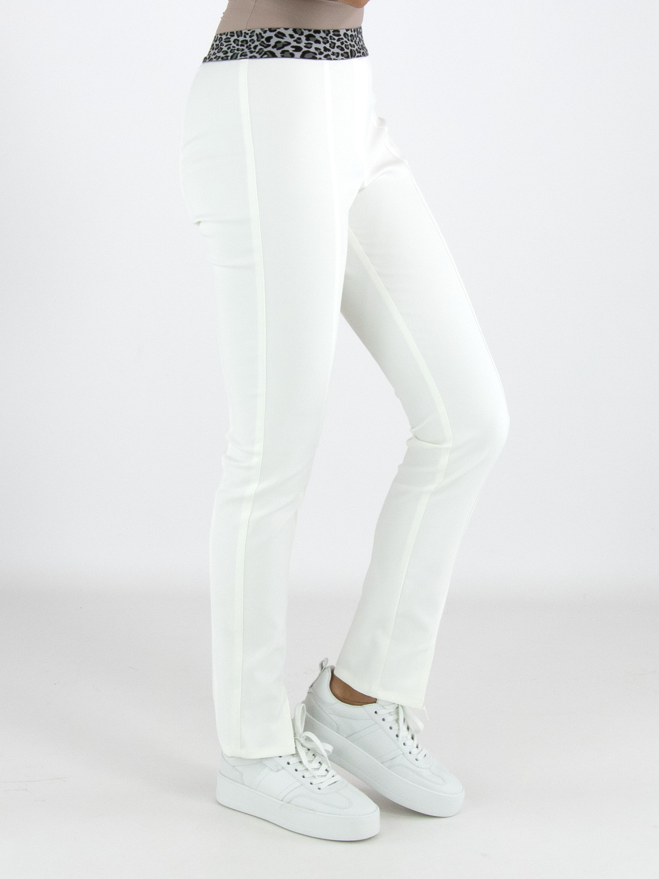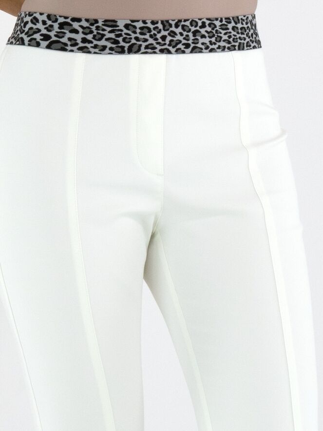 Trousers from Marc Cain in an off-white solid colour. The waistband features an elastic band in a leopard print with various shades of grey and black. A seam runs down the centre of the legs. At the bottom, on the outer side, there is a small slit. These trousers can be washed at 30 degrees.