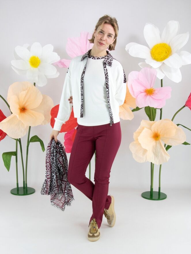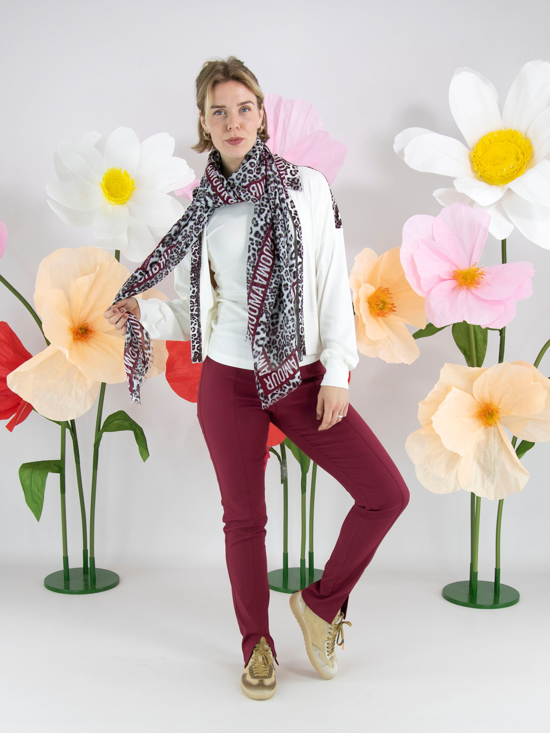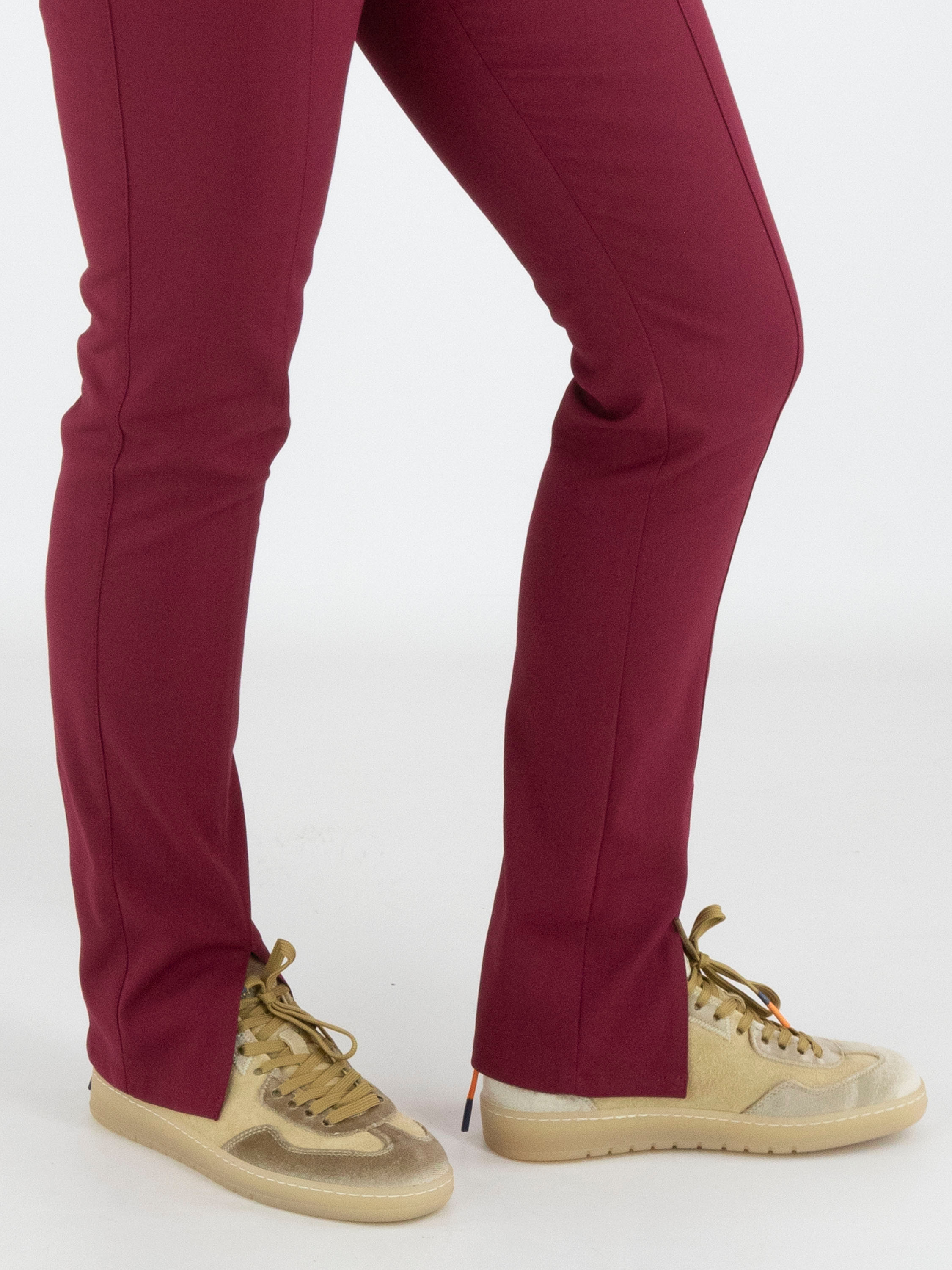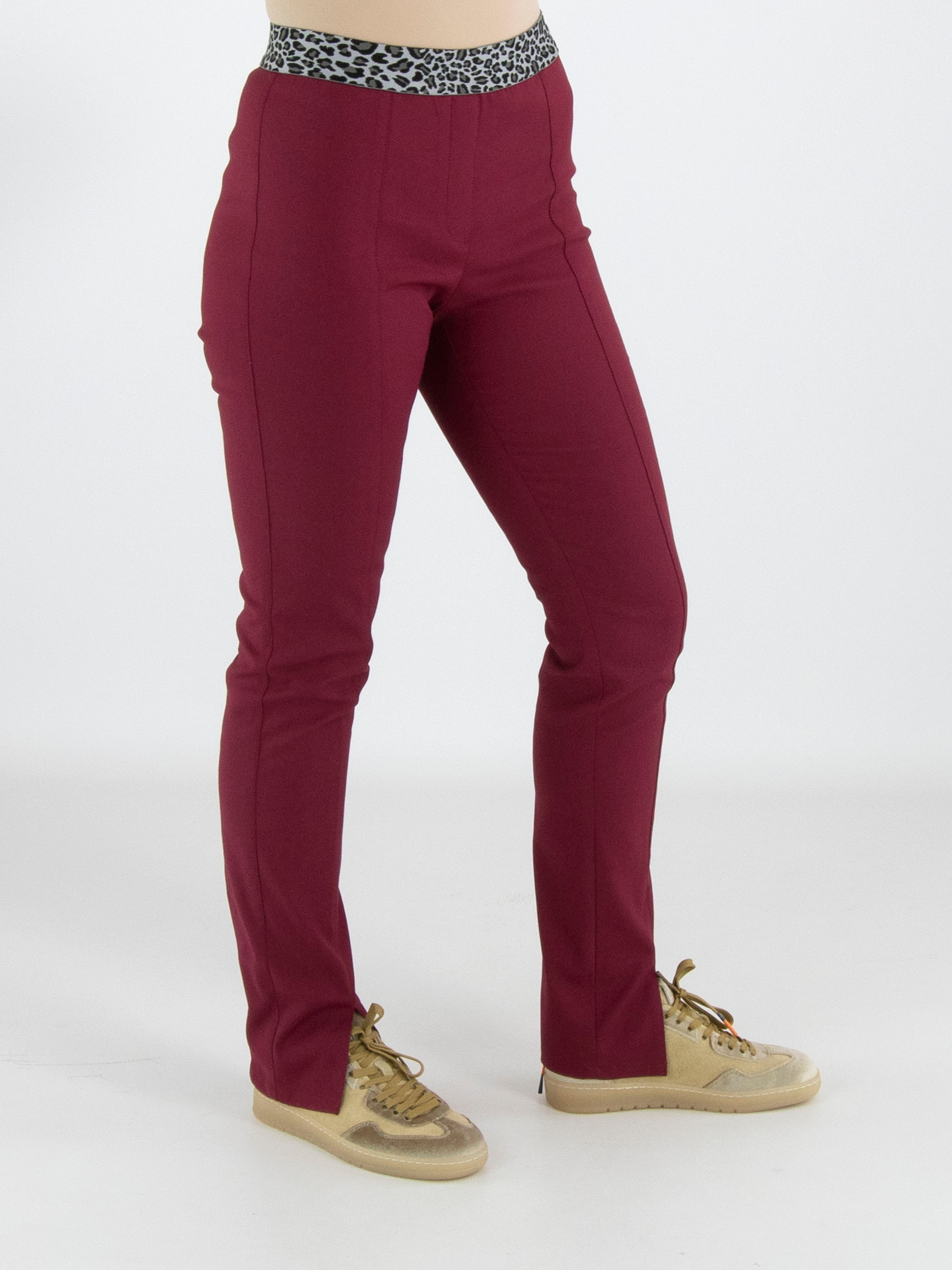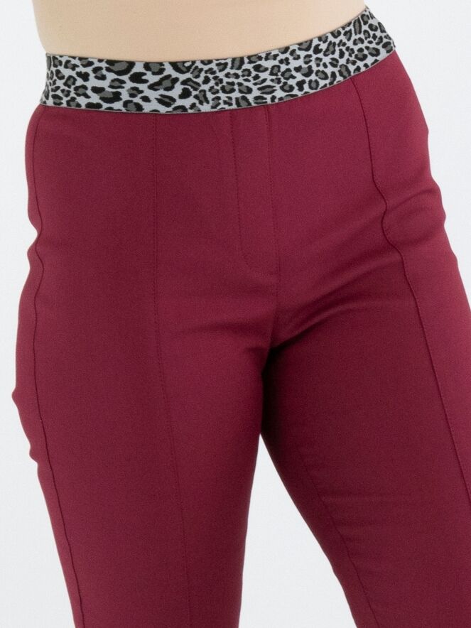 Trousers from Marc Cain in a solid burgundy colour. The waistband features an elastic band in a leopard print with various shades of grey and black. A seam runs down the centre of the legs. At the bottom, on the outer side, there is a small slit. These trousers can be washed at 30 degrees.