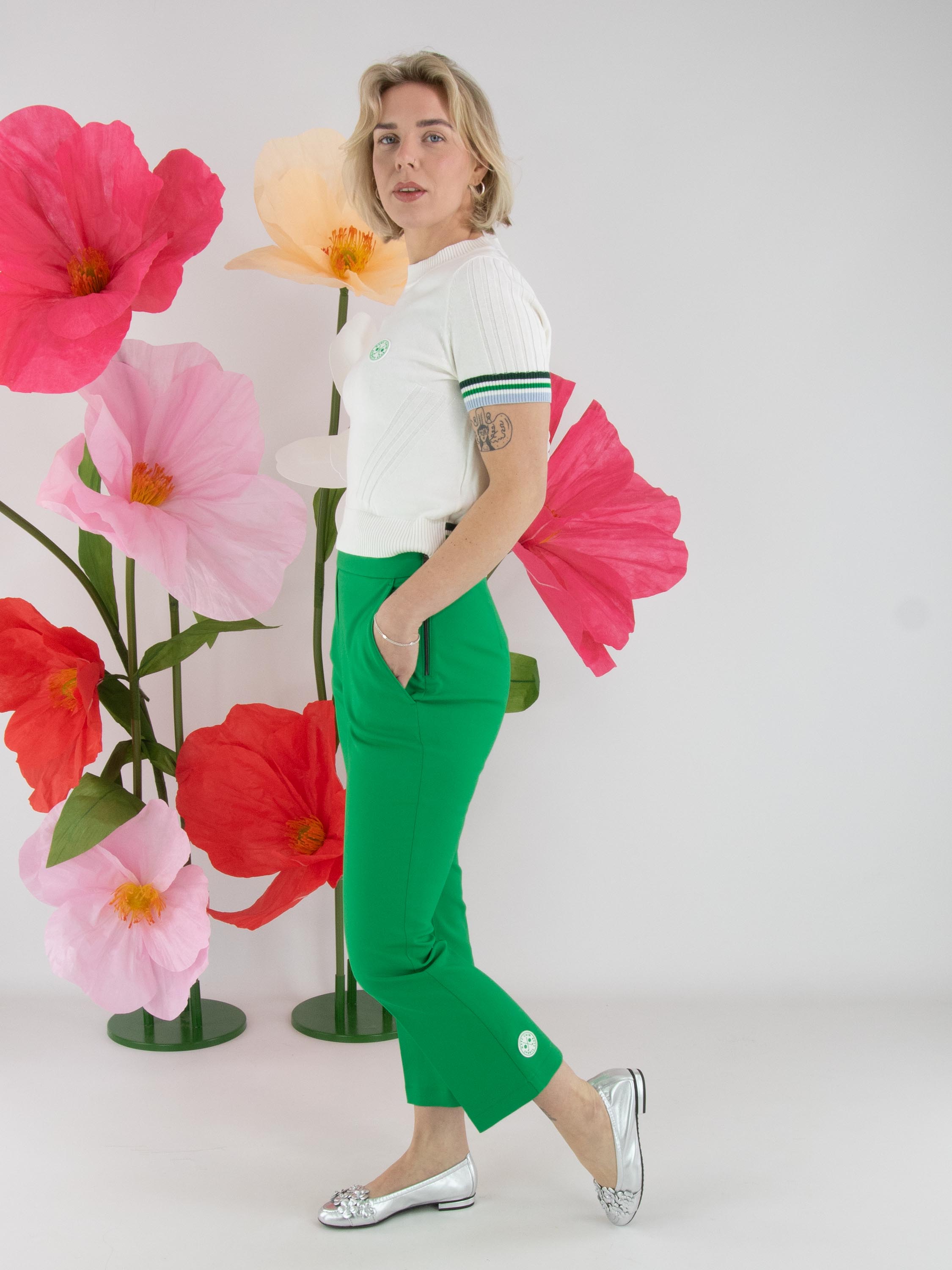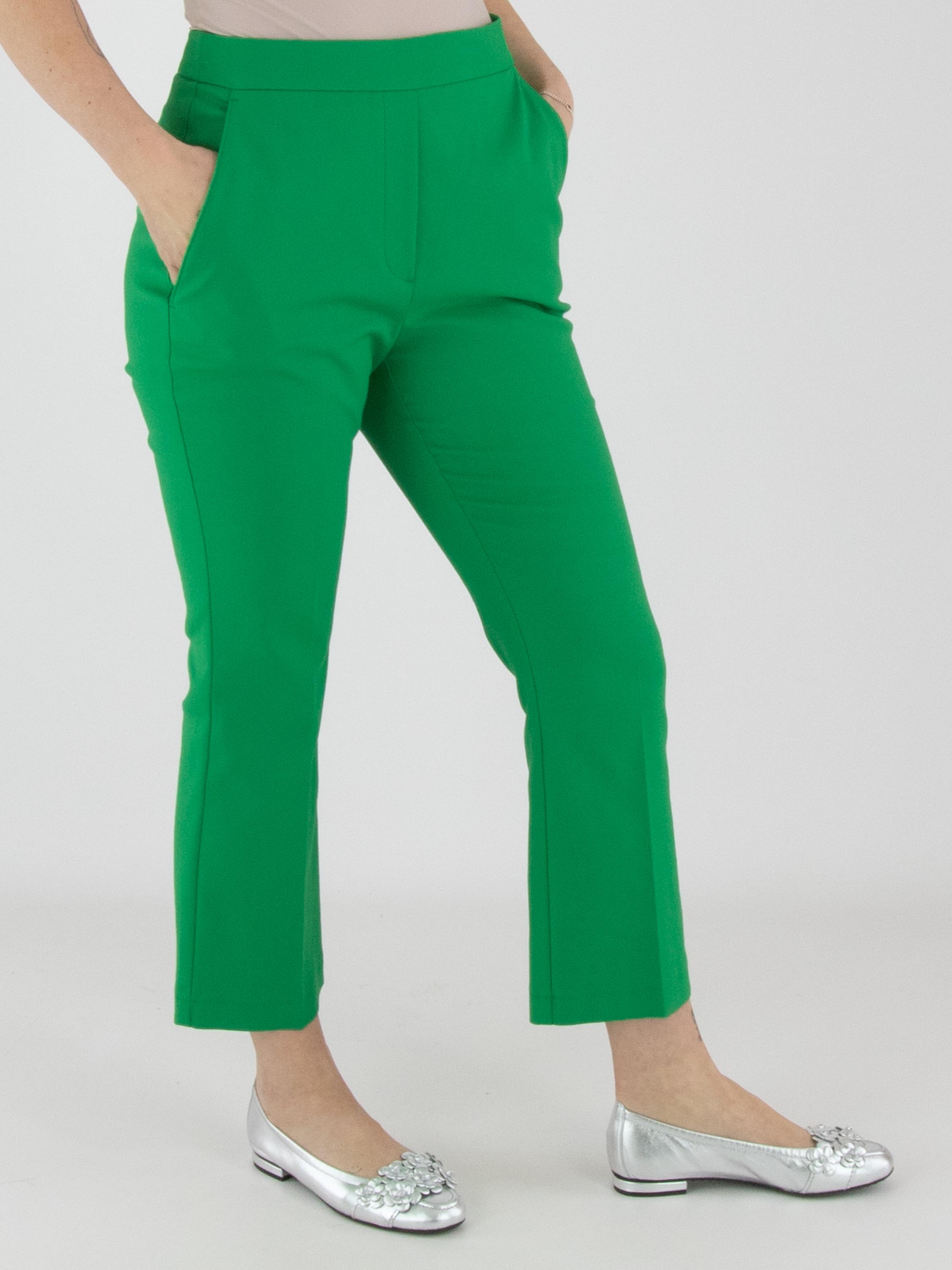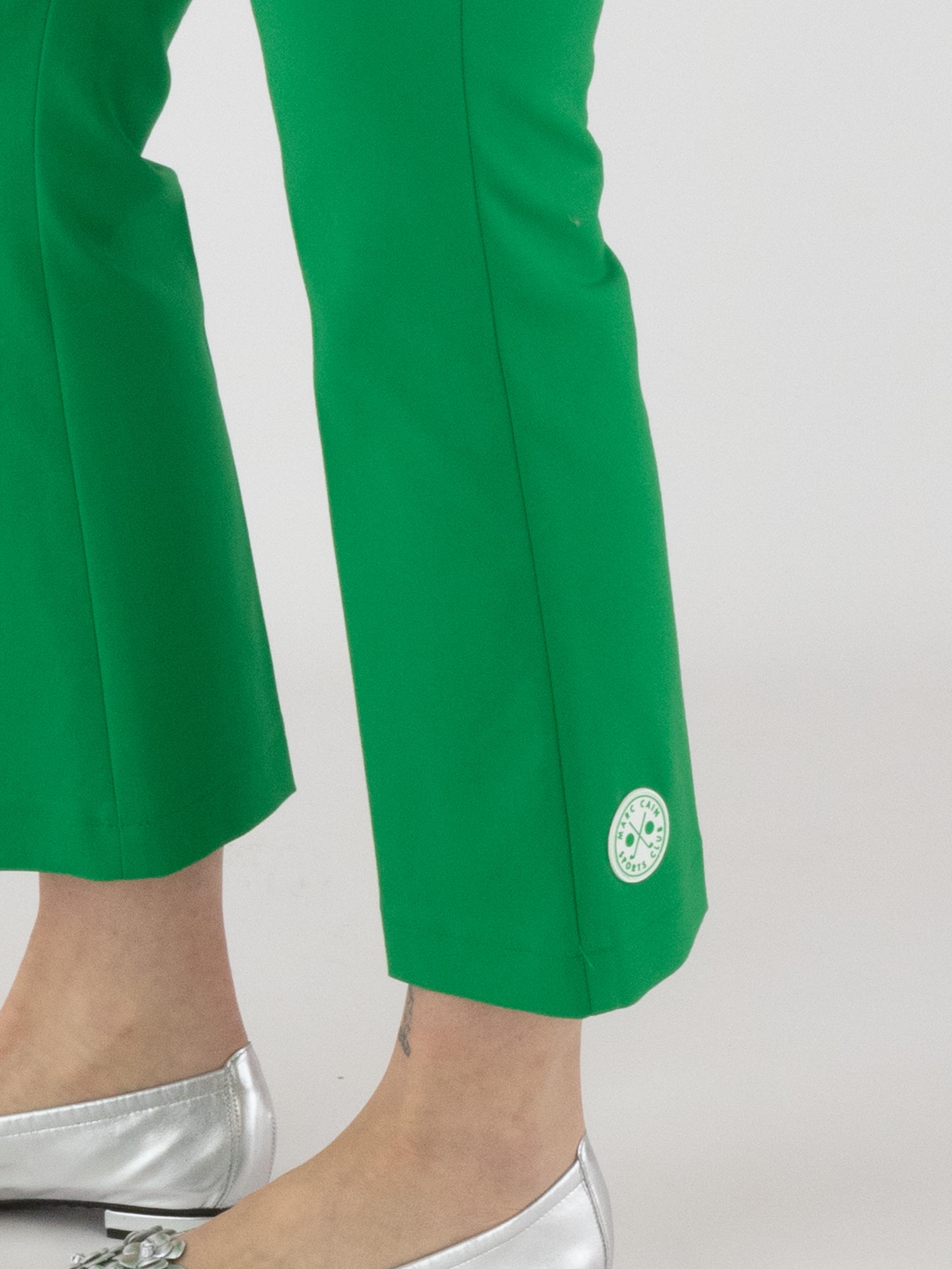 Trousers by Marc Cain in green. On the left side, a zip fastening runs from the waistband down to the hip. A pressed crease runs along the centre of the legs. The trousers feature side pockets and can be washed at 30 degrees.