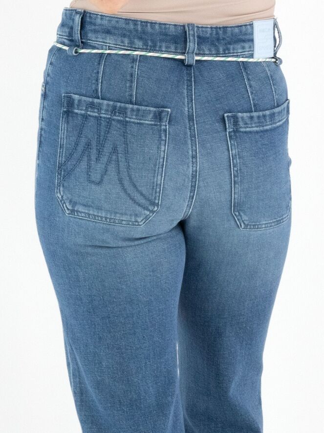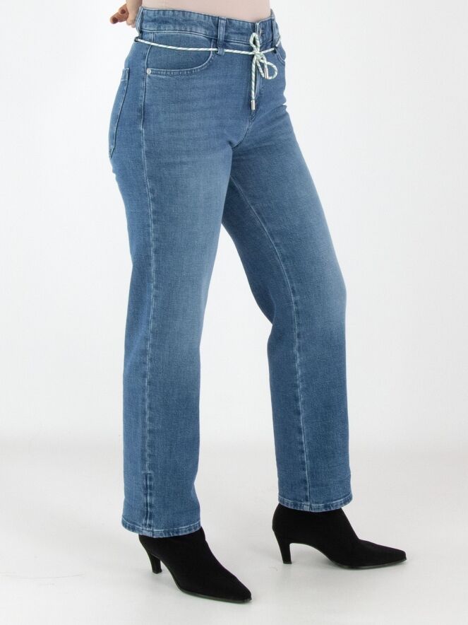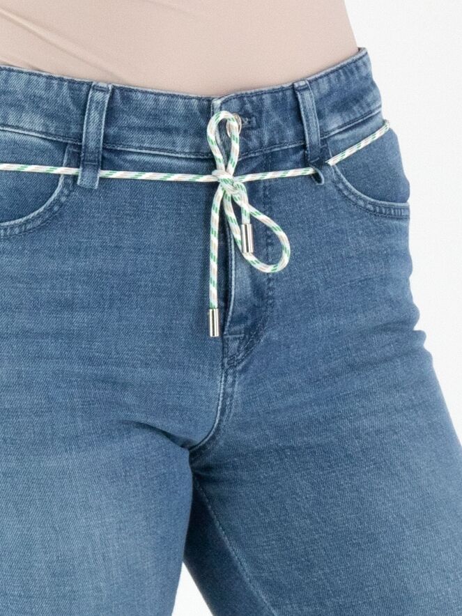 A pair of jeans by Marc Cain in a classic denim blue shade. Below the waistband, a lace-up cord detail is applied in green, sand and white. The jeans feature a turn-up hem and can be washed at 30 degrees.