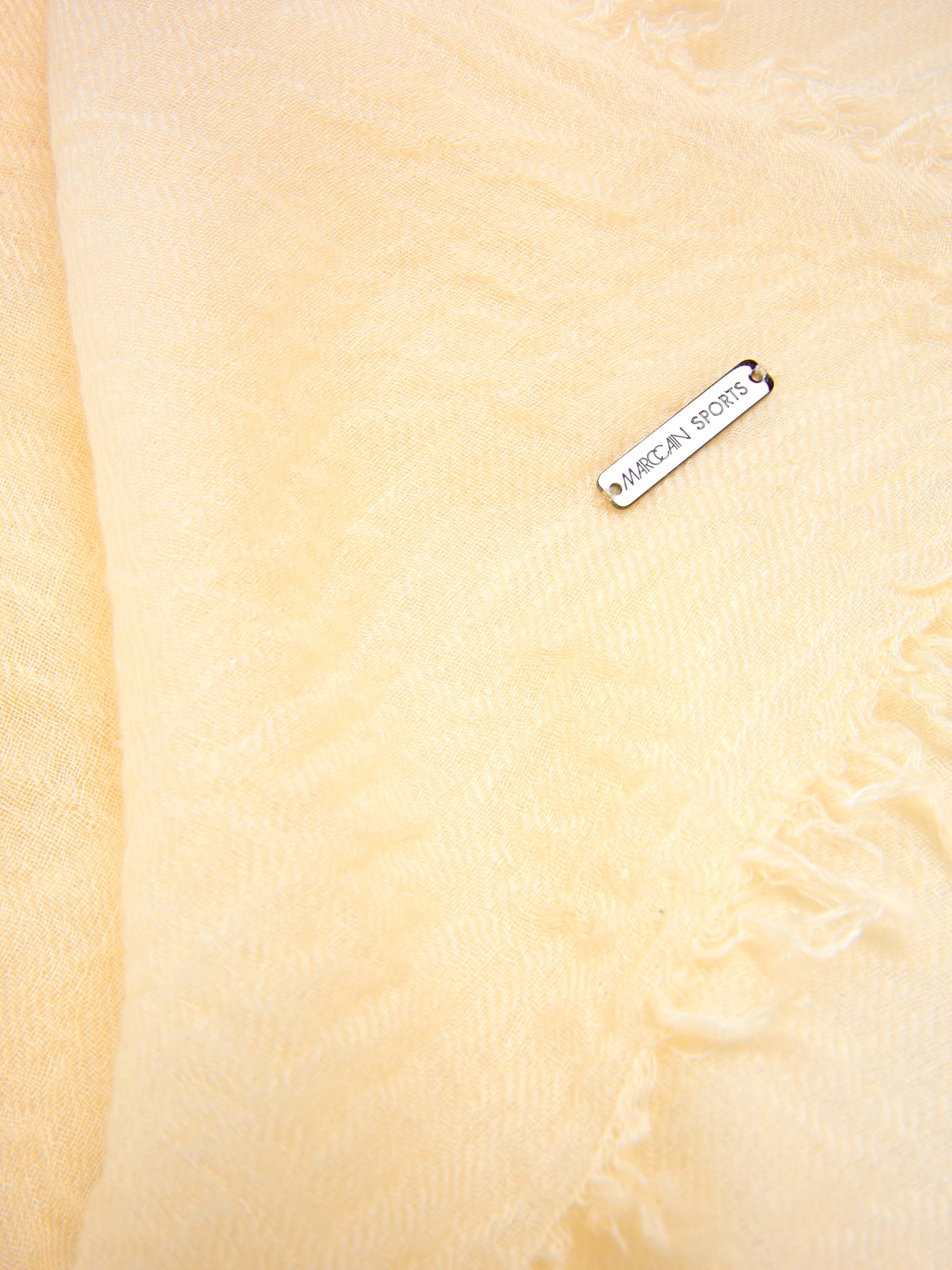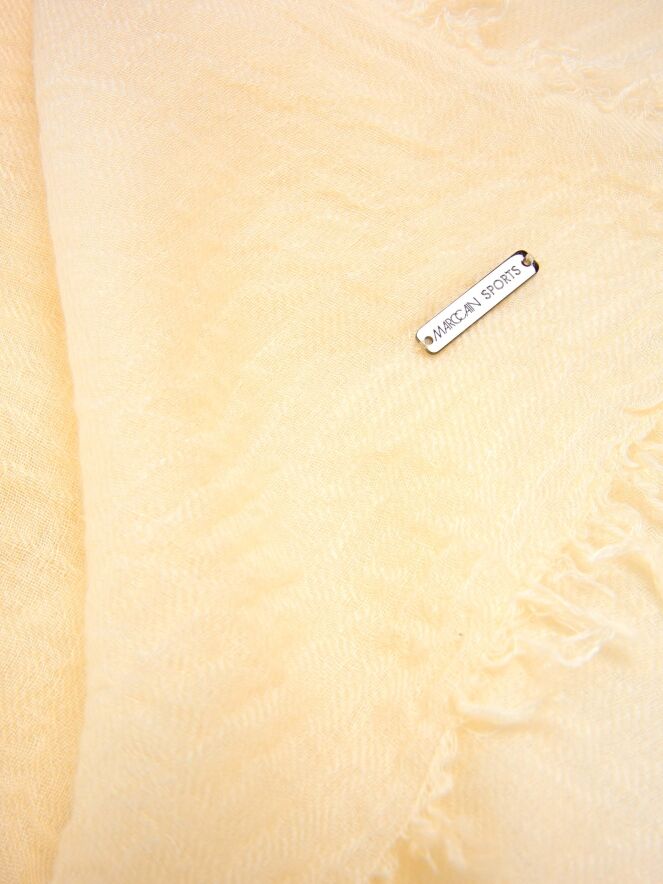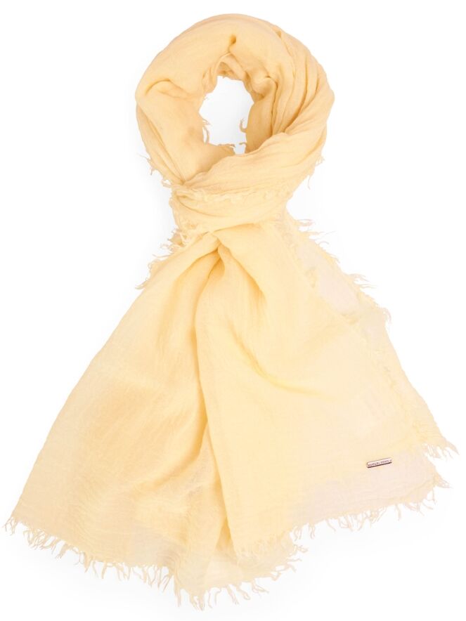 A finely pleated shawl from Marc Cain in pastel yellow. The ends of the shawl are delicately frayed. This shawl can be hand-washed.