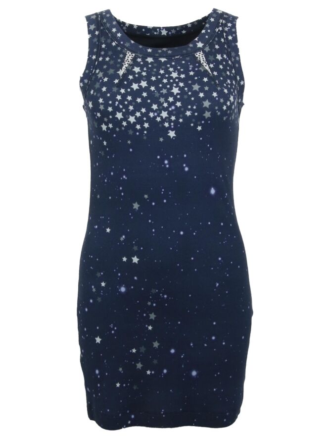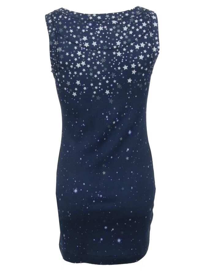 A long top of Marc Cain in a print of the universe with stars in the color blue jeans with multiple shades of gray. This top can be washed at 30 degrees.