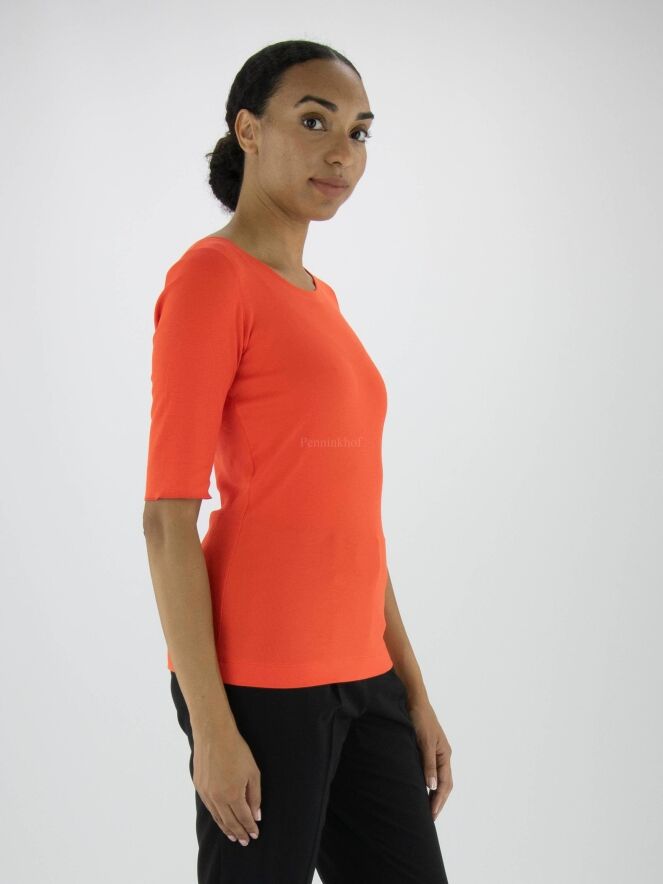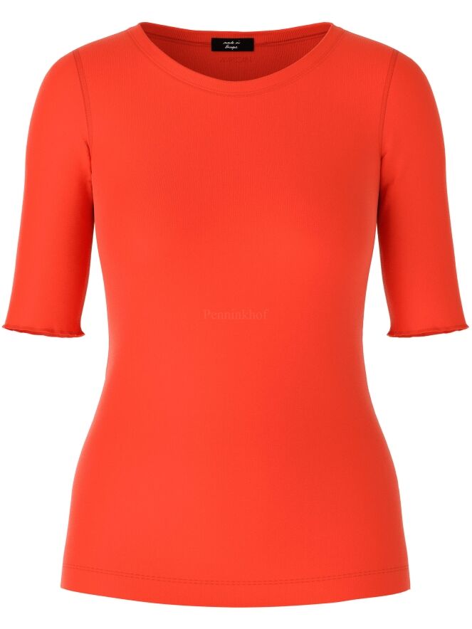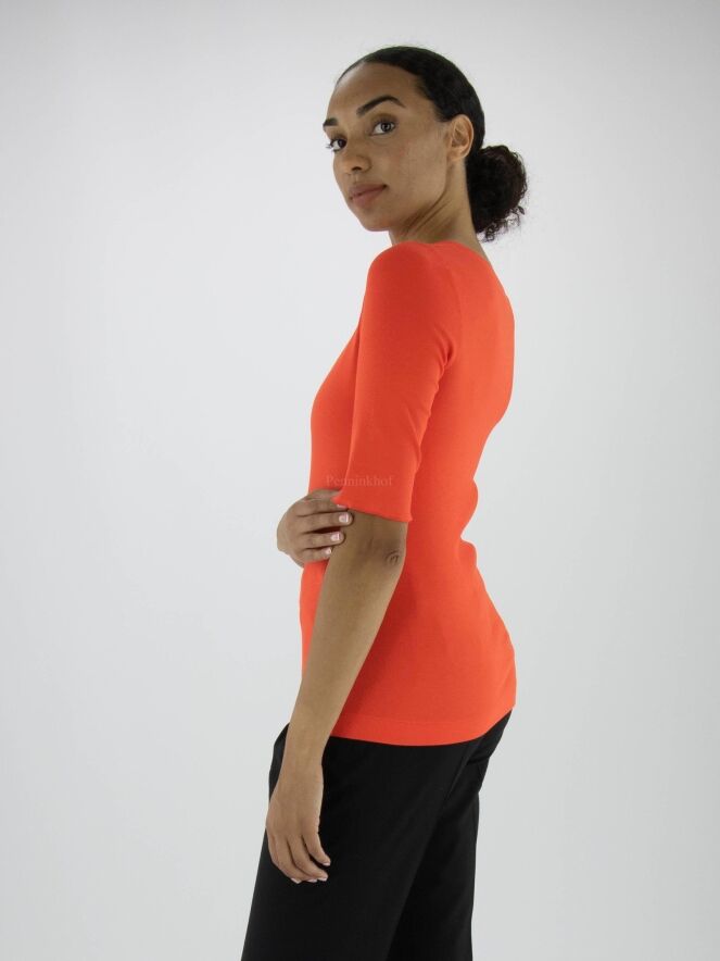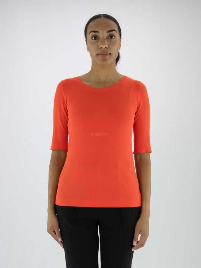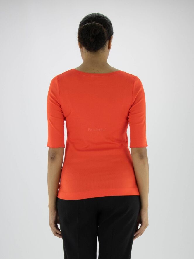A shirt from the brand Marc Cain in the color orange. The shirt has short folded sleeves and a round neckline. This shirt can be washed at 30 degrees.