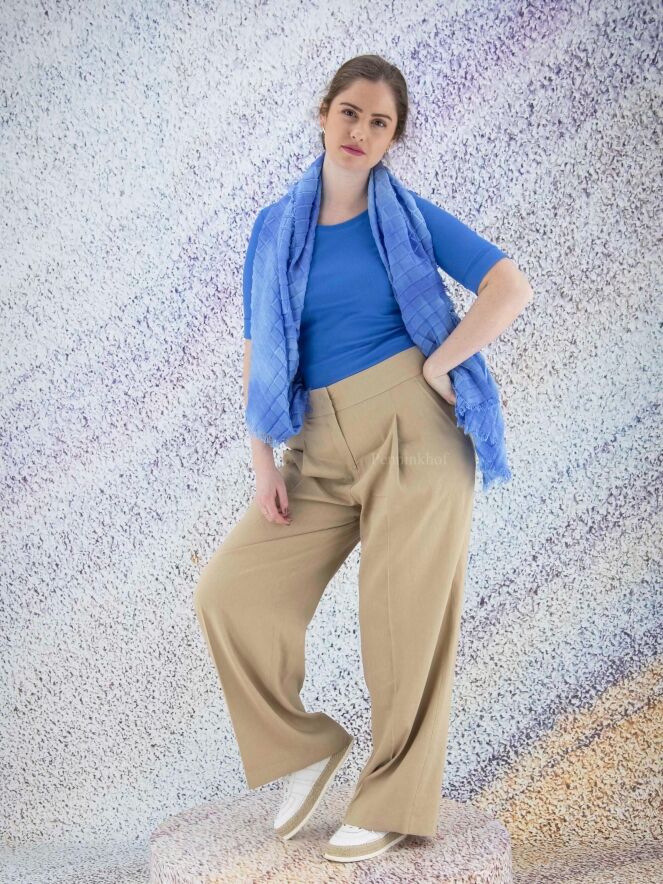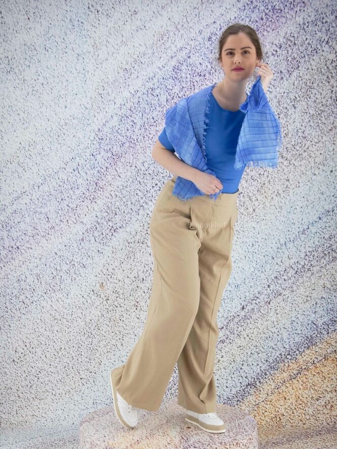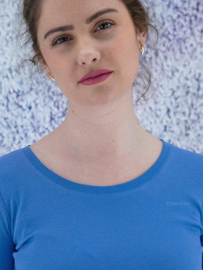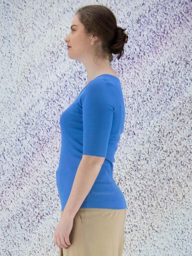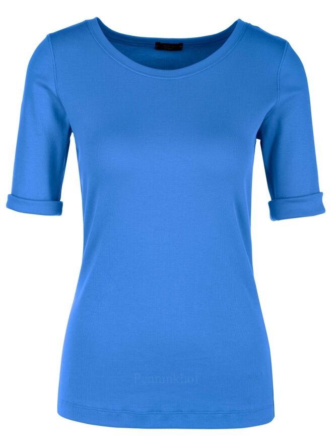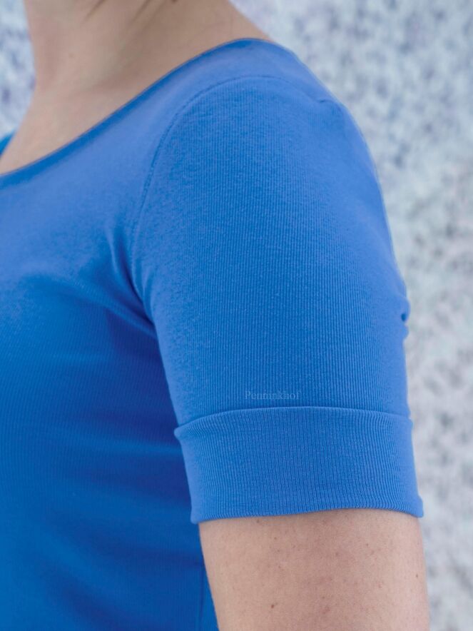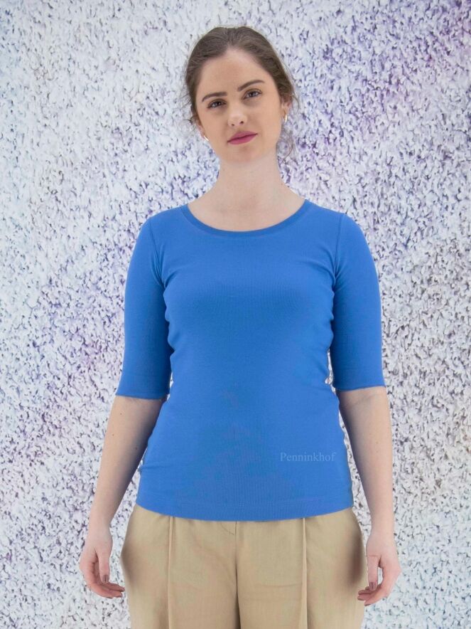 A Marc Cain shirt in the color blue. The shirt has a round neckline and short sleeves with a turn-up. This shirt can be washed at 30 degrees.
