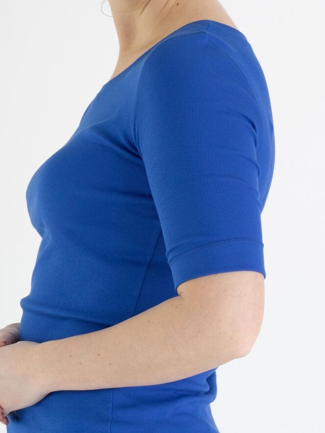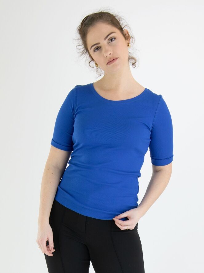 A shirt by Marc Cain in cobalt blue. The short sleeves have a cuff. The shirt has a round neck and can be washed at 30 degrees.