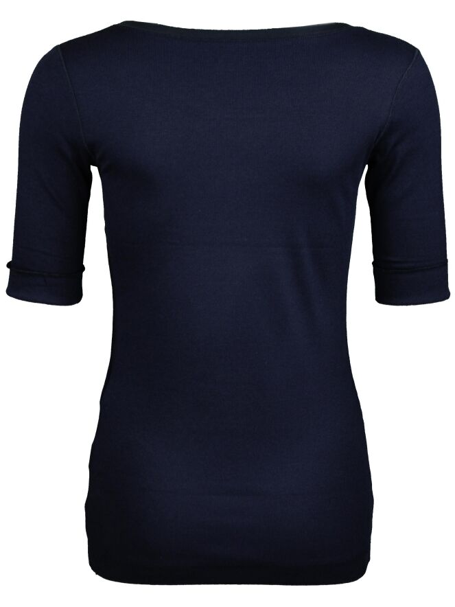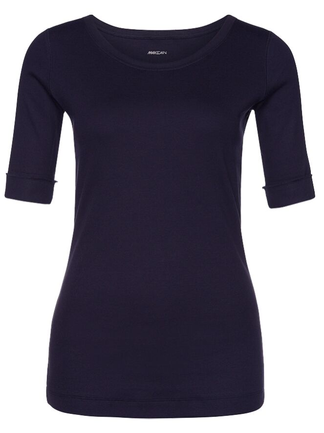 A shirt of the brand Marc Cain Essentiels in the colour navy bleu. The shirt has a round neckline with a band 2 cm wide. The fabric of the shirt has a fine rib pattern. The short sleeves have a folder of 3 cm wide. The shirt can be washed at 30 degrees.
