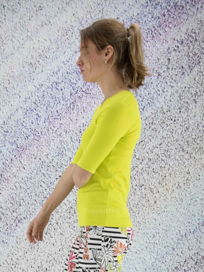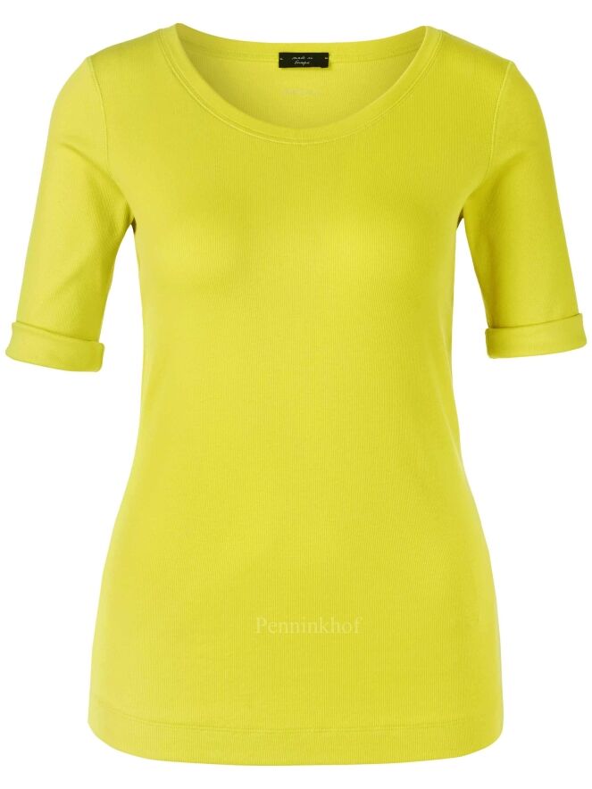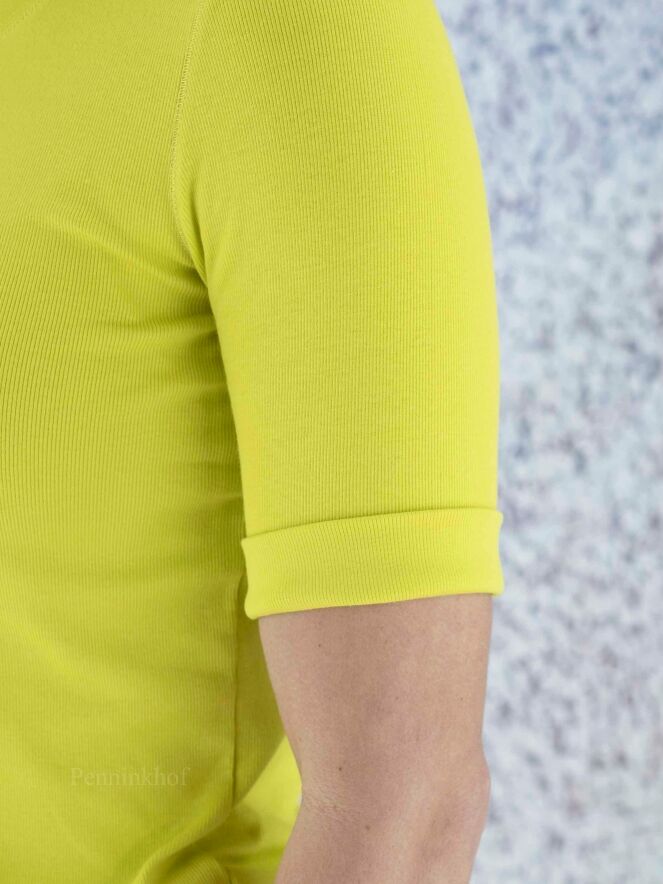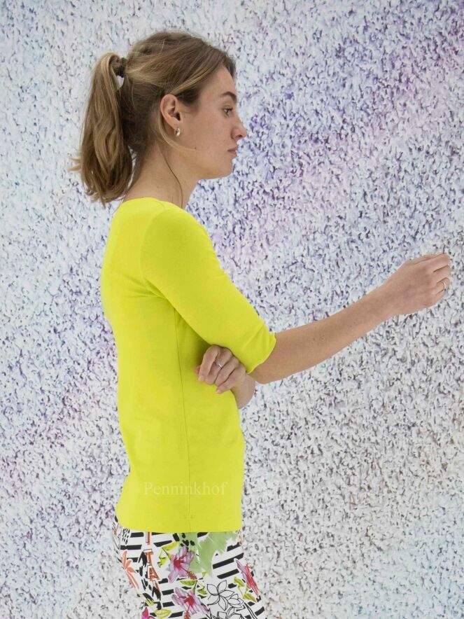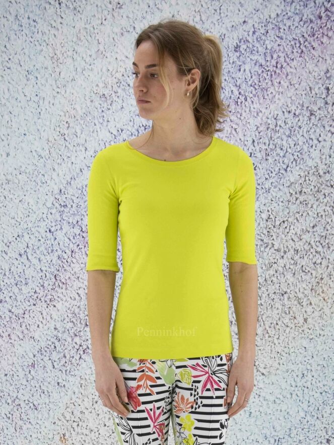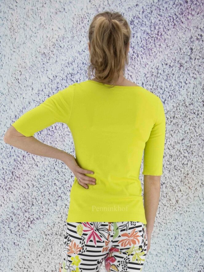 A Marc Cain shirt in the color lime green. The shirt has a round neckline and short sleeves with a turn-up. This shirt can be washed at 30 degrees.