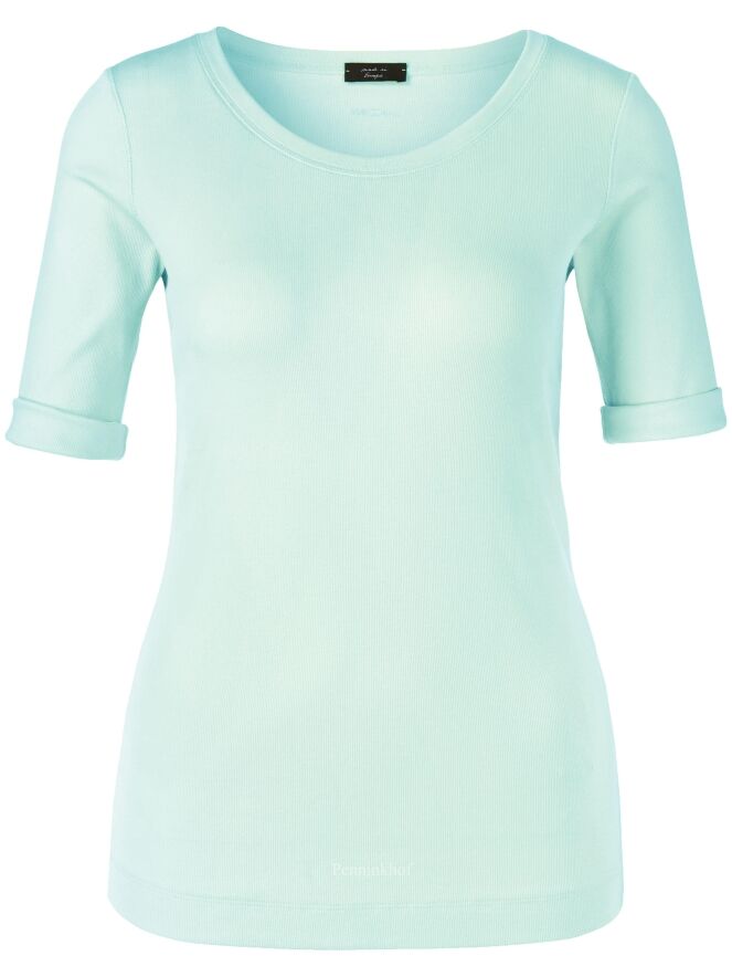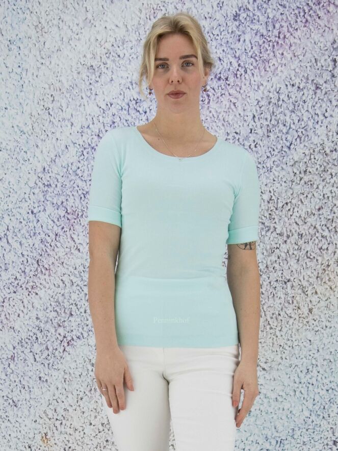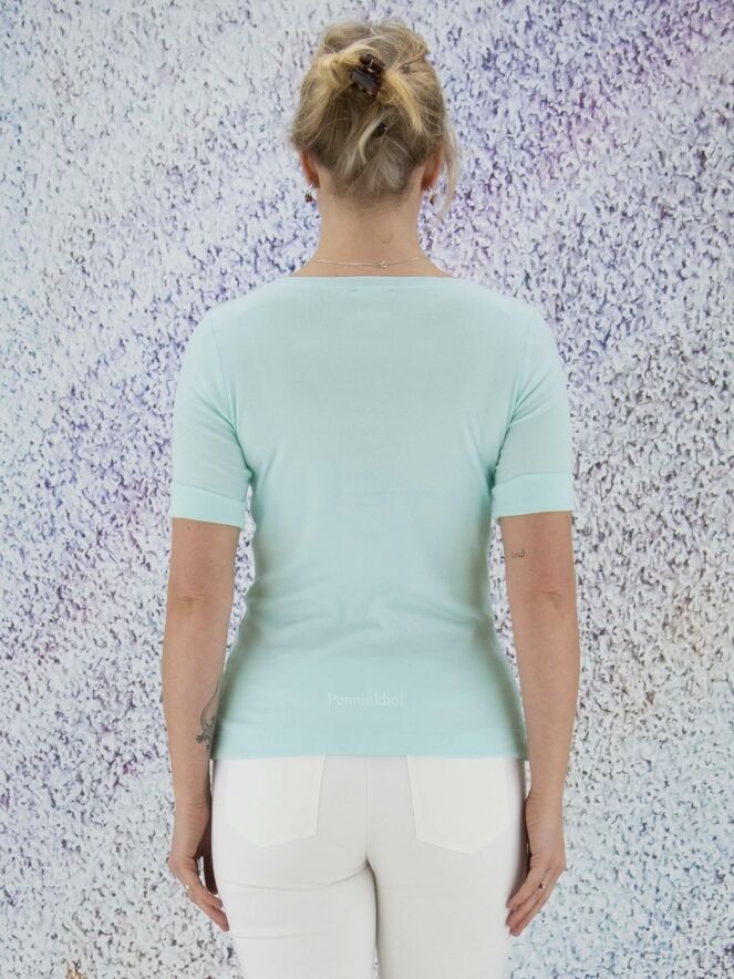 A Marc Cain shirt in the color mint green. The shirt has a round neckline and short sleeves with a turn-up. This shirt can be washed at 430 degrees.