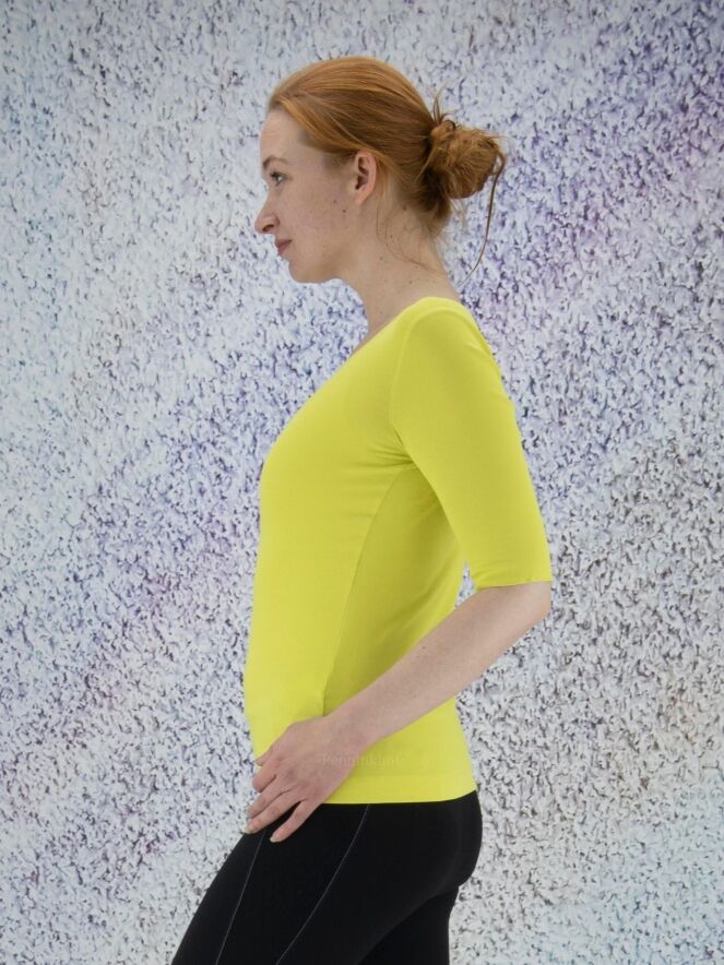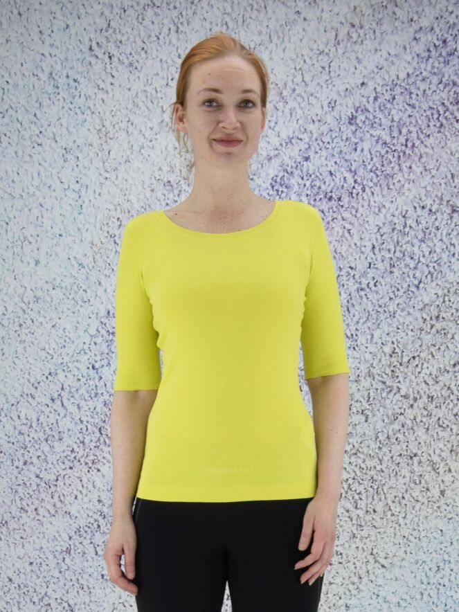 A Marc Cain shirt in a finely ribbed fabric in the color lime yellow. The shirt has a round neckline and the short sleeves have a turn-up. This shirt can be washed at 30 degrees.