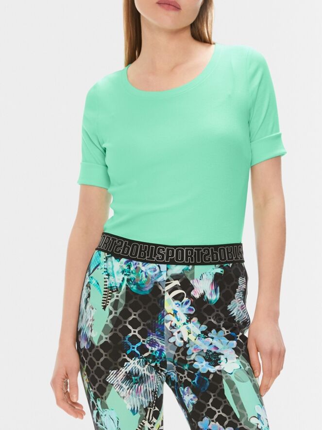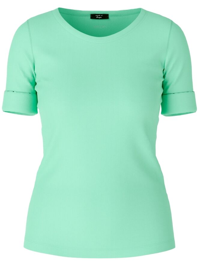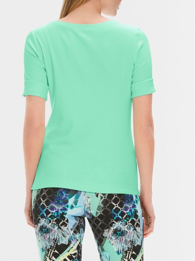 A shirt from Marc Cain in a light lime green color. The short sleeves feature a cuff. The shirt has a round neckline and can be washed at 30 degrees.