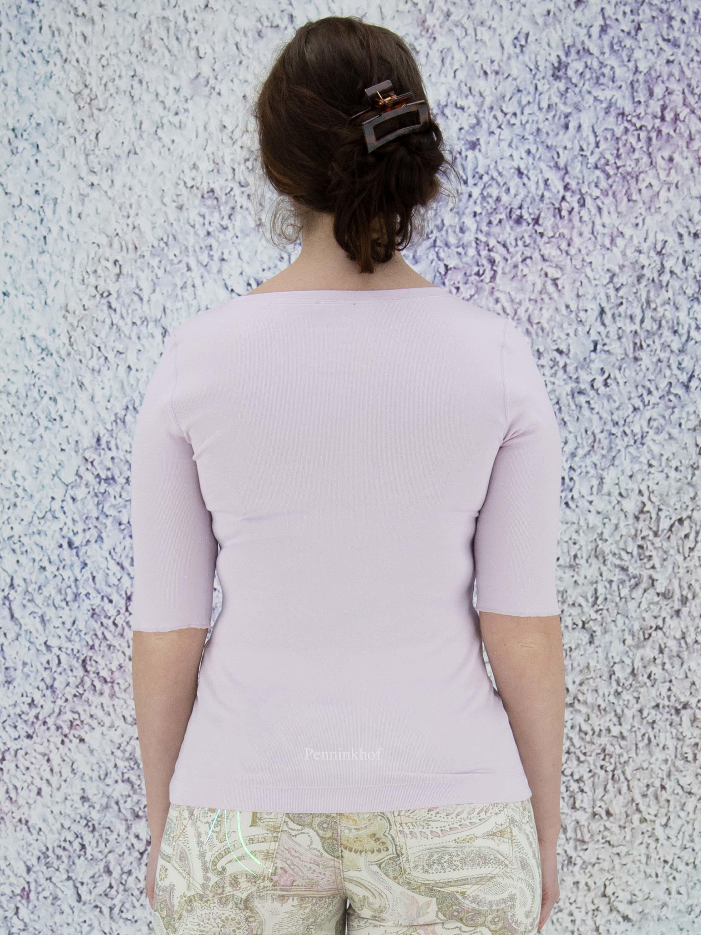A Marc Cain shirt in the color pastel pink. The shirt has a round neckline and short sleeves with a turn-up. This shirt can be washed at 30 degrees.