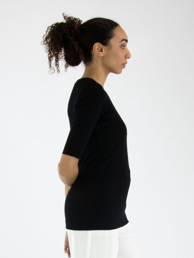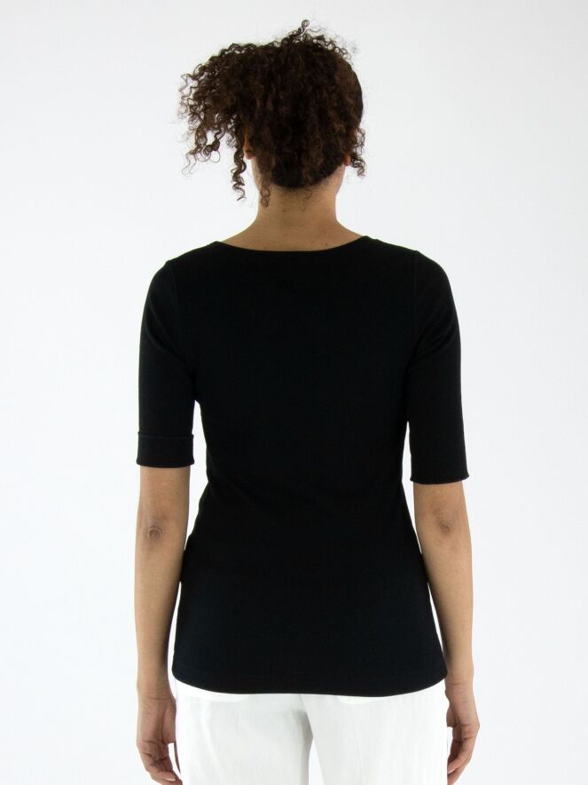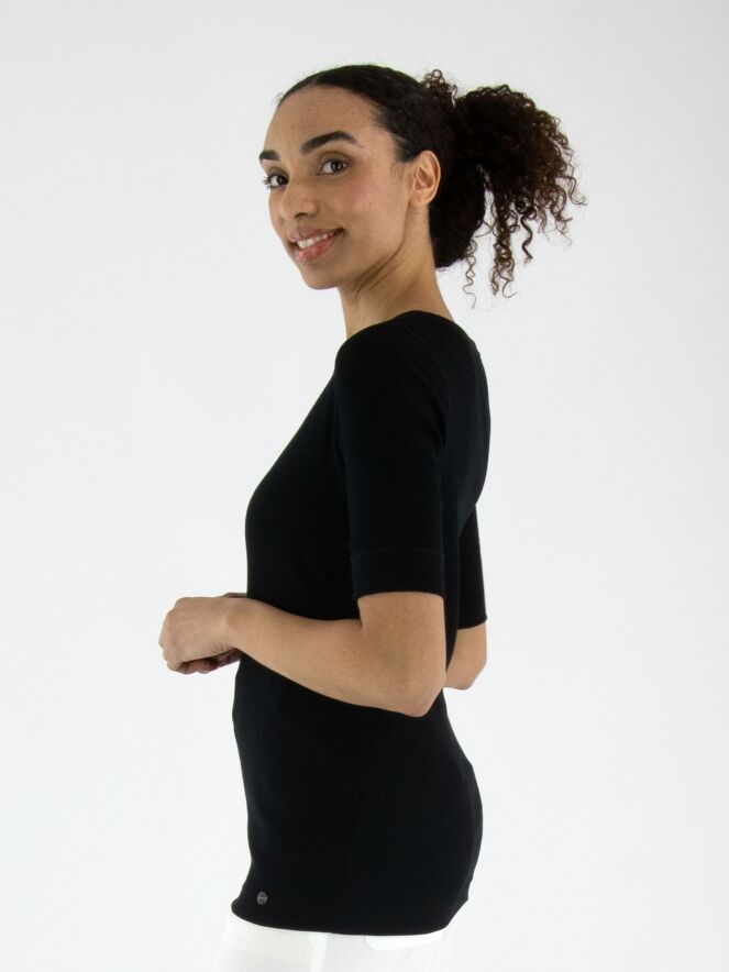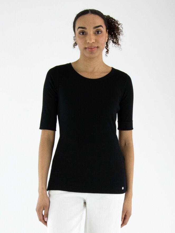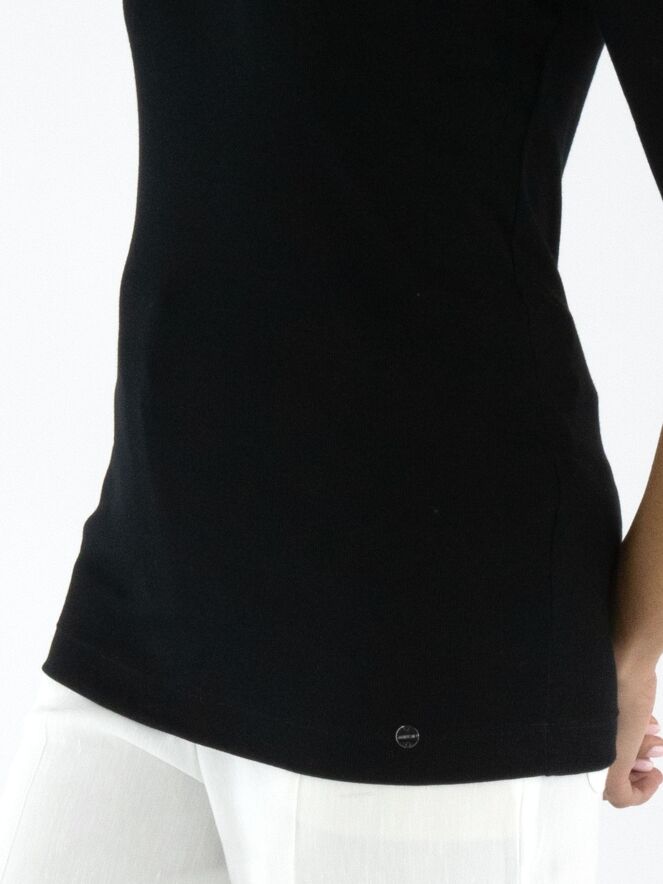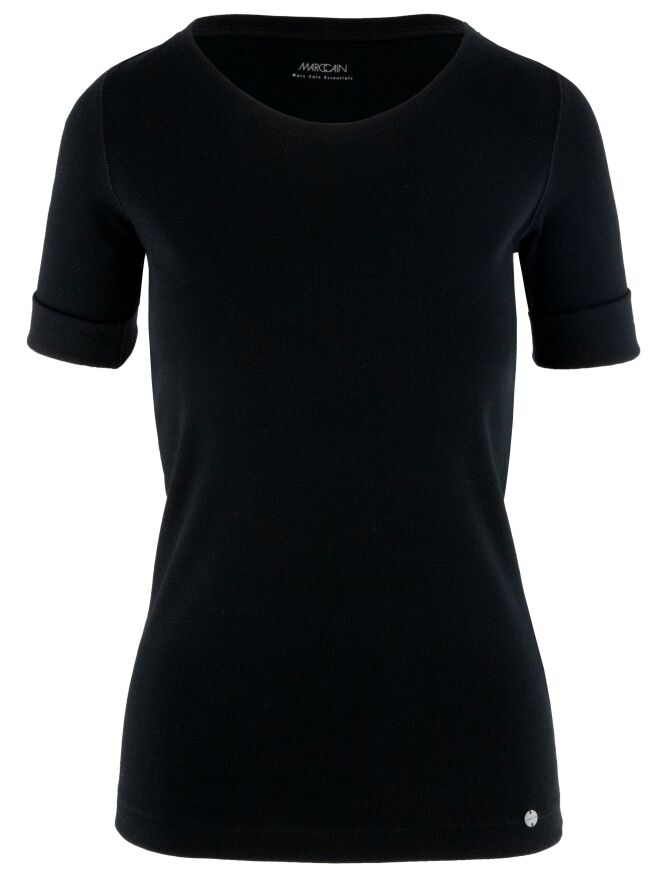 A shirt by Marc Cain in black. The short sleeves have a turned-up cuff. The shirt features a round neckline and can be washed at 30 degrees.