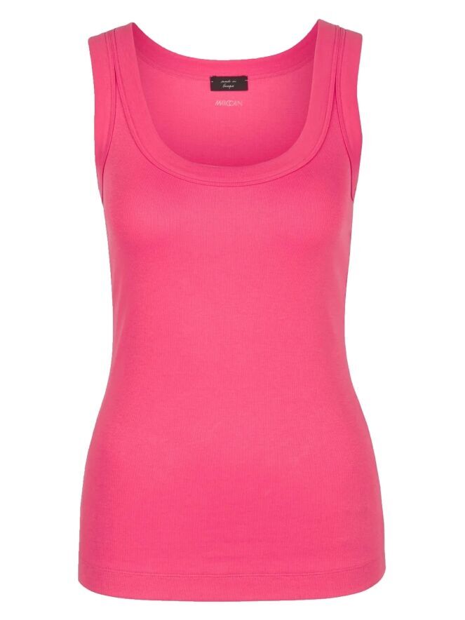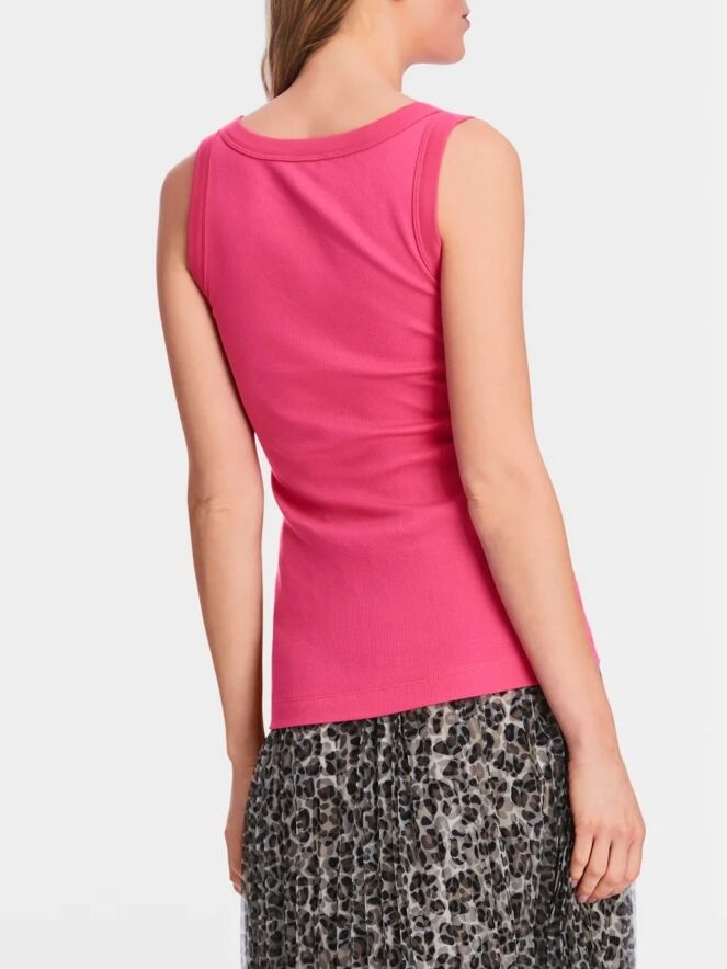 A top from Marc Cain in pink. The top has a round neckline and the fabric is finely ribbed. This top can be washed at 30 degrees.