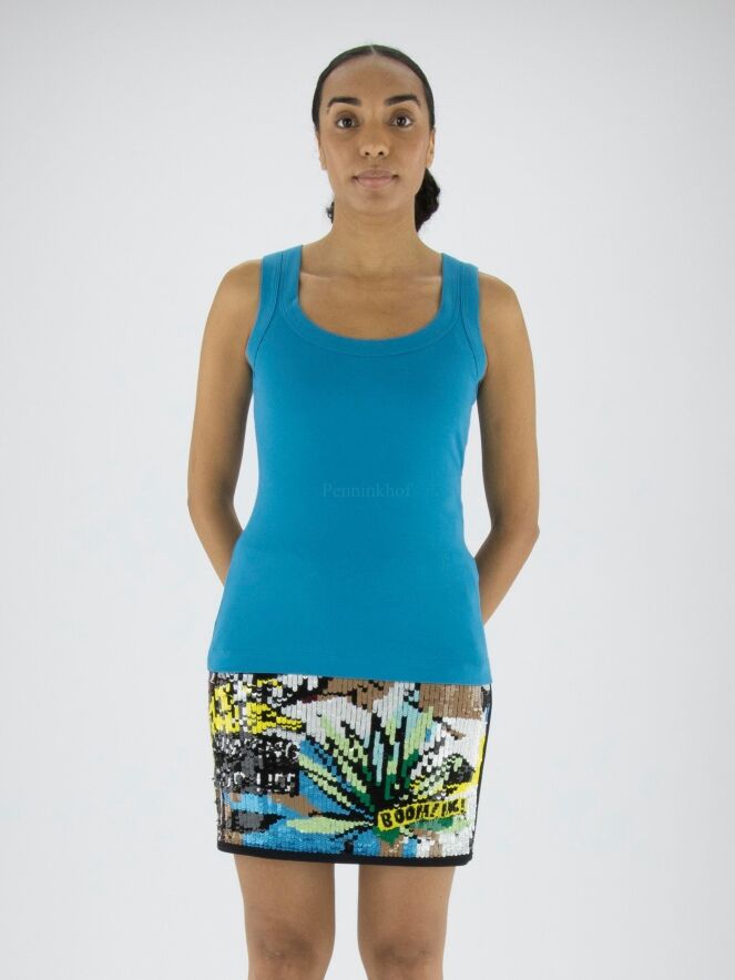 A top from Marc Cain in the colour blue. The top has a round neckline and the fabric is finely ribbed. This top may be washed at 30 degrees.