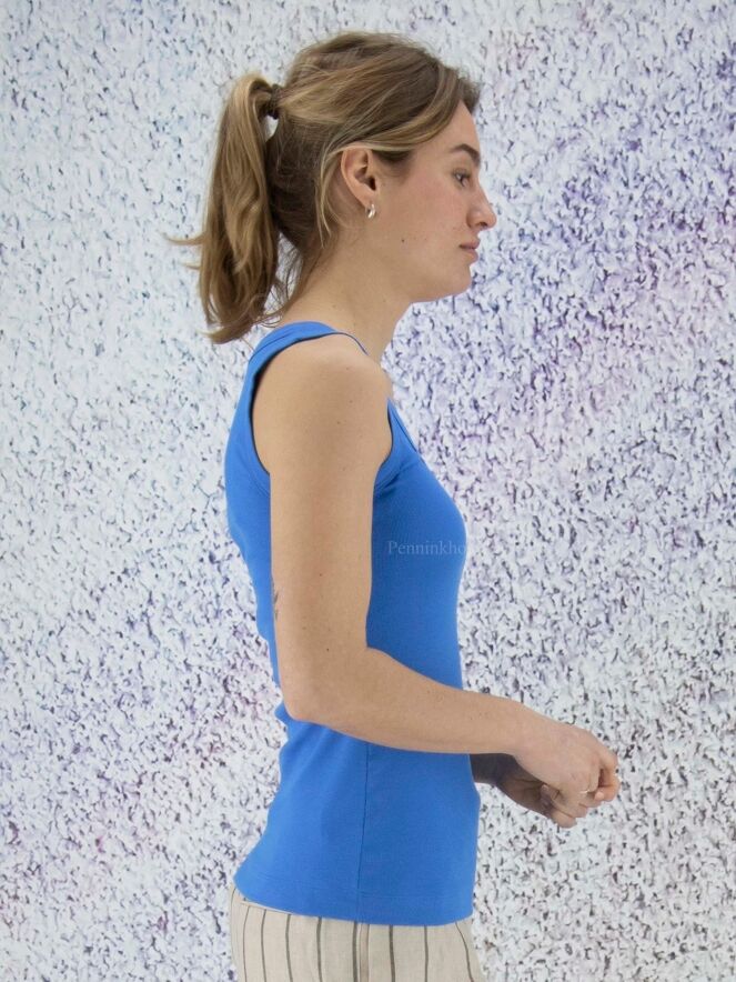 A Marc Cain top in a blue color. The top has a round neck and can be washed at 30 degrees.