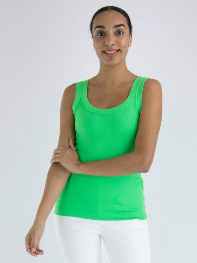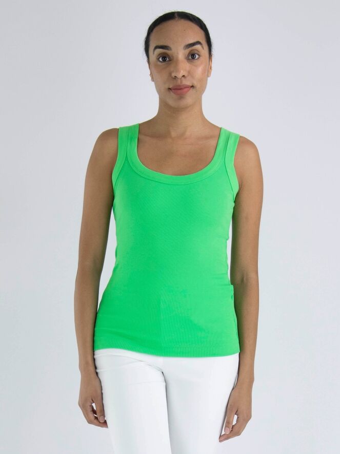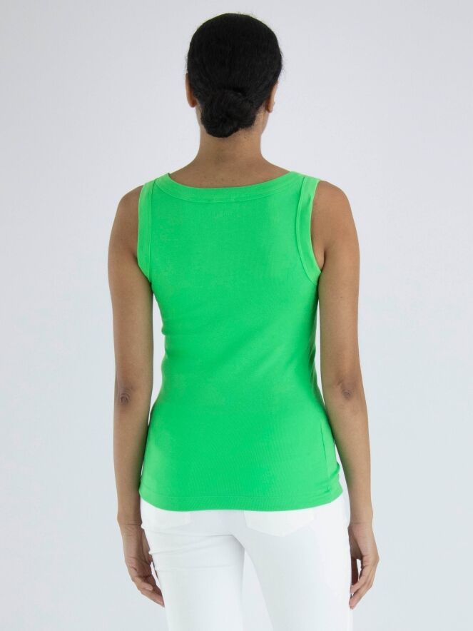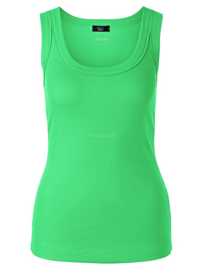 A top by Marc Cain in light green. The top has a round neck and the fabric is finely ribbed. This top can be washed at 30 degrees.