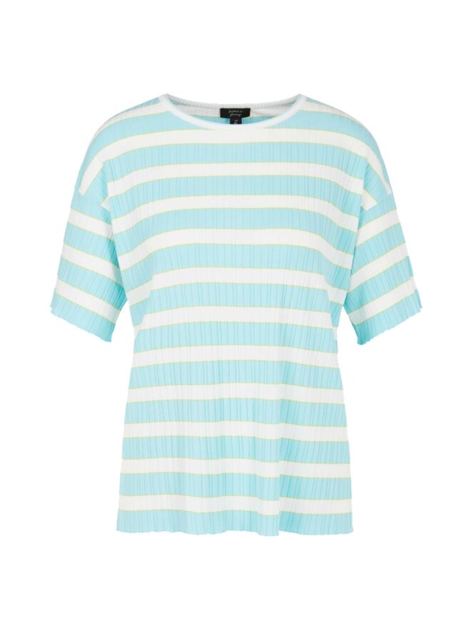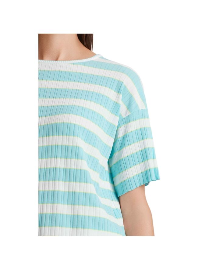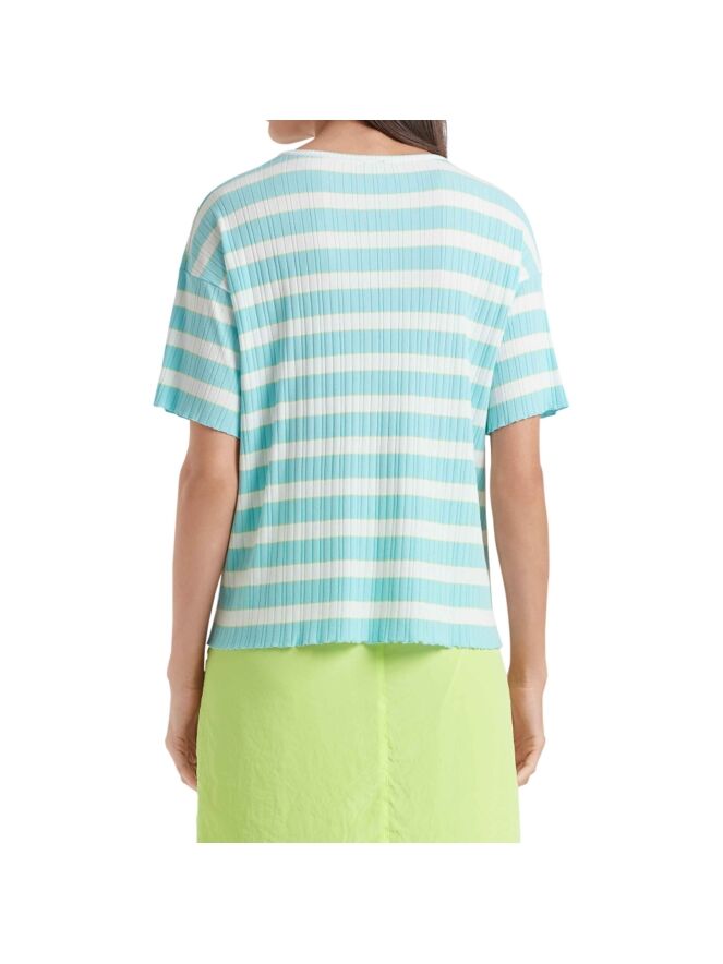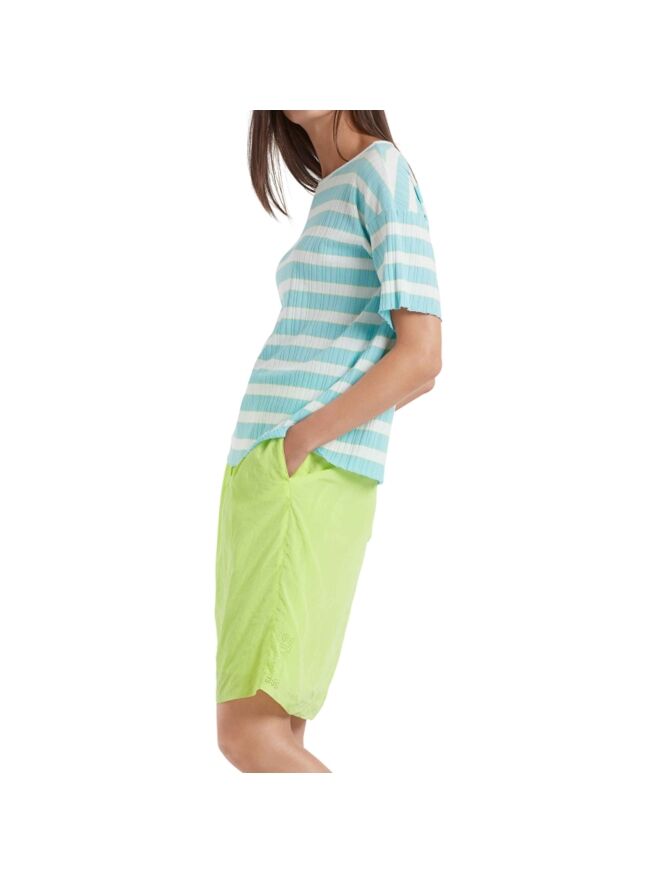A pullover from Marc Cain in a striped pattern with the colors ice blue, lime green and white. A vertical stripe pattern is woven into the fabric. Along the edge of the round neck is a piping in the color lime green. This pullover can be washed at 30 degrees.