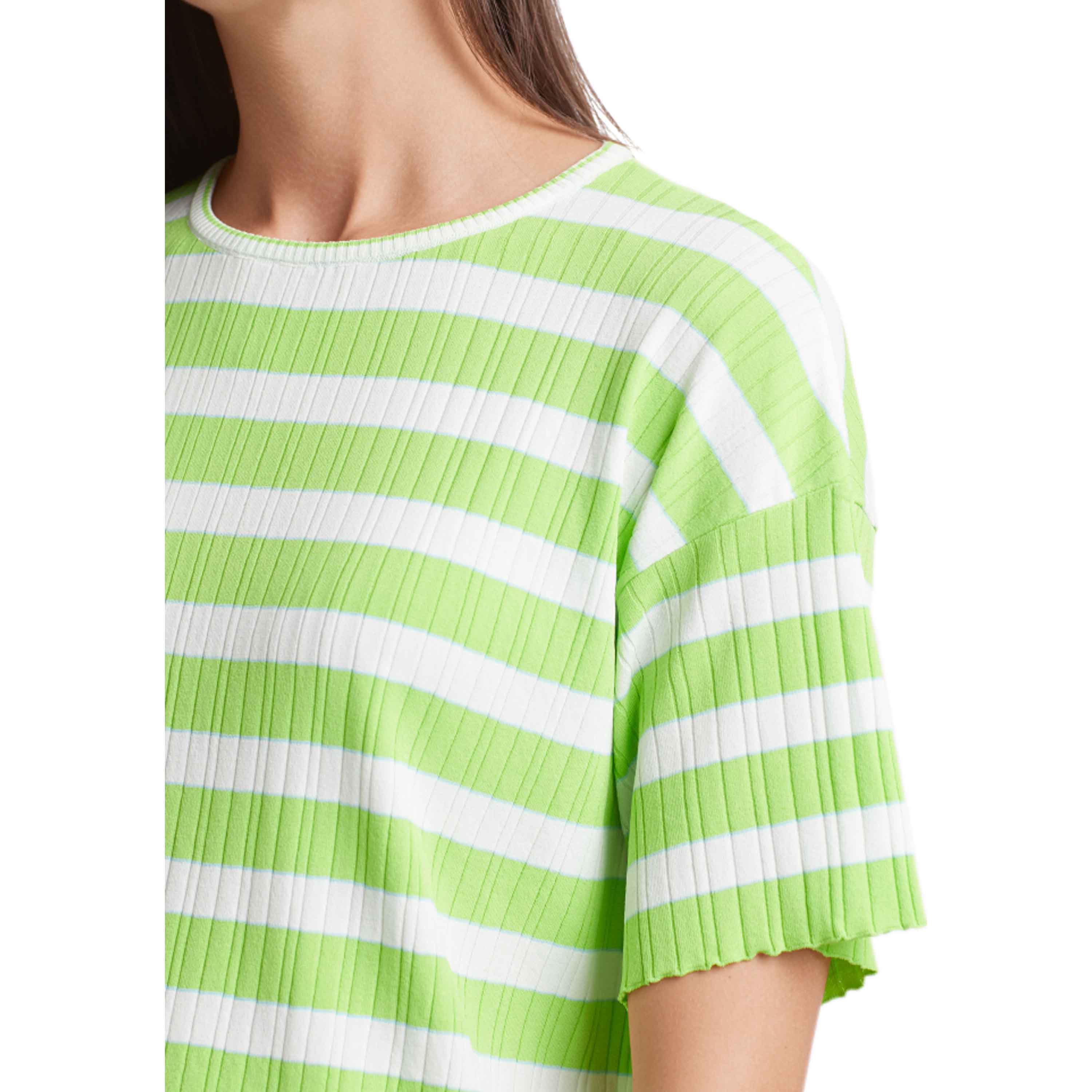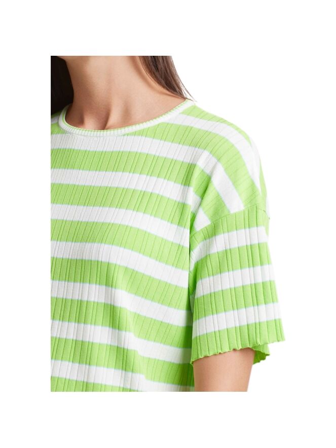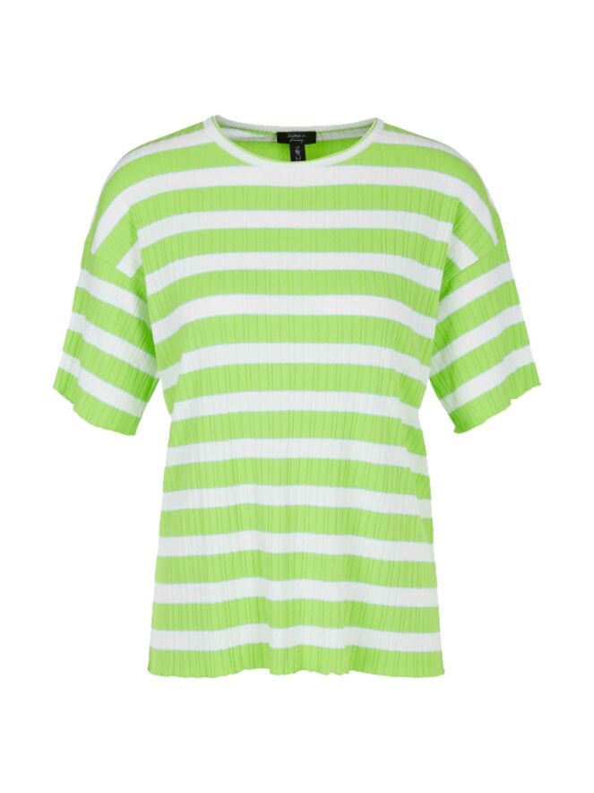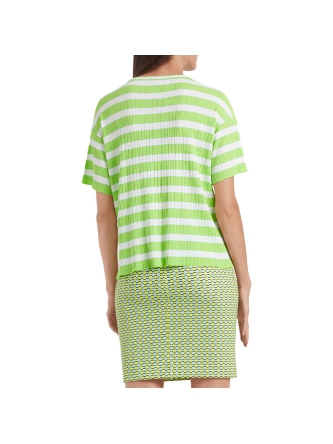 A pullover from Marc Cain in a striped pattern with the colors lime green, ice blue and white. A vertical stripe pattern is woven into the fabric. Along the edge of the round neck is a piping in the color white with lime green. This pullover can be washed at 30 degrees.