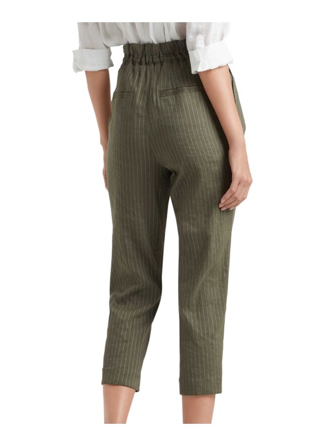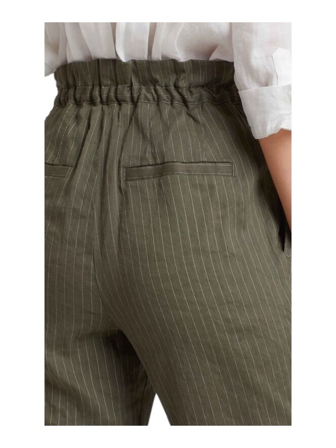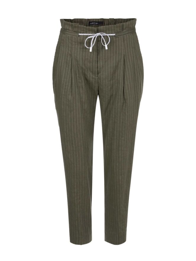 Marc Pain pants in a pinstripe with the colors olive green and white. There are several pleats in the waistband and a cord processing. The pants have side pockets and can be washed at 30 degrees.