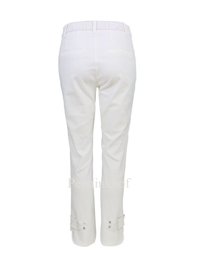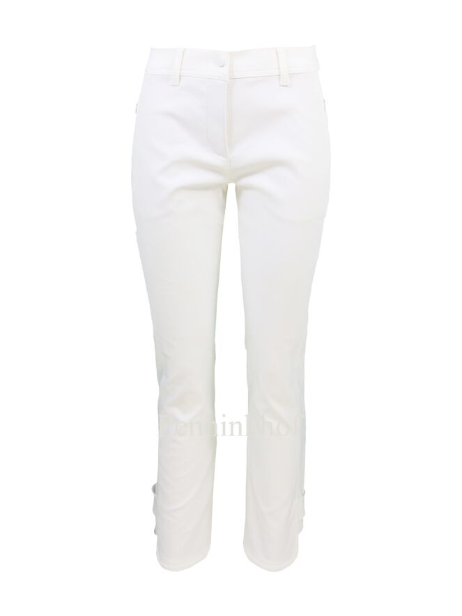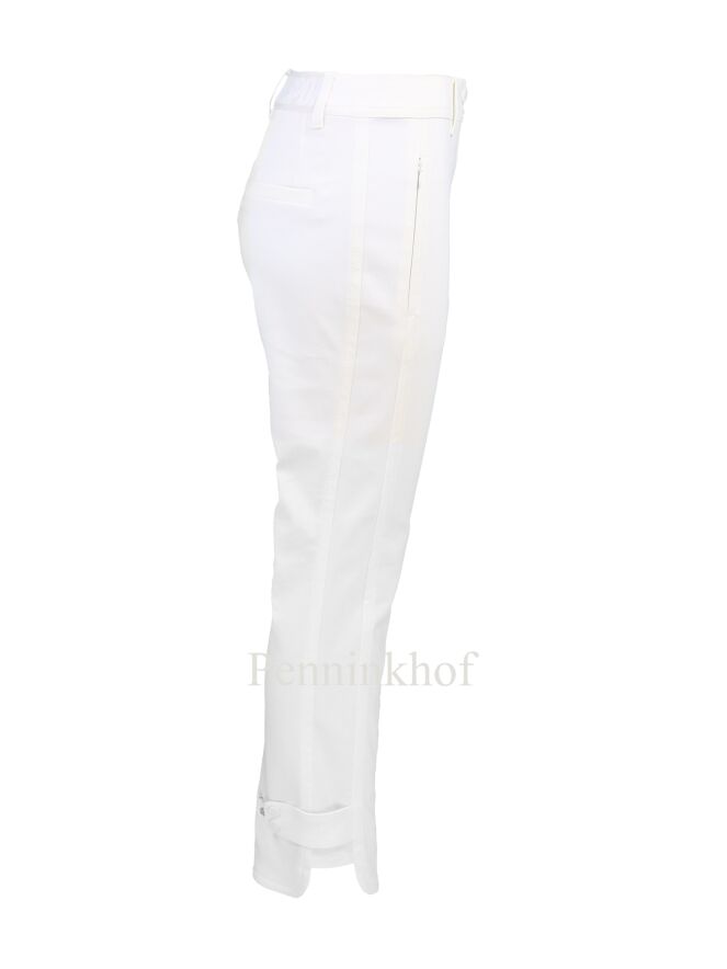 Marc Cain pants in creamy white. The side pockets have a zipper. At the bottom of the legs on the outside is a wide short trim that is adjustable with press studs. The edge at the bottom is cut round. These pants can be washed at 30 degrees.