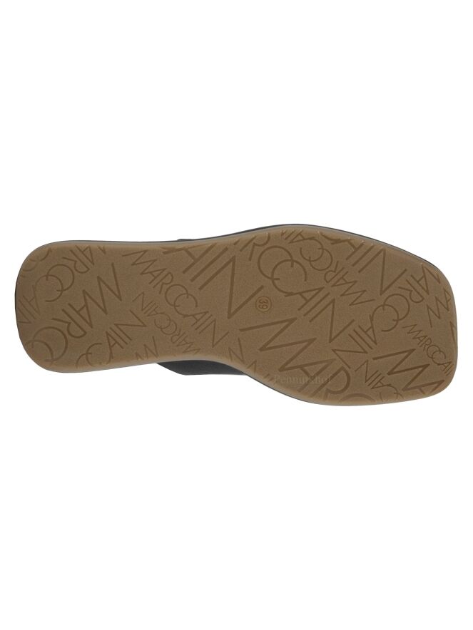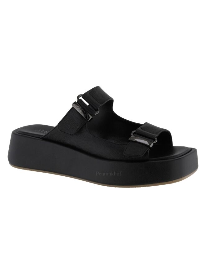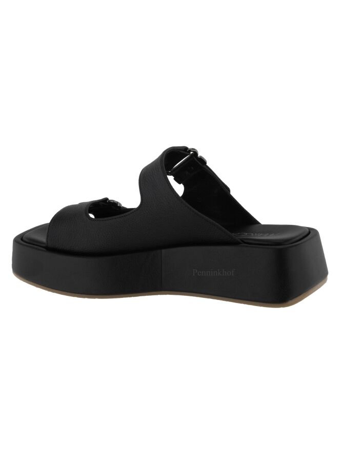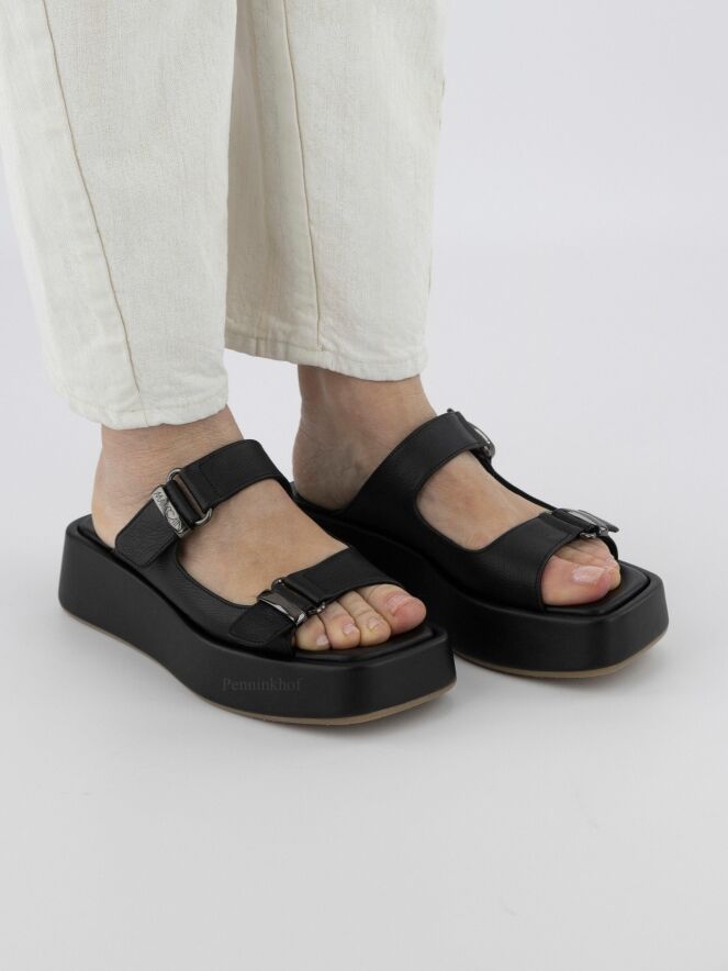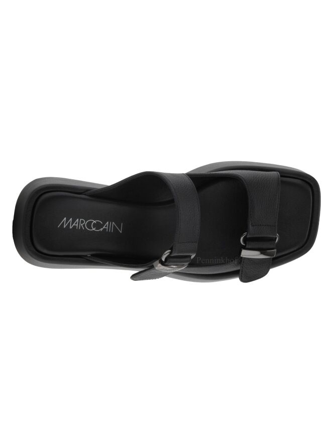 A sandal by Marc Cain in the color black. The sandal has nickel-colored 2 buckles. The platform sole with a square toe is covered with leather.
