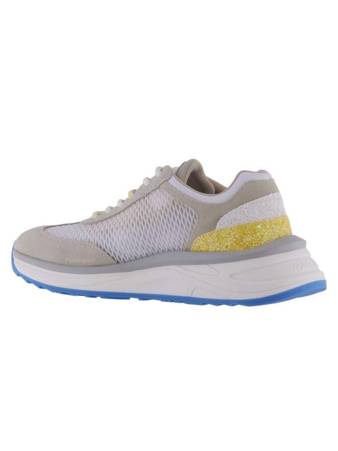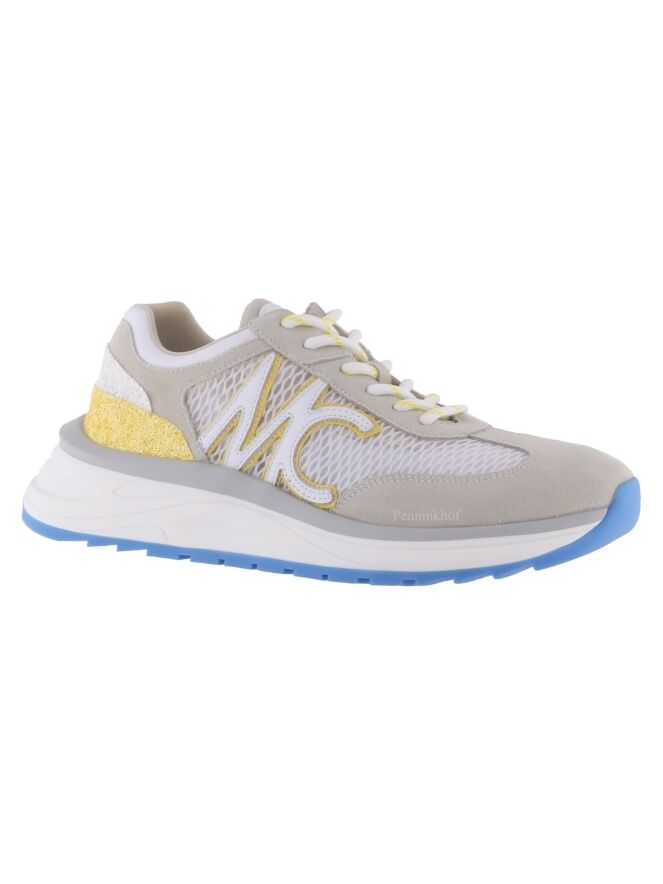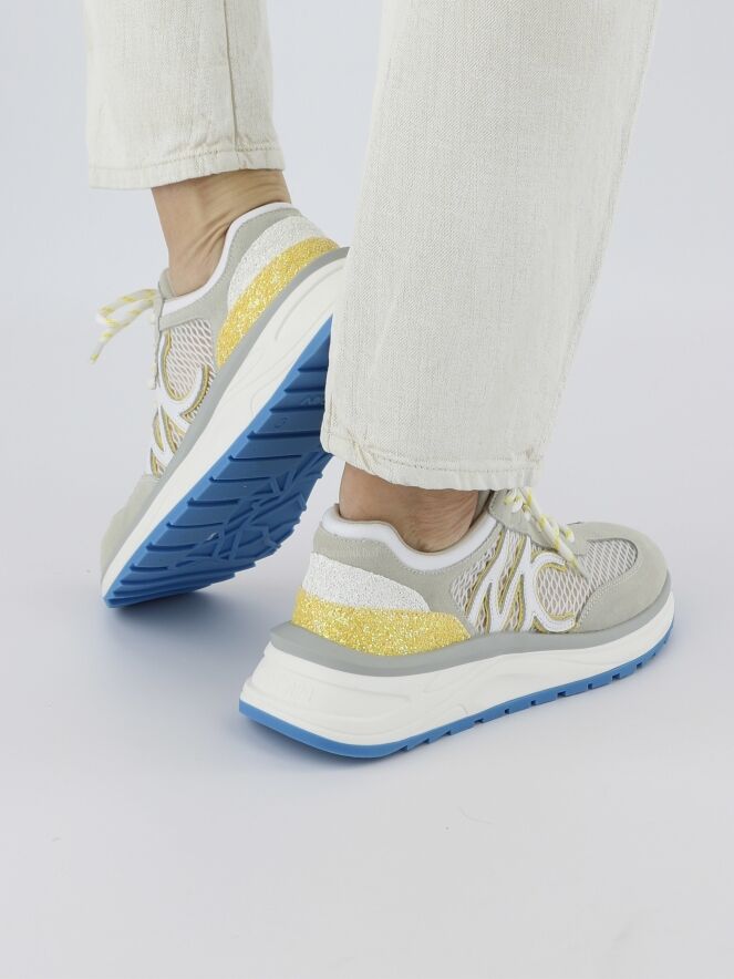 A Marc Cain sneaker in the colors yellow and blue on a white background. Both Sides are in a perforated net structure with the letters MC on the outside. There are rhinestones on the heel. The sole is in the color white with a narrow blue-colored layer at the bottom. The insole is removable