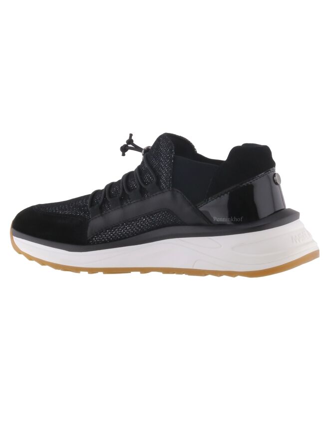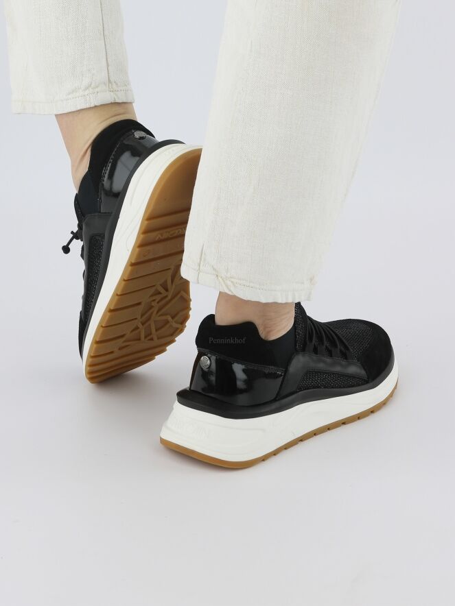 A sneaker from Marc Cain in the color black. Both Sides and the forefoot are in a perforated mesh structure. The sides of the shaft are in an elastic fabric. across the forefoot is a decorative diagonal cord that can be tightened. The heel is in black patent leather. The insole is removable. The sneaker is more than half a size larger than the size indicates.