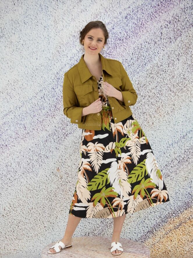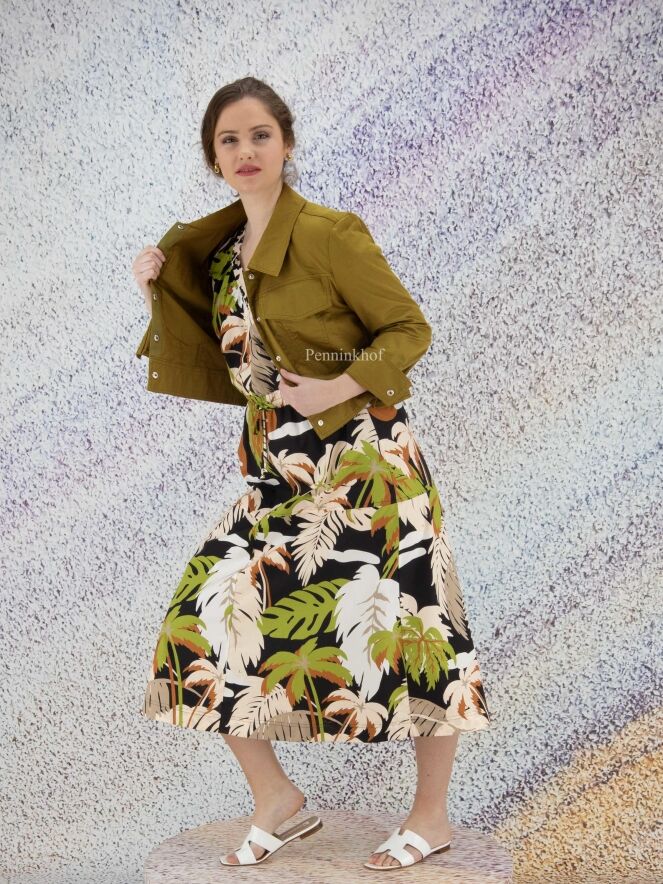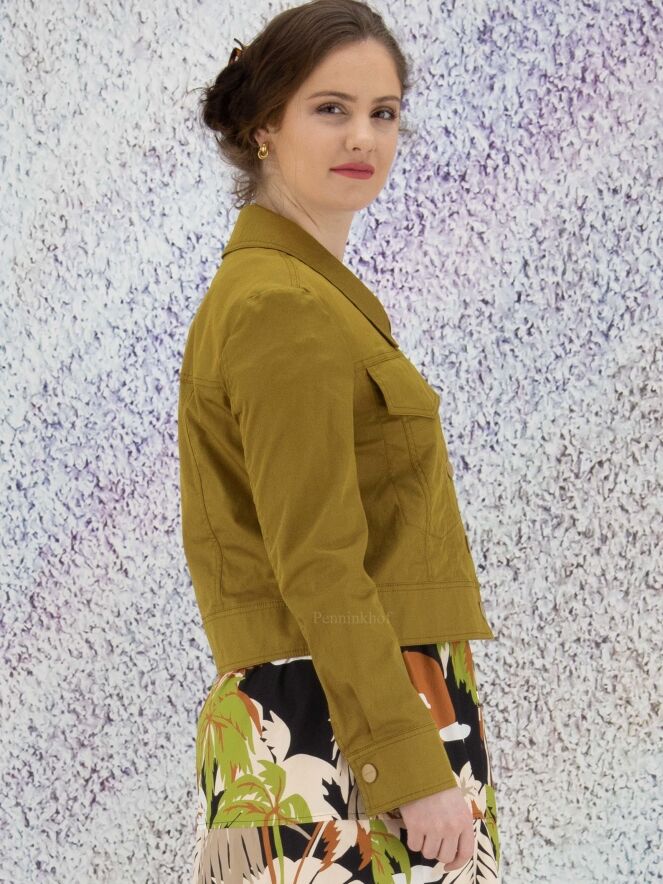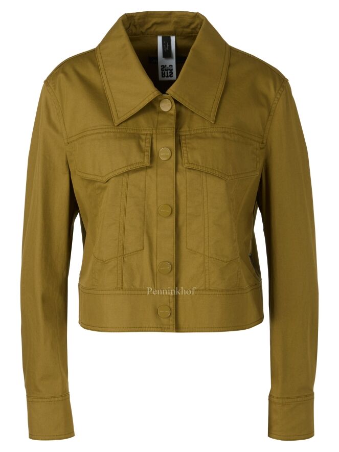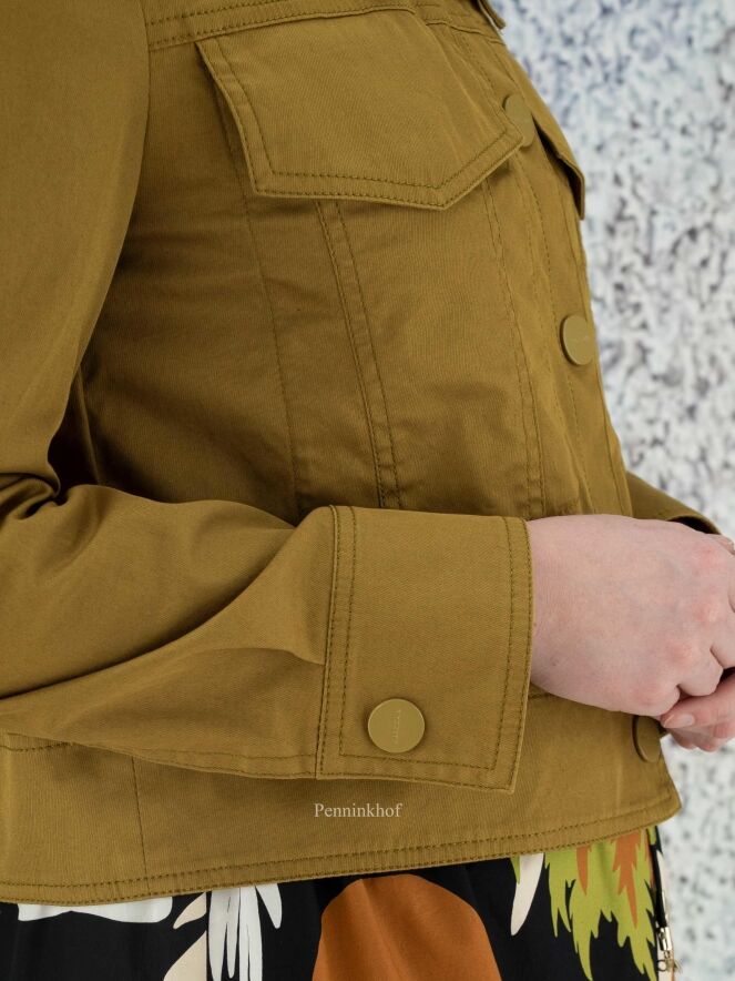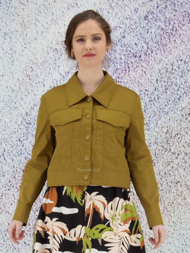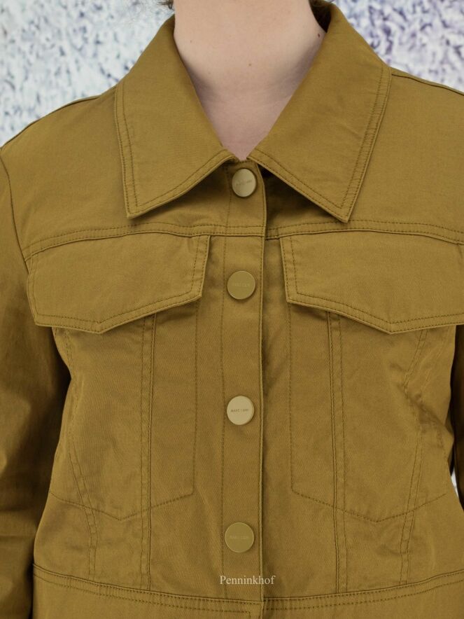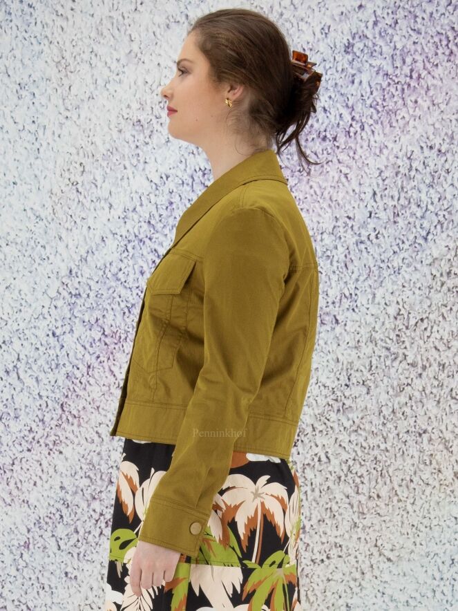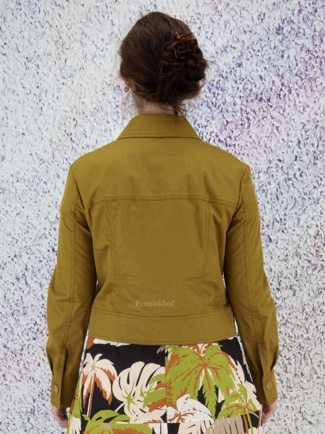 A short blazer from Marc Cain in an olive green color. The blazer has a large collar and a closure with 5 press studs. This blazer can be washed at 30 degrees.
