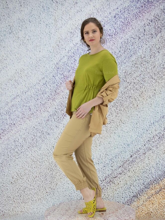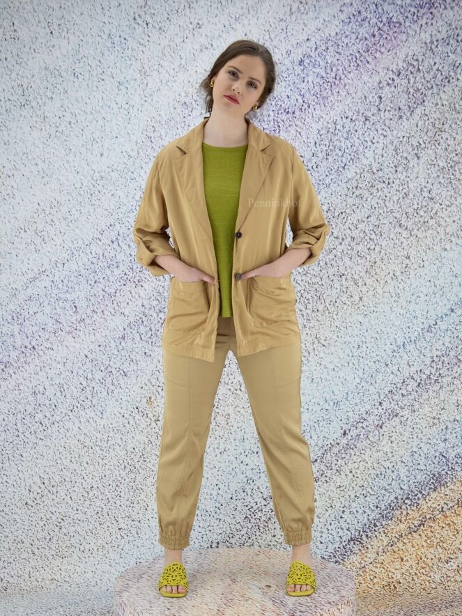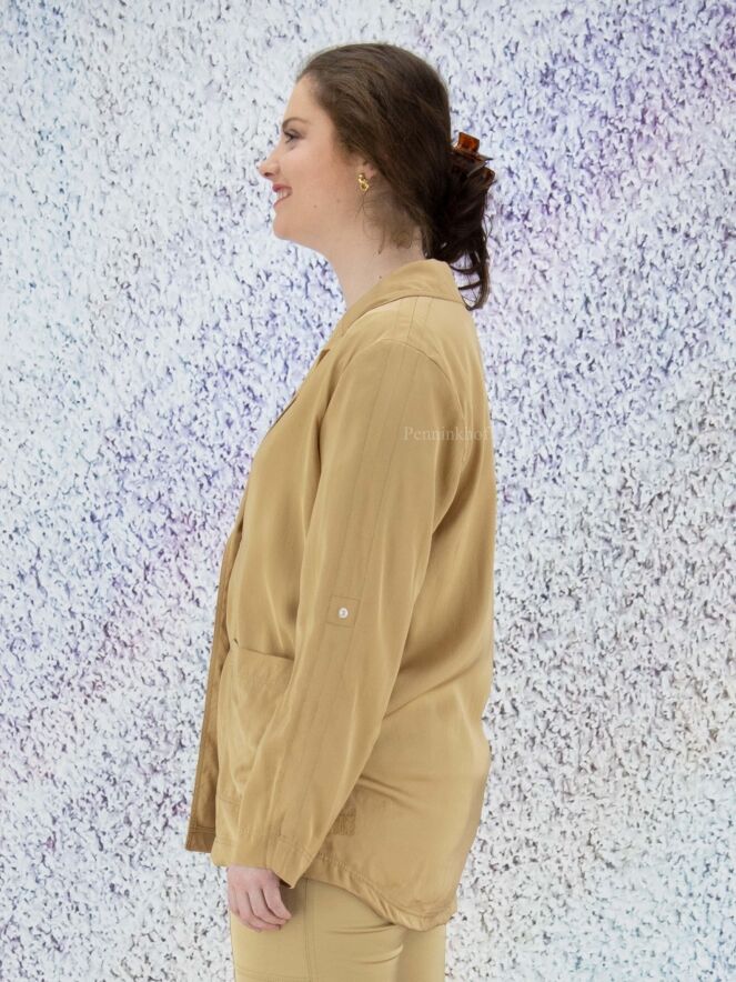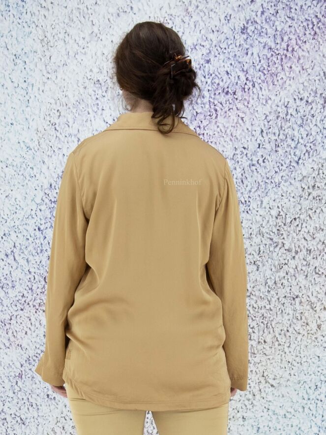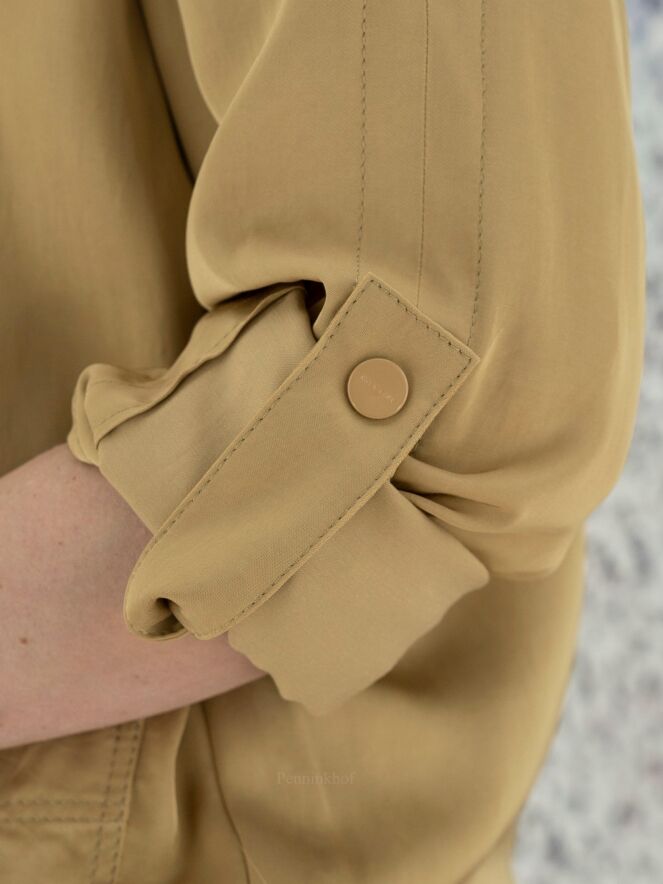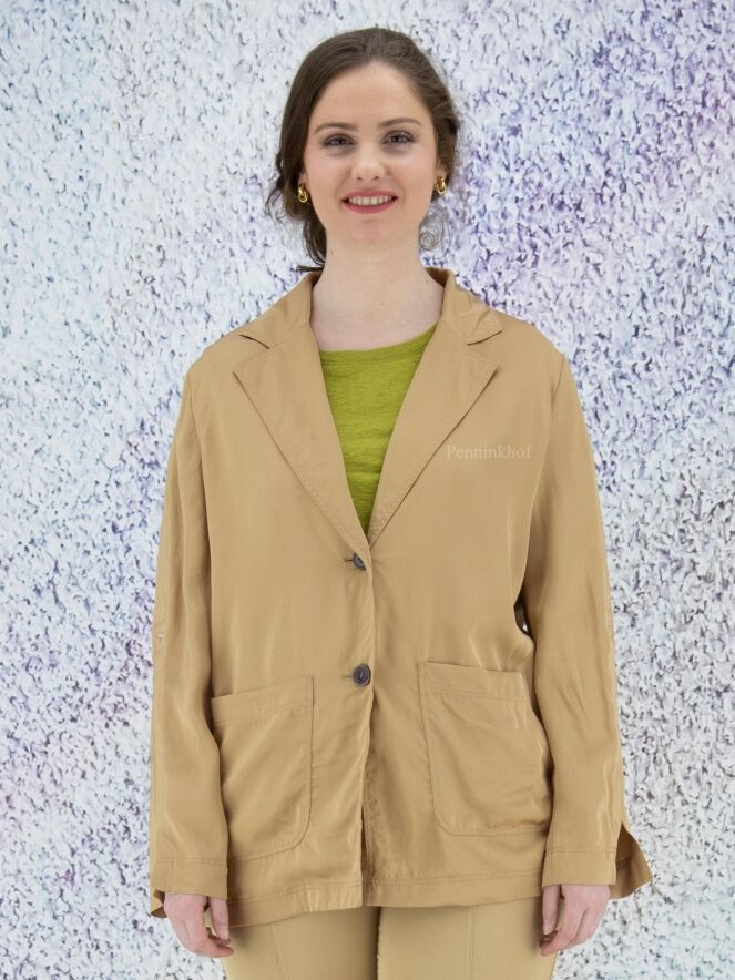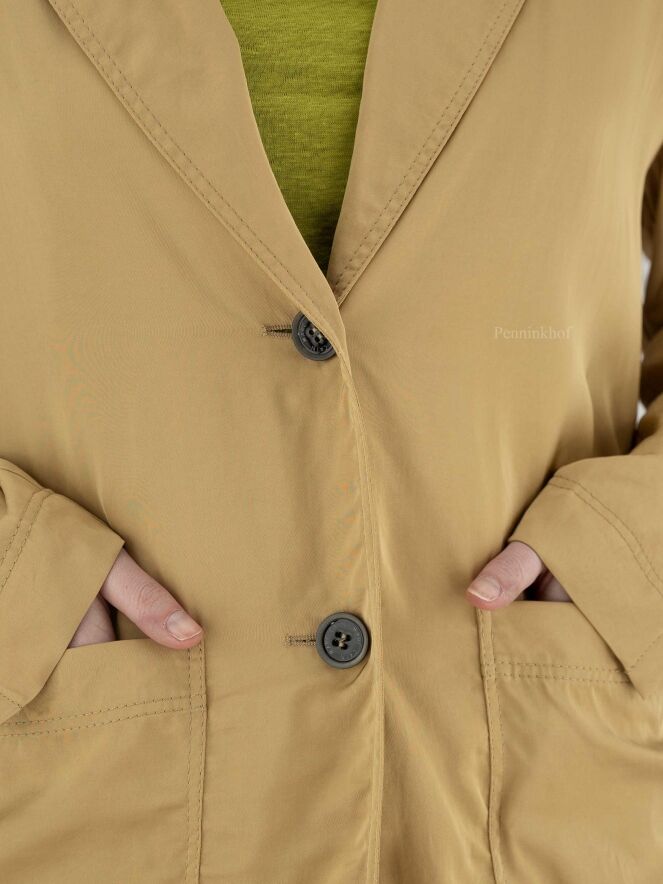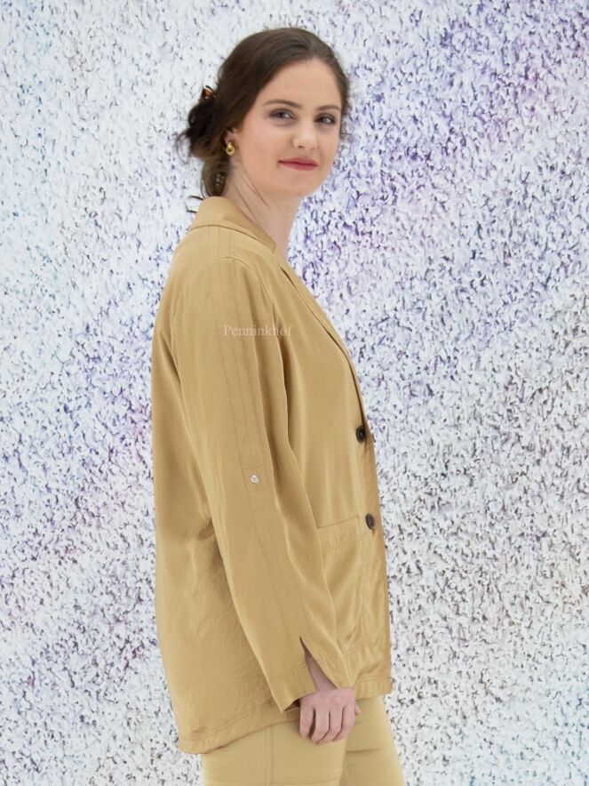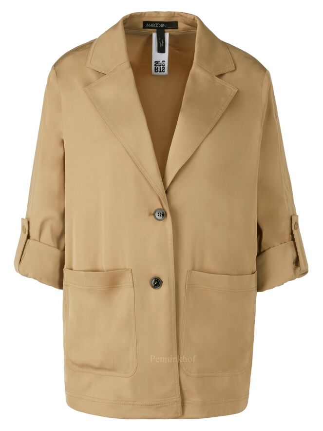 A blazer by Marc Cain in a matte shiny fabric in the color taupe. The blazer has a 2 button closure. In the sleeves is a ribbon with a press stud that can be used to secure a turned-up sleeve. The blazer is unlined and can be washed by hand.