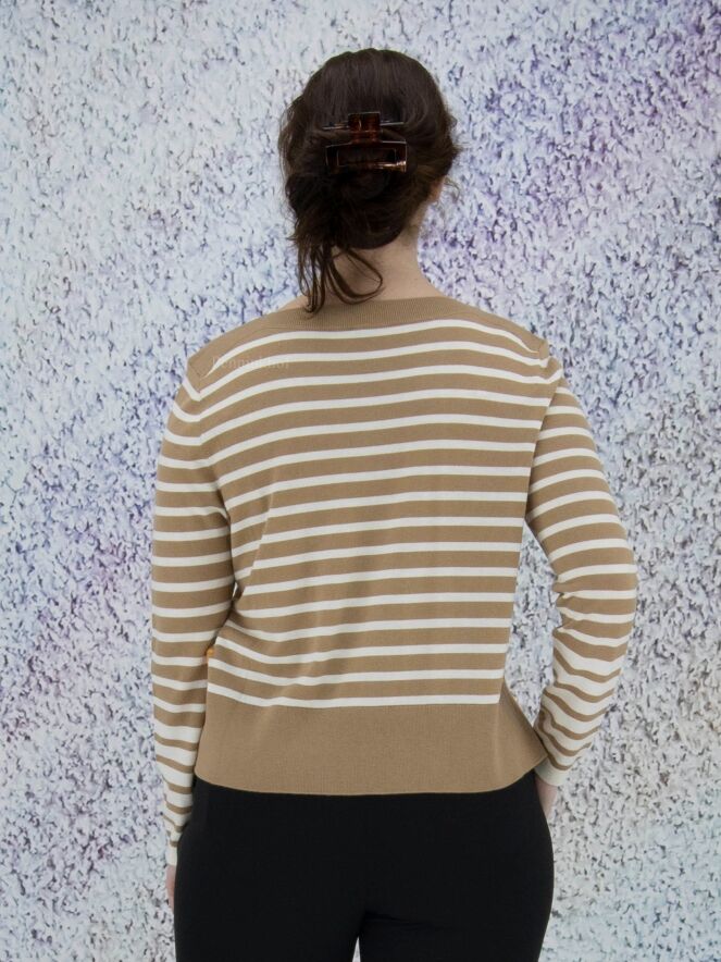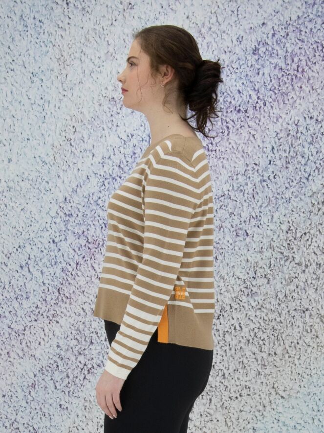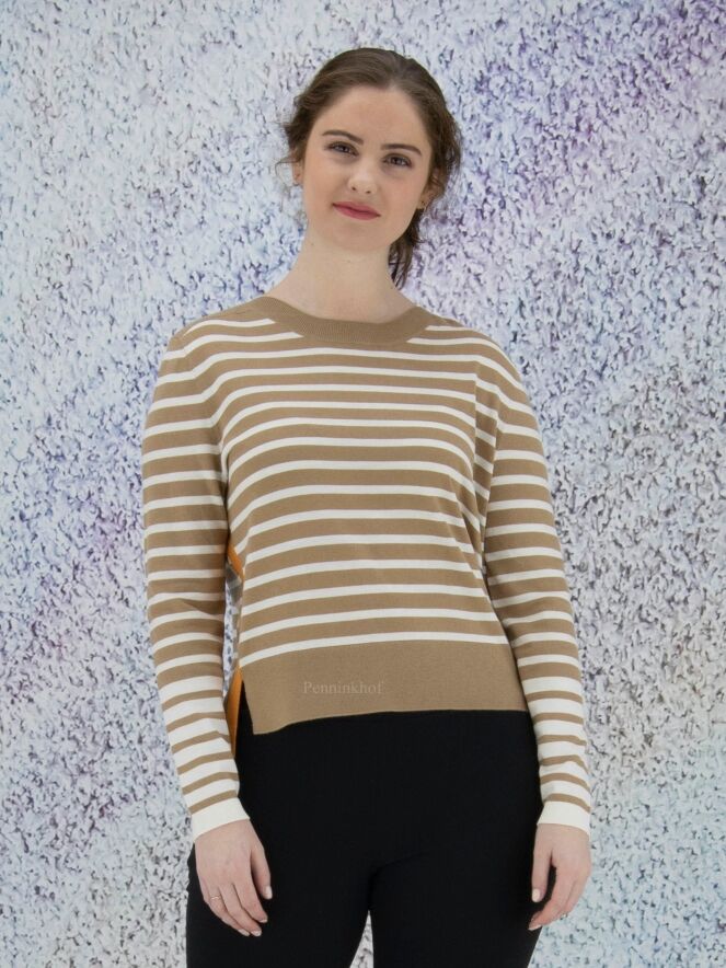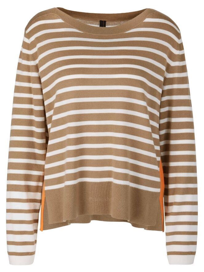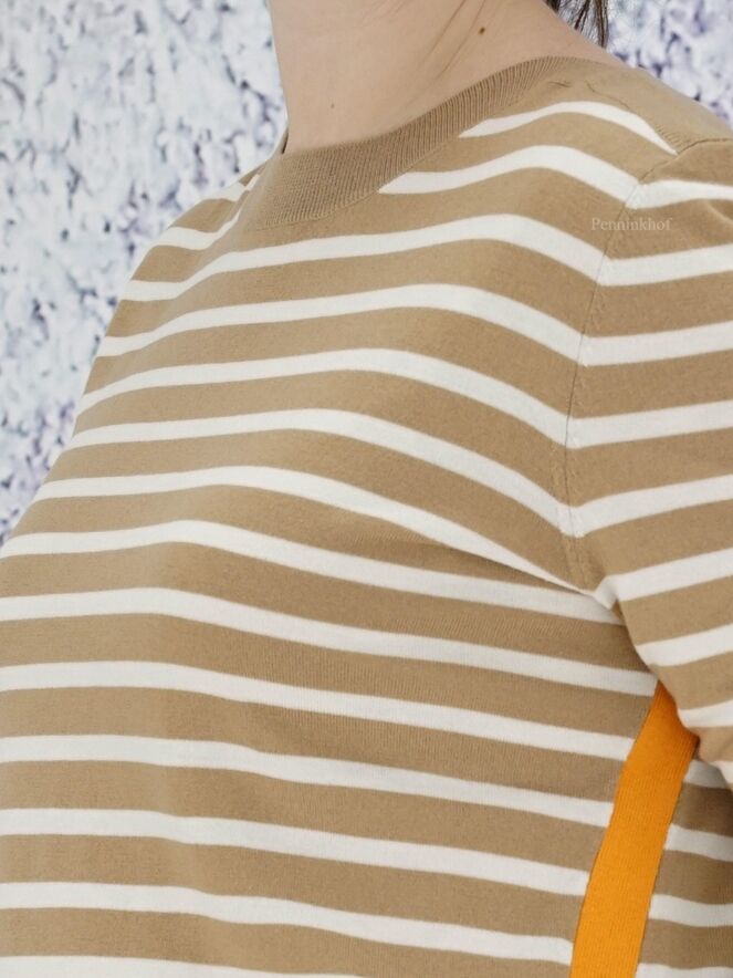 A pullover from Marc Cain in a striped pattern with the colors taupe and cream white. Along the sides is an orange trim. This pullover can be washed by hand.
