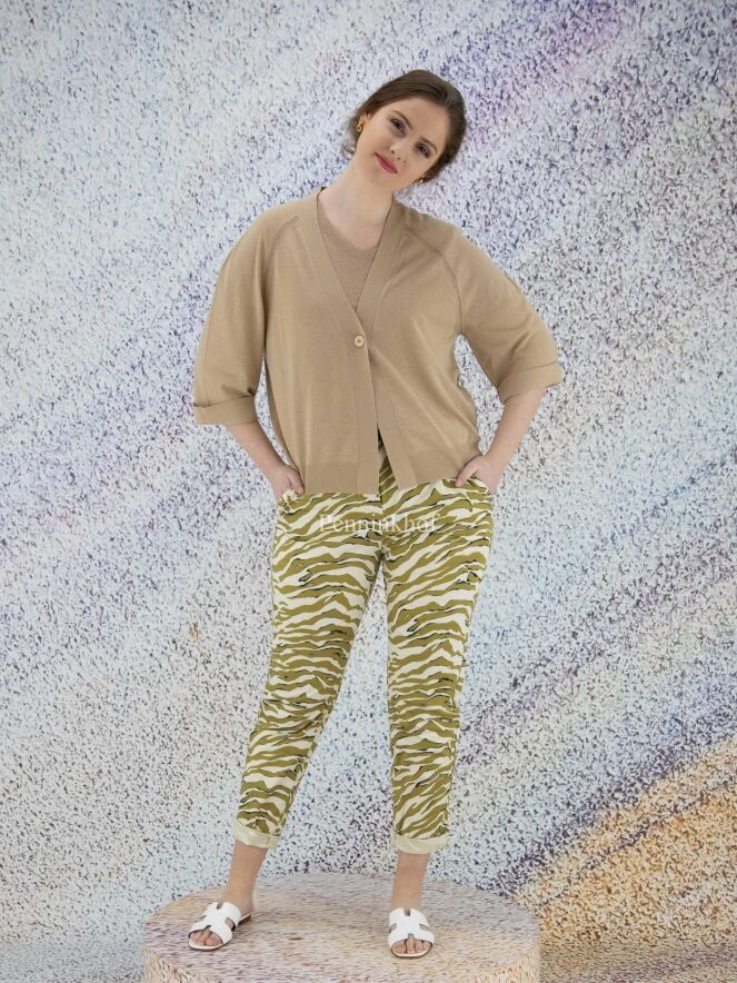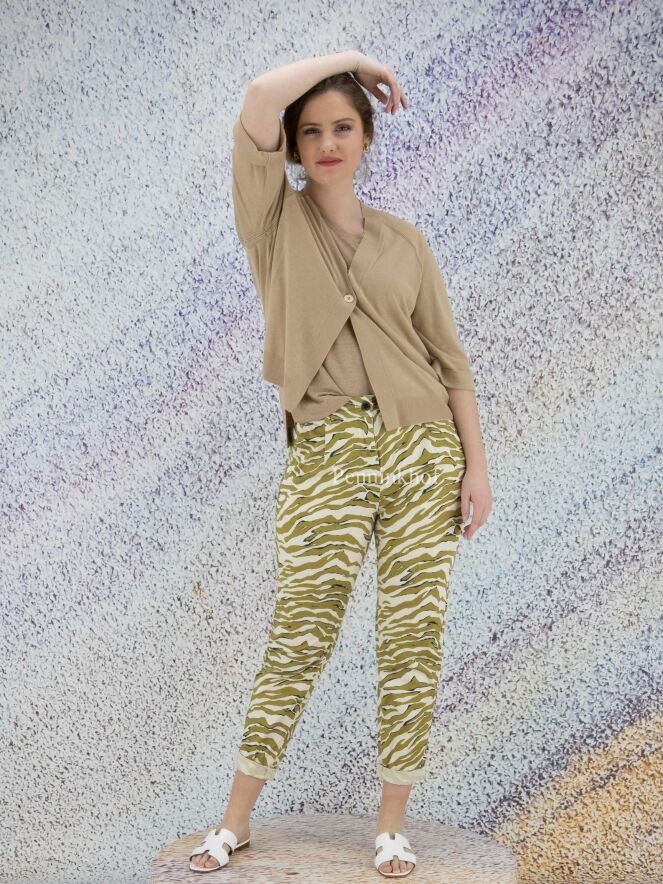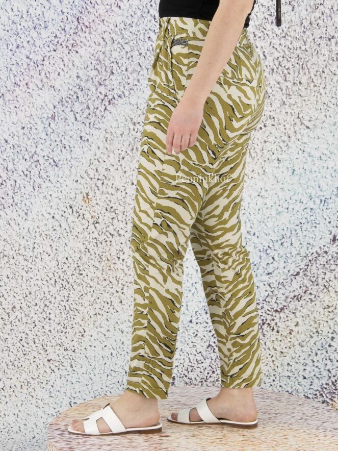 Marc Cain pants in a zebra print with the colors pistachio green, black and cream white. The pants have side pockets and a short cover at the bottom of the legs. These pants can be washed at 30 degrees.