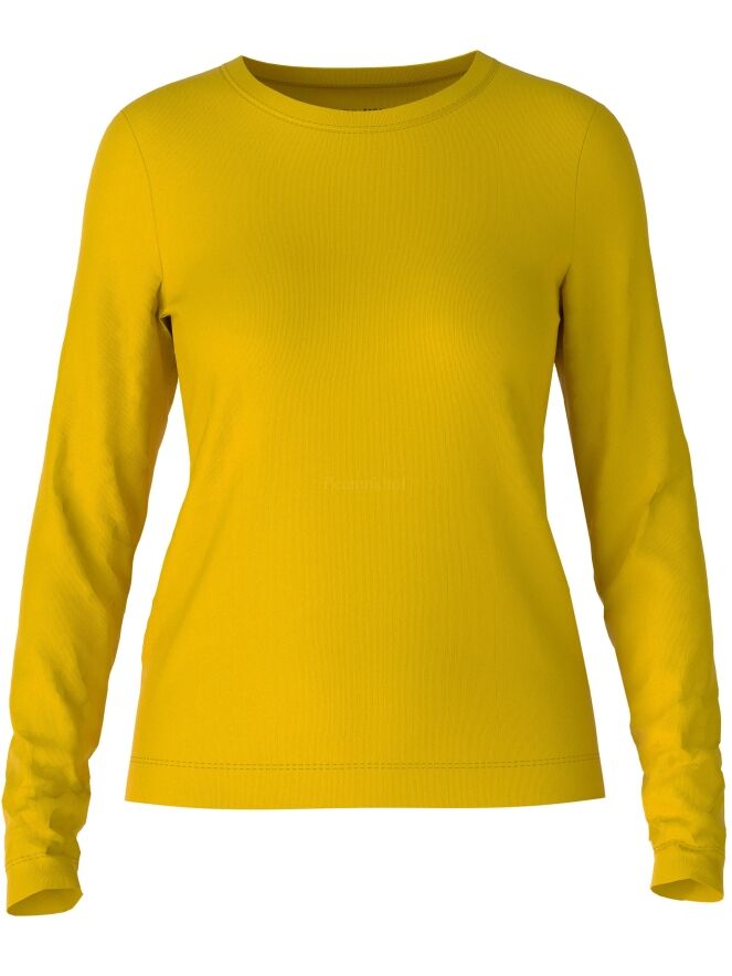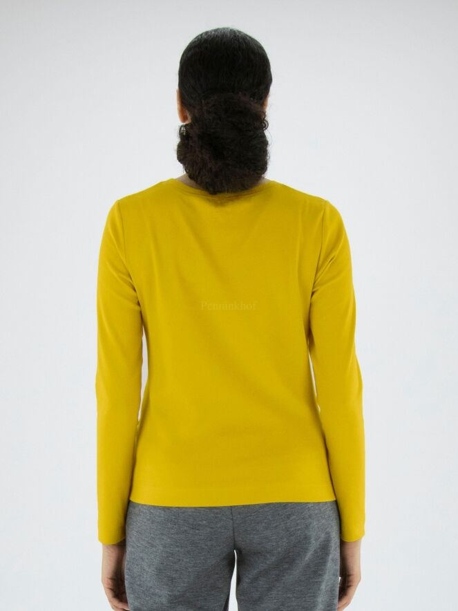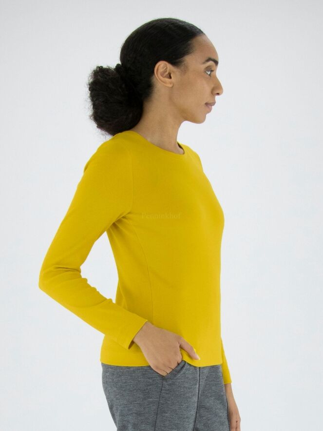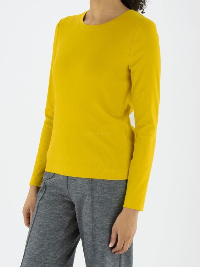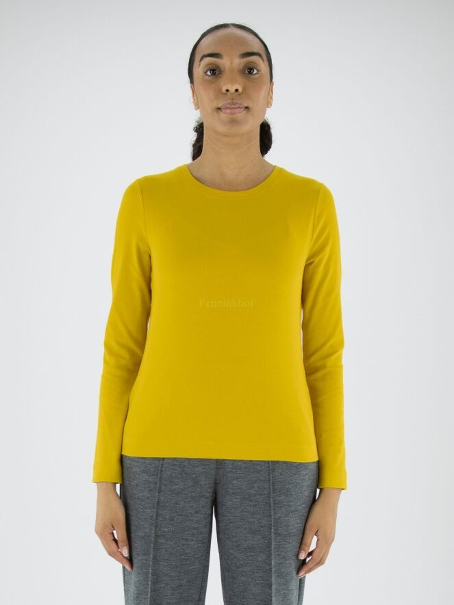 A fine ribbed shirt from Marc Cain in the colour yellow. The shirt has a round neckline and long sleeves. This shirt may be washed at 30 degrees.