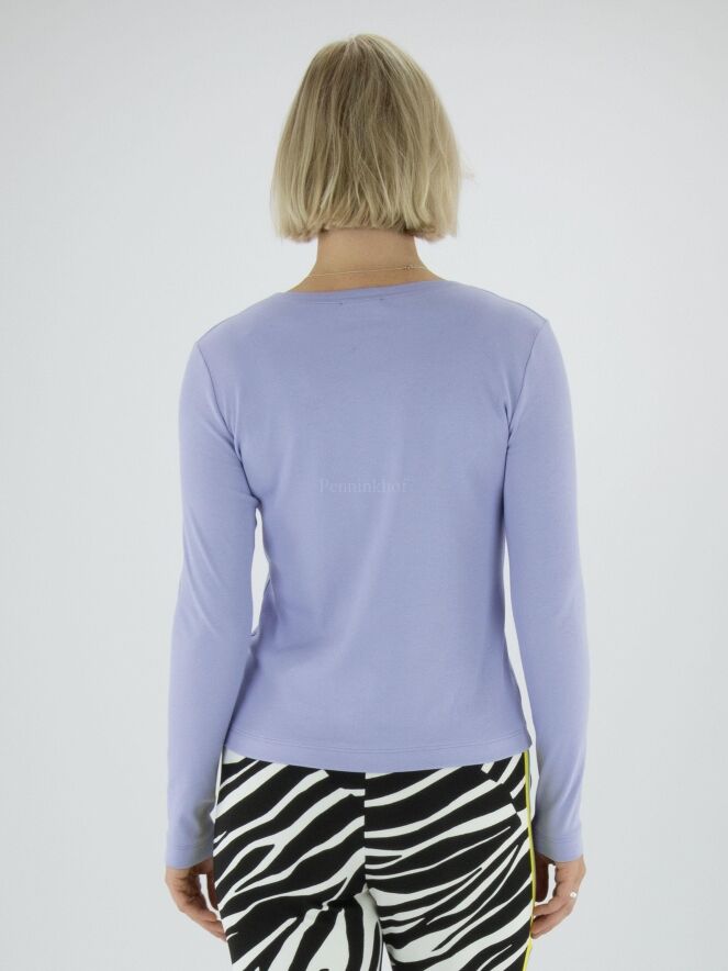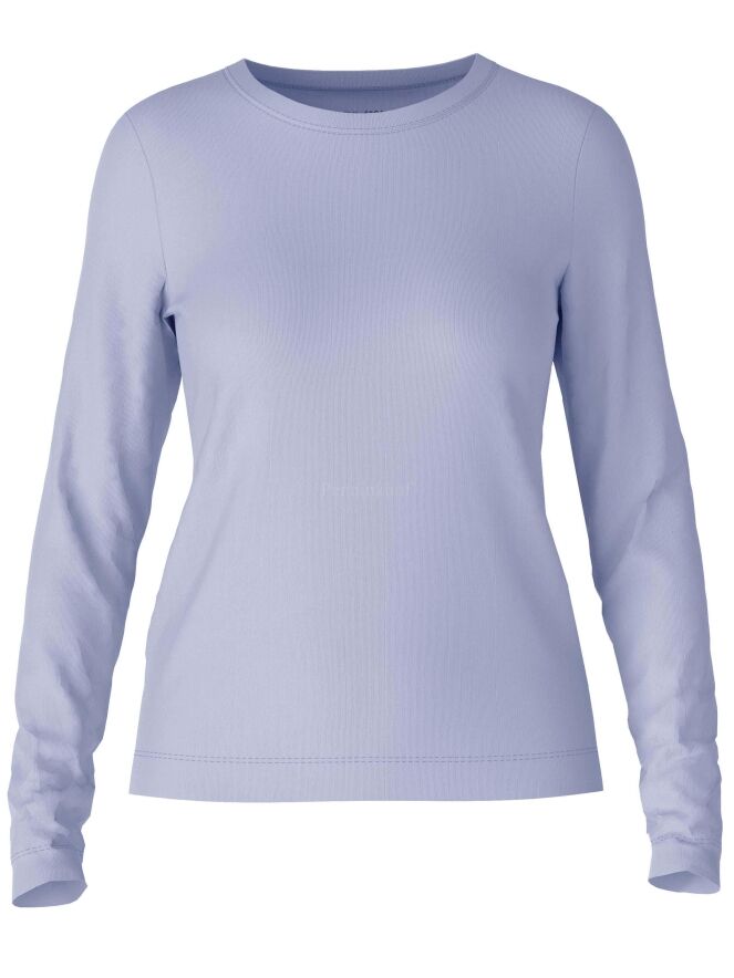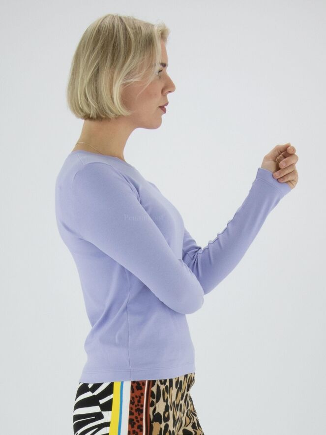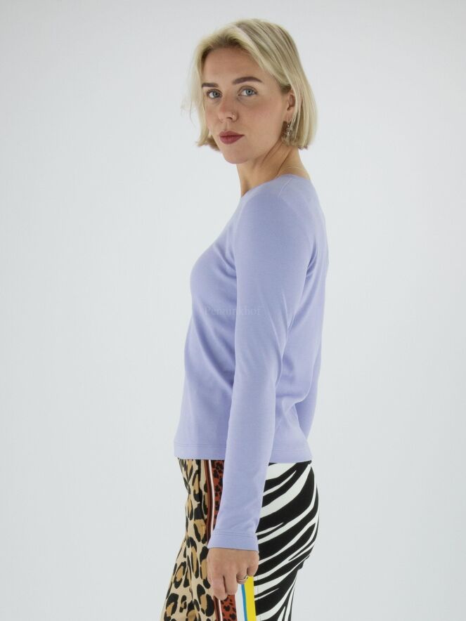 A fine ribbed shirt from Marc Cain in the colour lilac. The shirt has a round neckline and long sleeves. This shirt can be washed at 30 degrees.