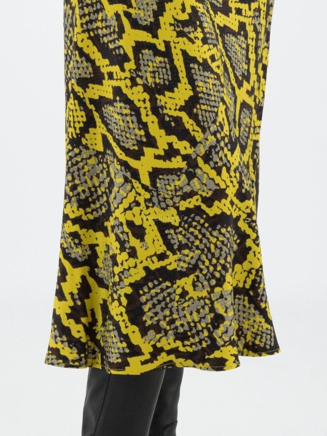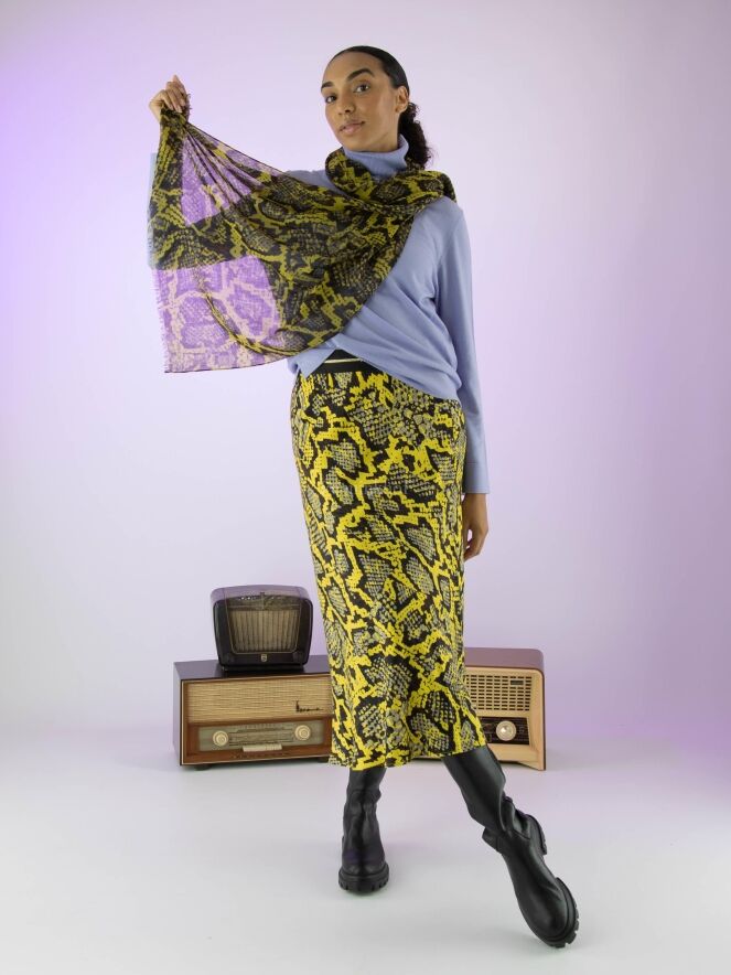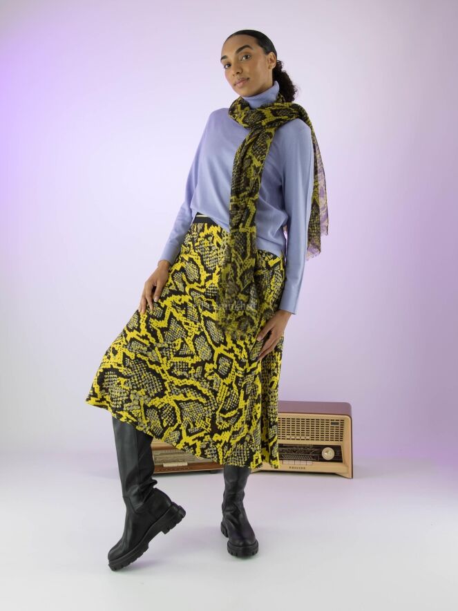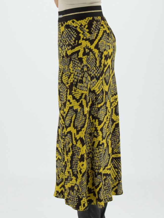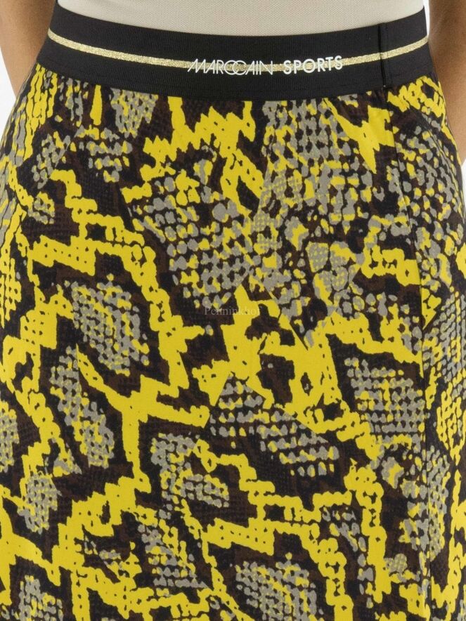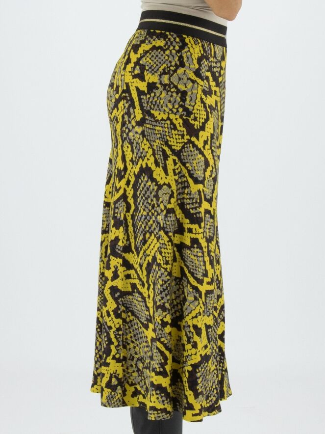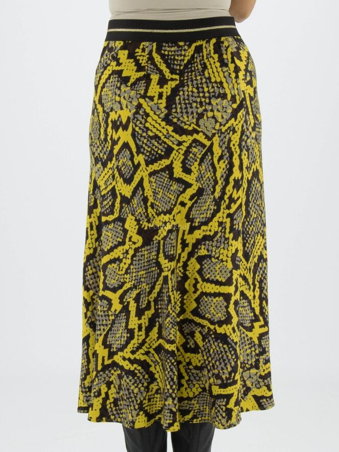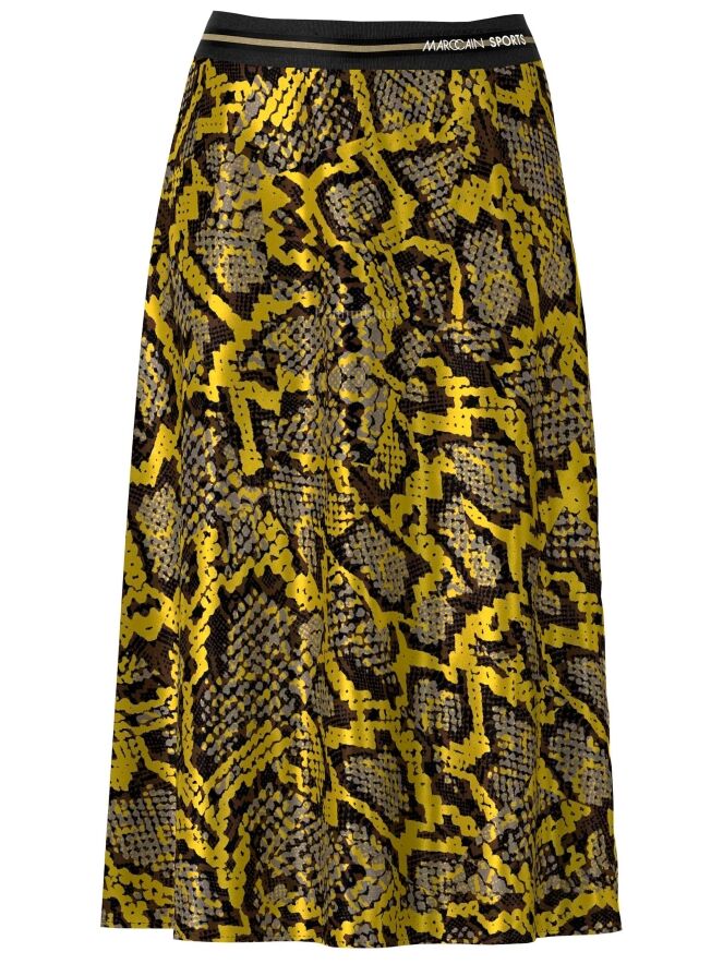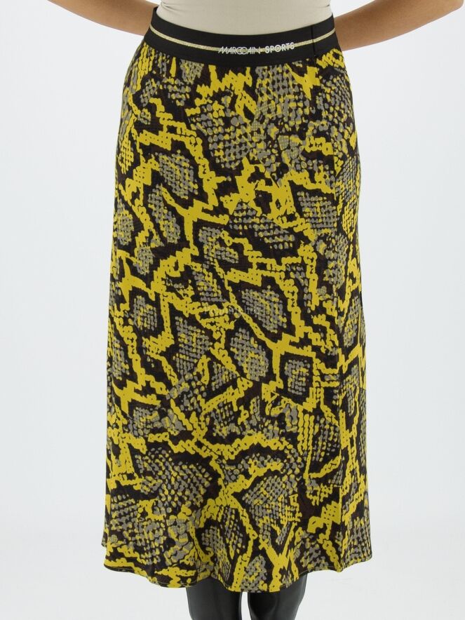 Marc Cain skirt in a reptile print with the colours yellow, black and grey. At the waist is a black elasticated band. The skirt has a slight A-line and is unlined. This skirt may be washed at 30 degrees.