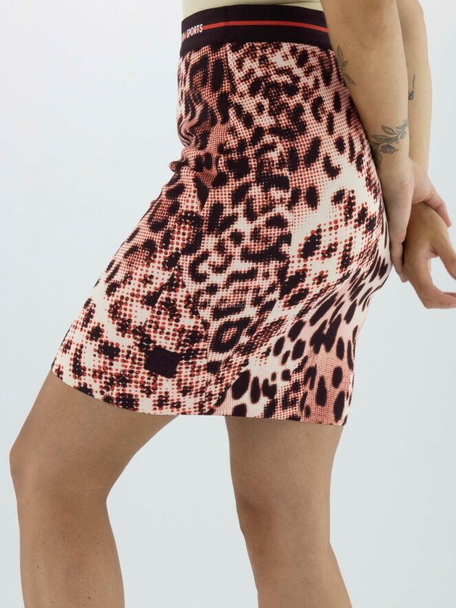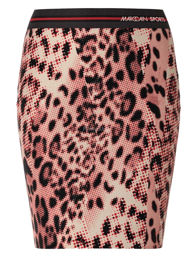 Marc Cain skirt in a graphic panther print with the colours red, cream white and black. There is a black elasticated band at the waist. The skirt is lined and can be washed at 30 degrees.