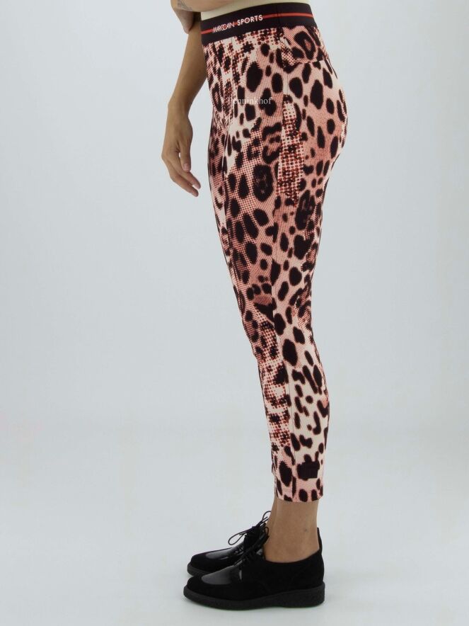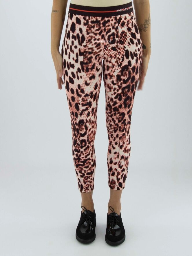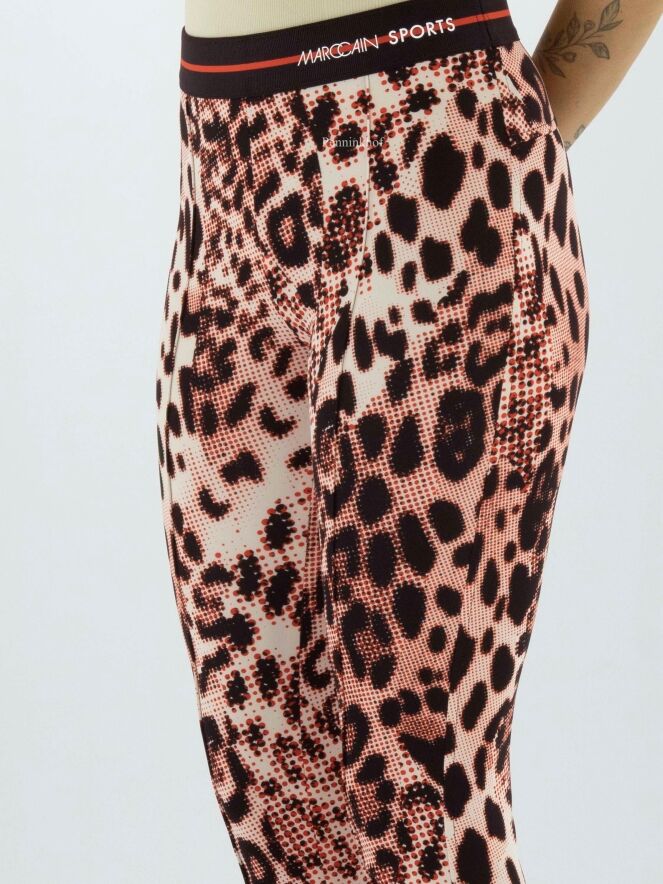 Marc Cain trousers in a graphic panther print with the colours red, cream white and black. There is a black elasticated band at the waist. These trousers may be washed at 30 degrees.