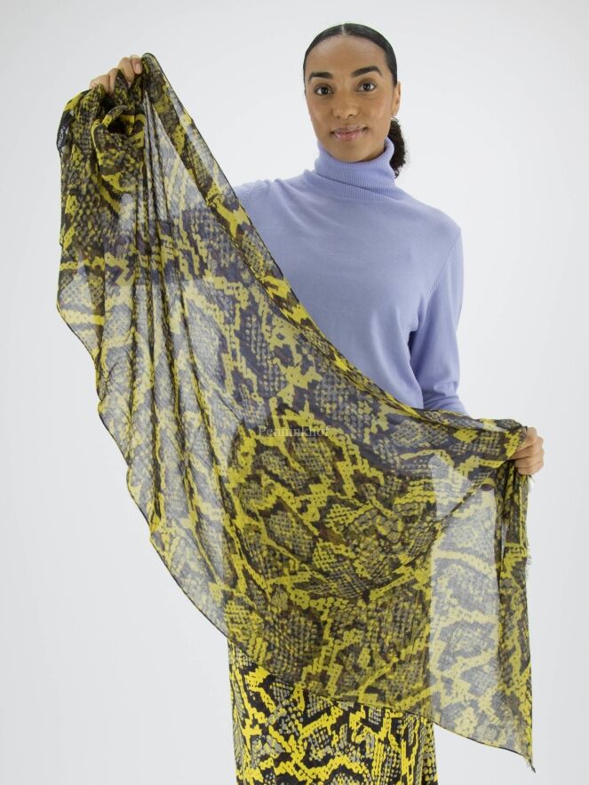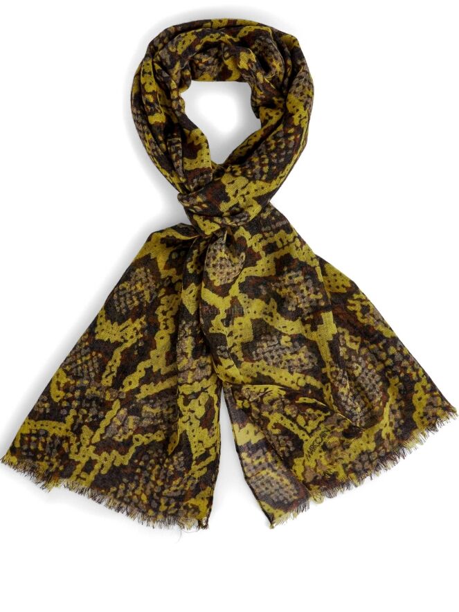 Marc Cain slightly transparent scarf in a reptile print with the colours yellow, brown, grey and black. The ends of the scarf are finely frayed. This scarf should be washed by hand.