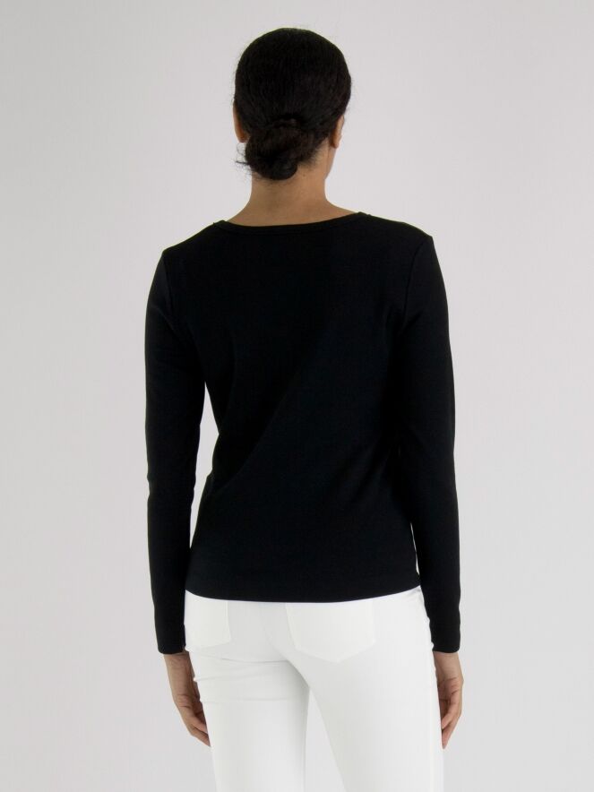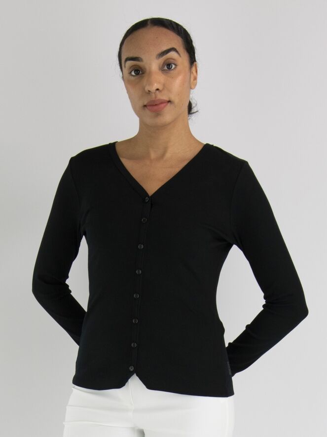 A cardigan from Marc Cain with a finely ribbed structure, in black. The cardigan has long sleeves and closes with imitation buttons; it cannot be worn openly. The vest is suitable for washing at 30 degrees.