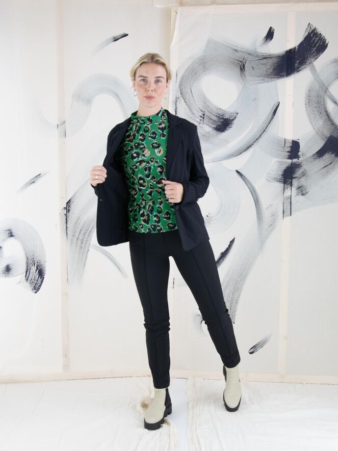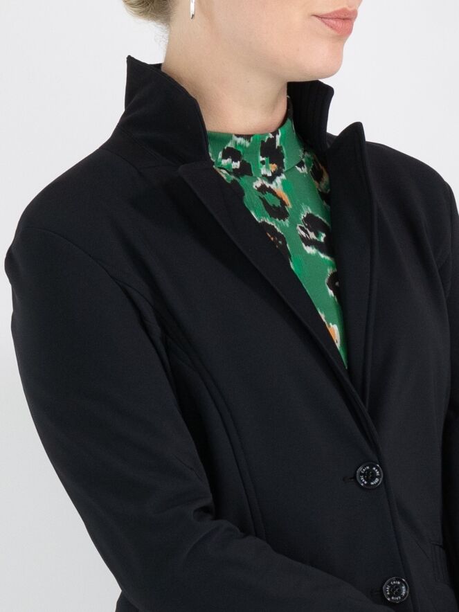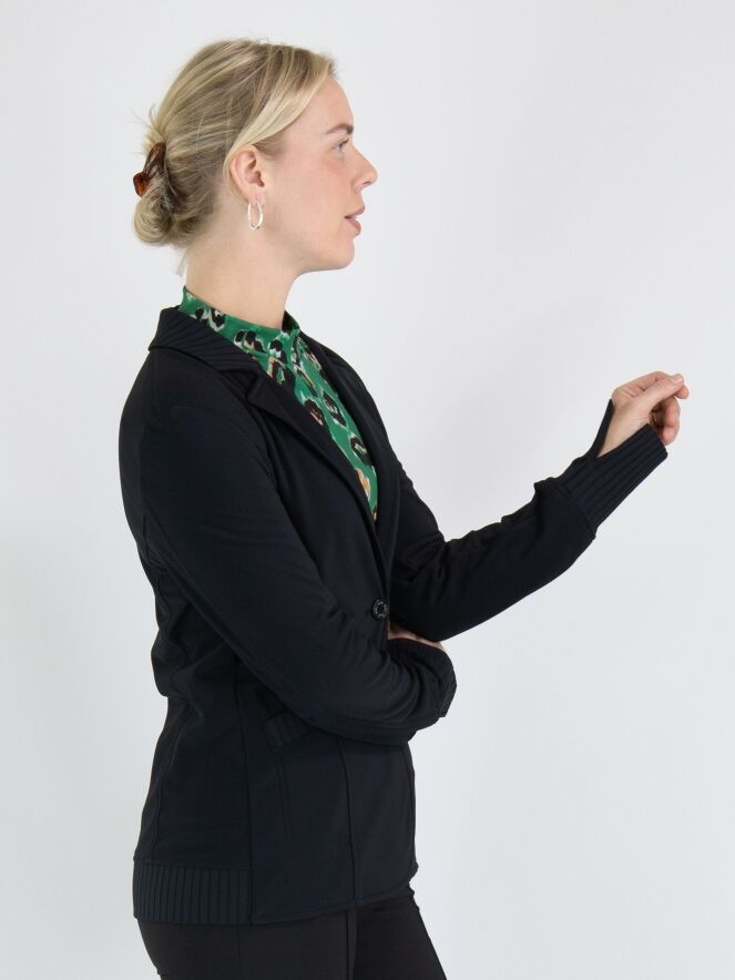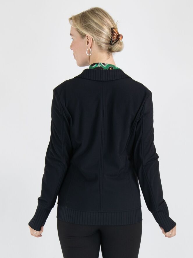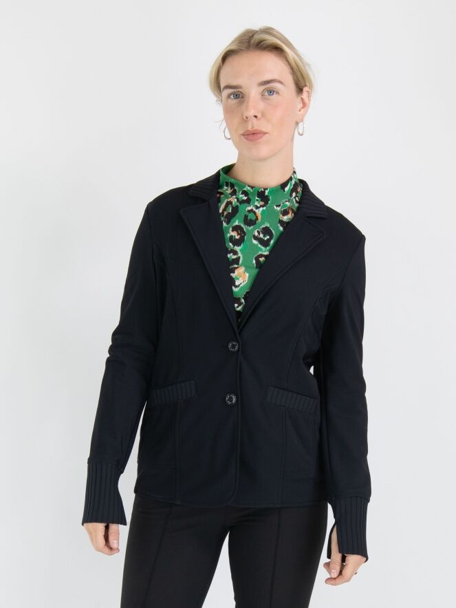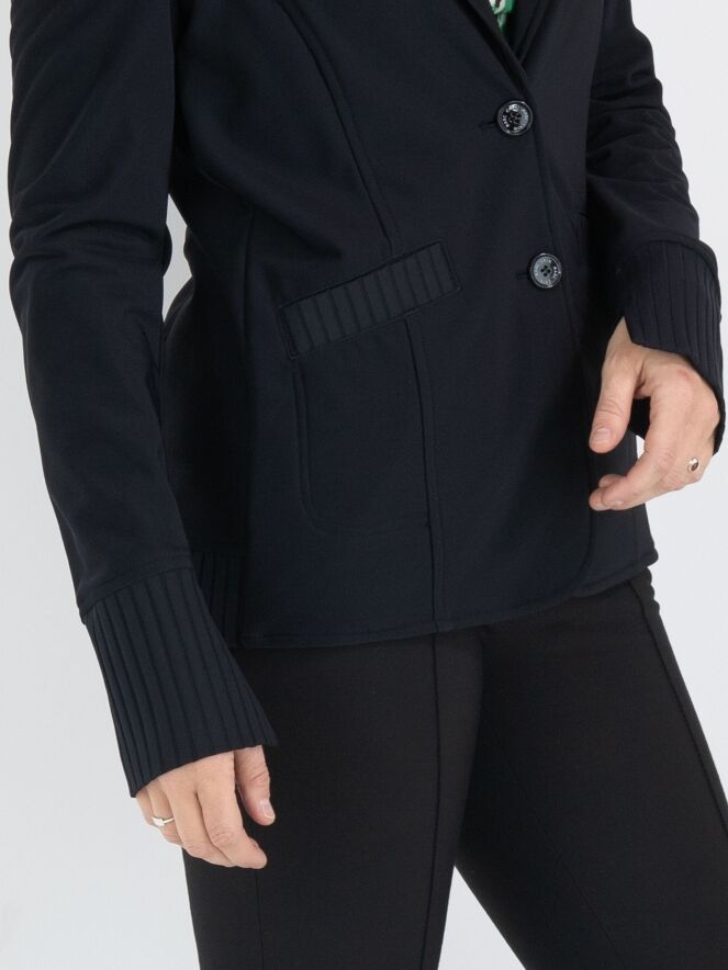 A blazer by Marc Cain in scuba fabric in black color. The collar, the ends of the long sleeves, and the edges of the pockets are made of ribbed knit fabric. This blazer can be washed at 30 degrees.