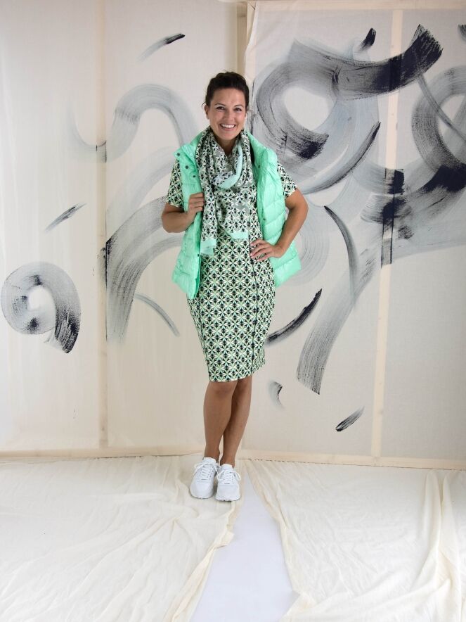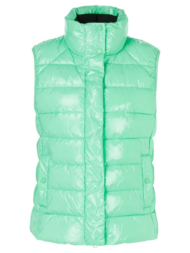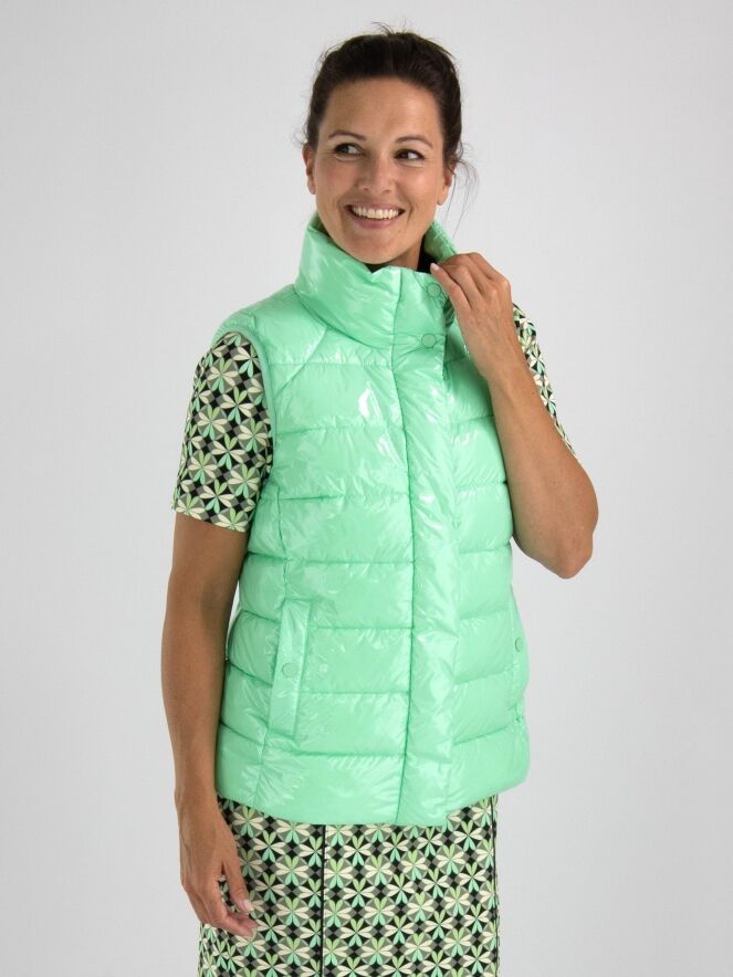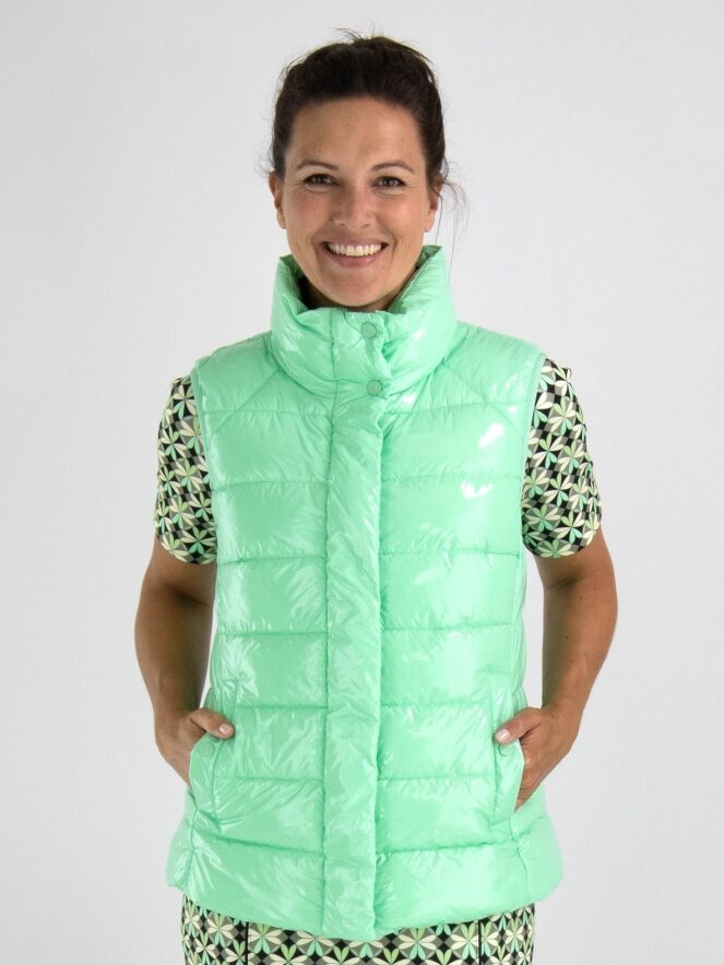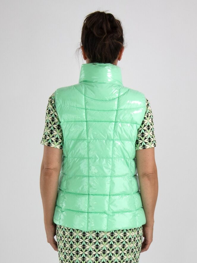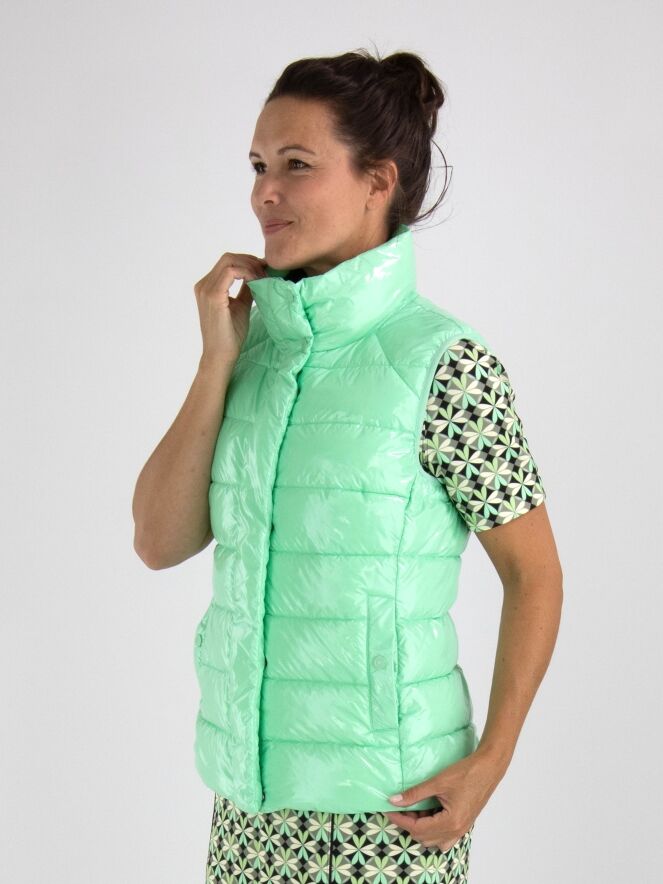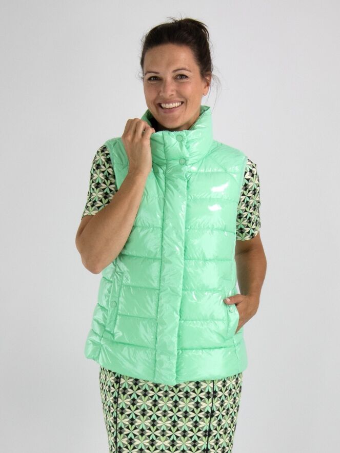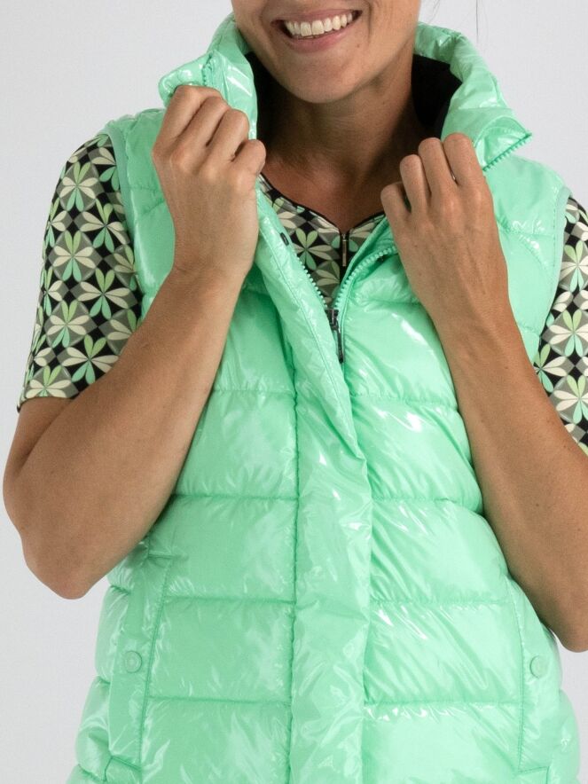 A quilted short vest from Marc Cain in a bright pastel green lacquered color. The vest features a zipper closure with hidden snap buttons as a secondary fastening. This vest can be washed at 30 degrees.