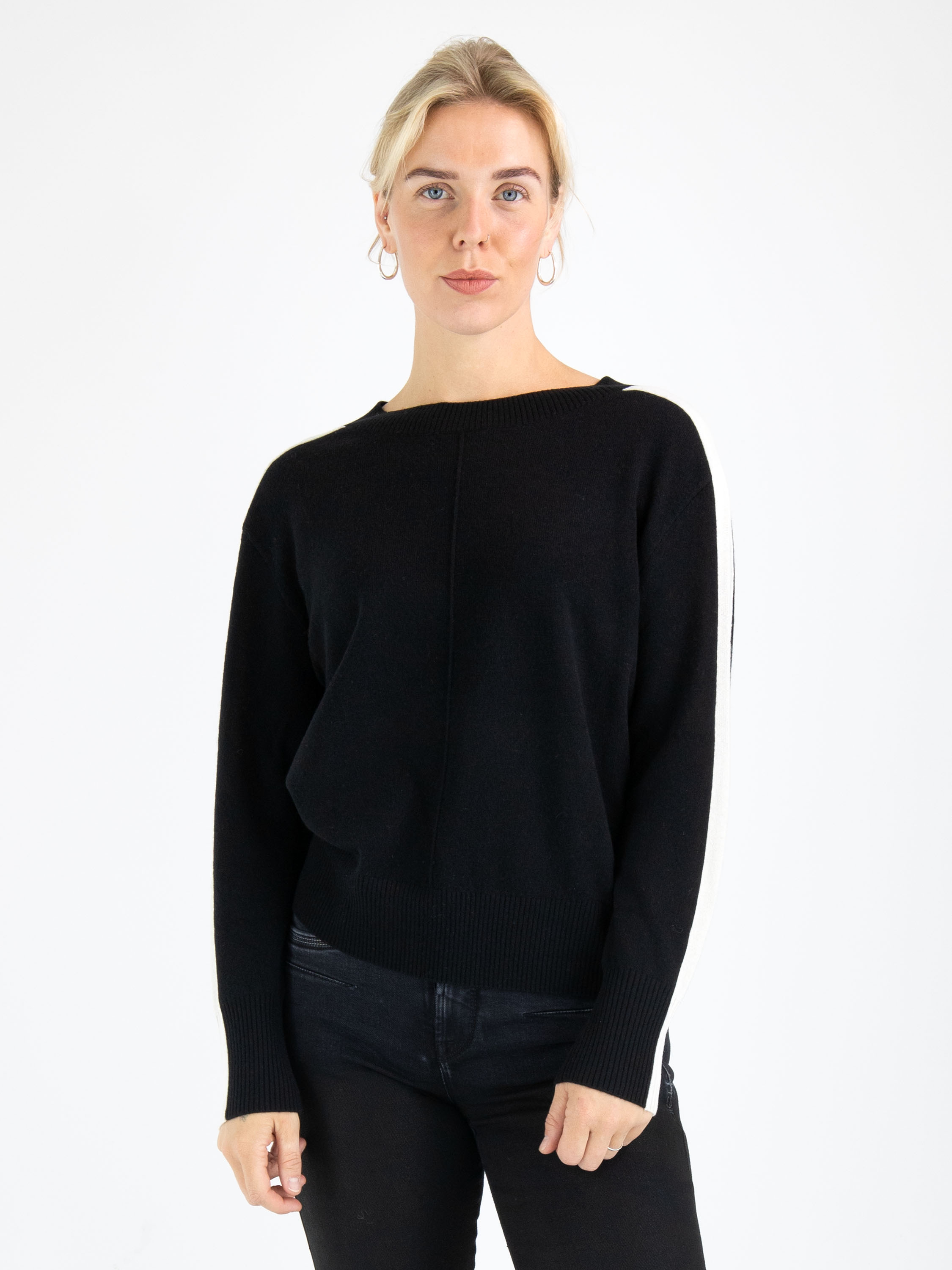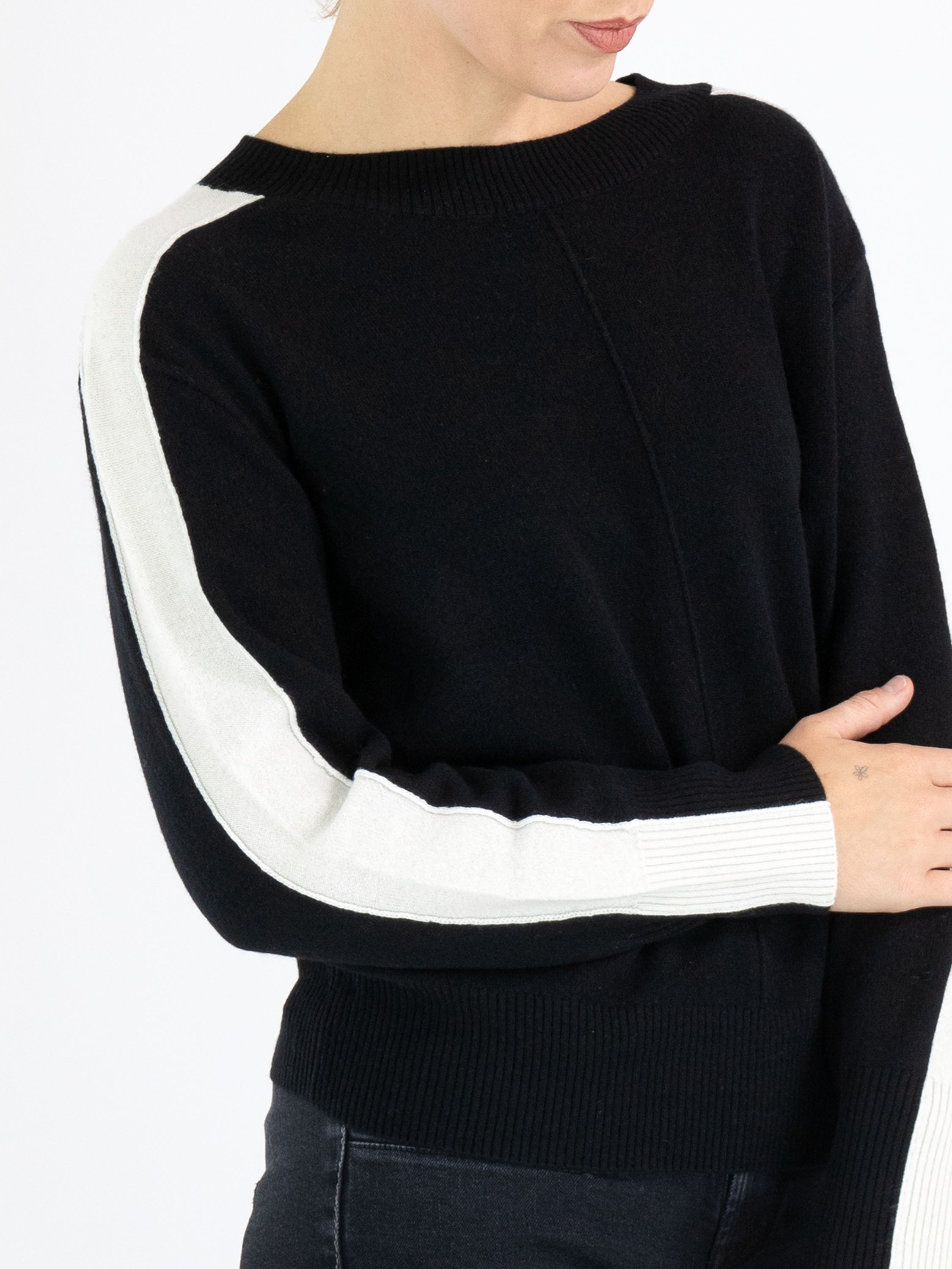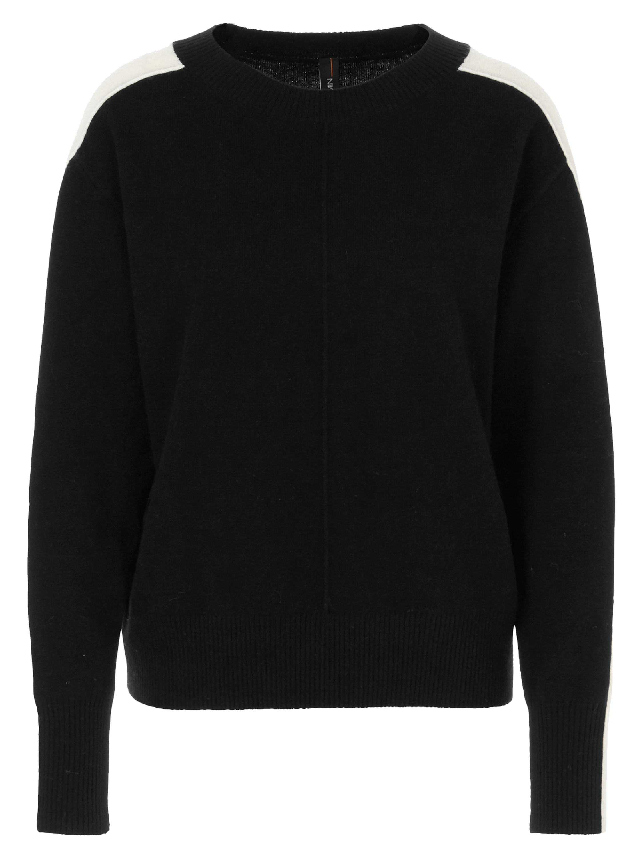 A pullover by Marc Cain in black color. From the shoulders down the entire length of the long sleeves runs a wide cream-white trim. Along the edge of the round neckline, the cuffs, and the hem of the pullover is a finely ribbed knit trim. There is an inverted seam in the center of the front. This pullover can be hand-washed.