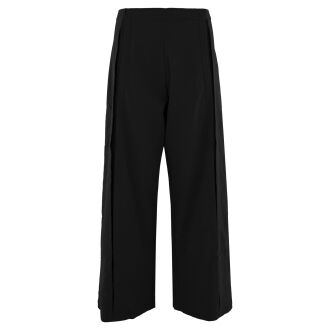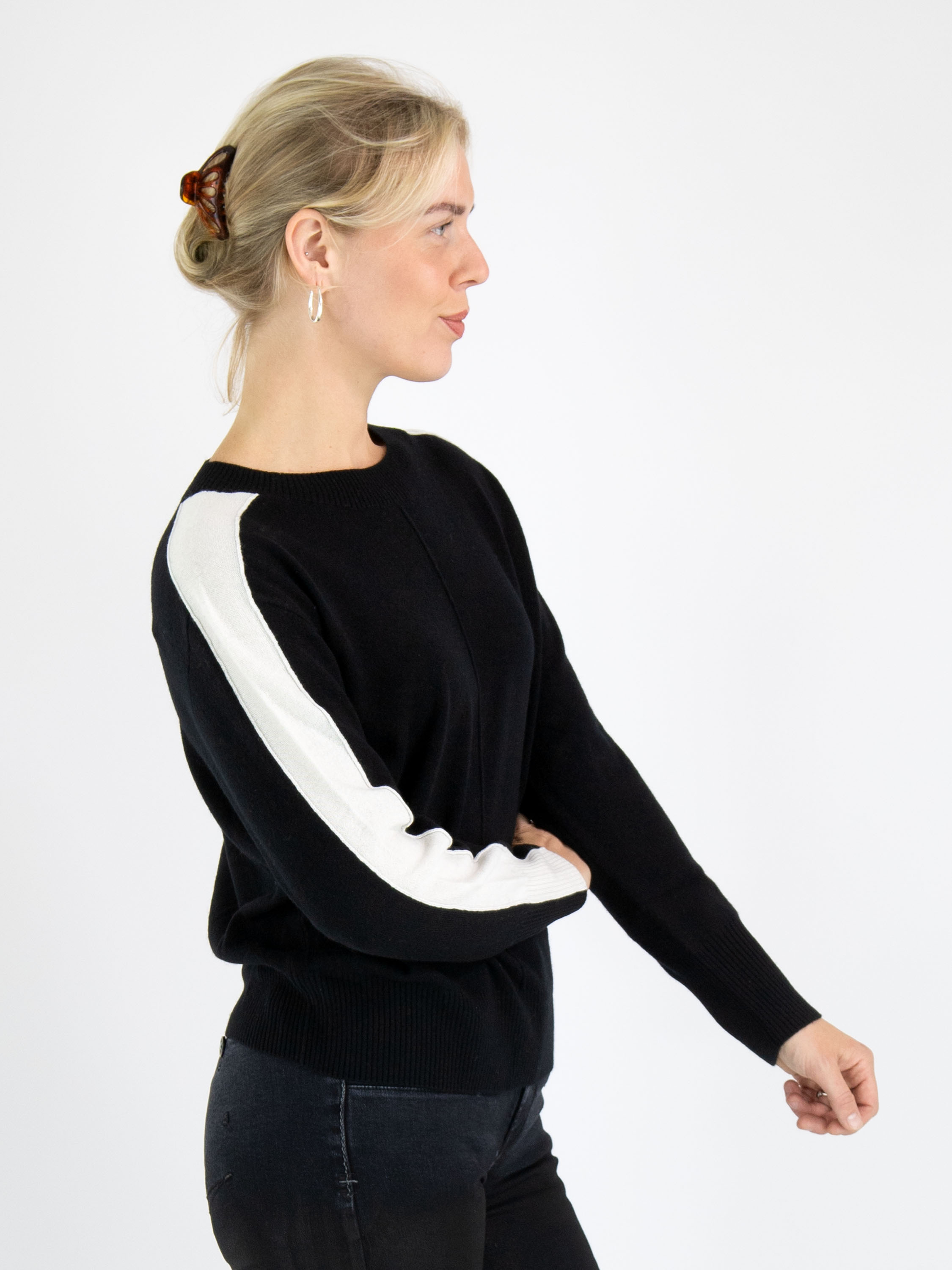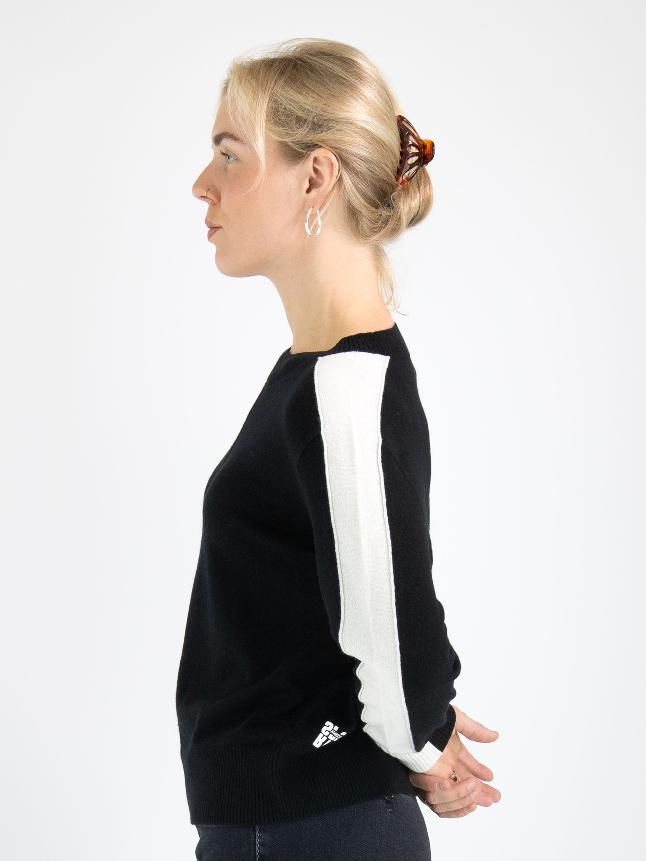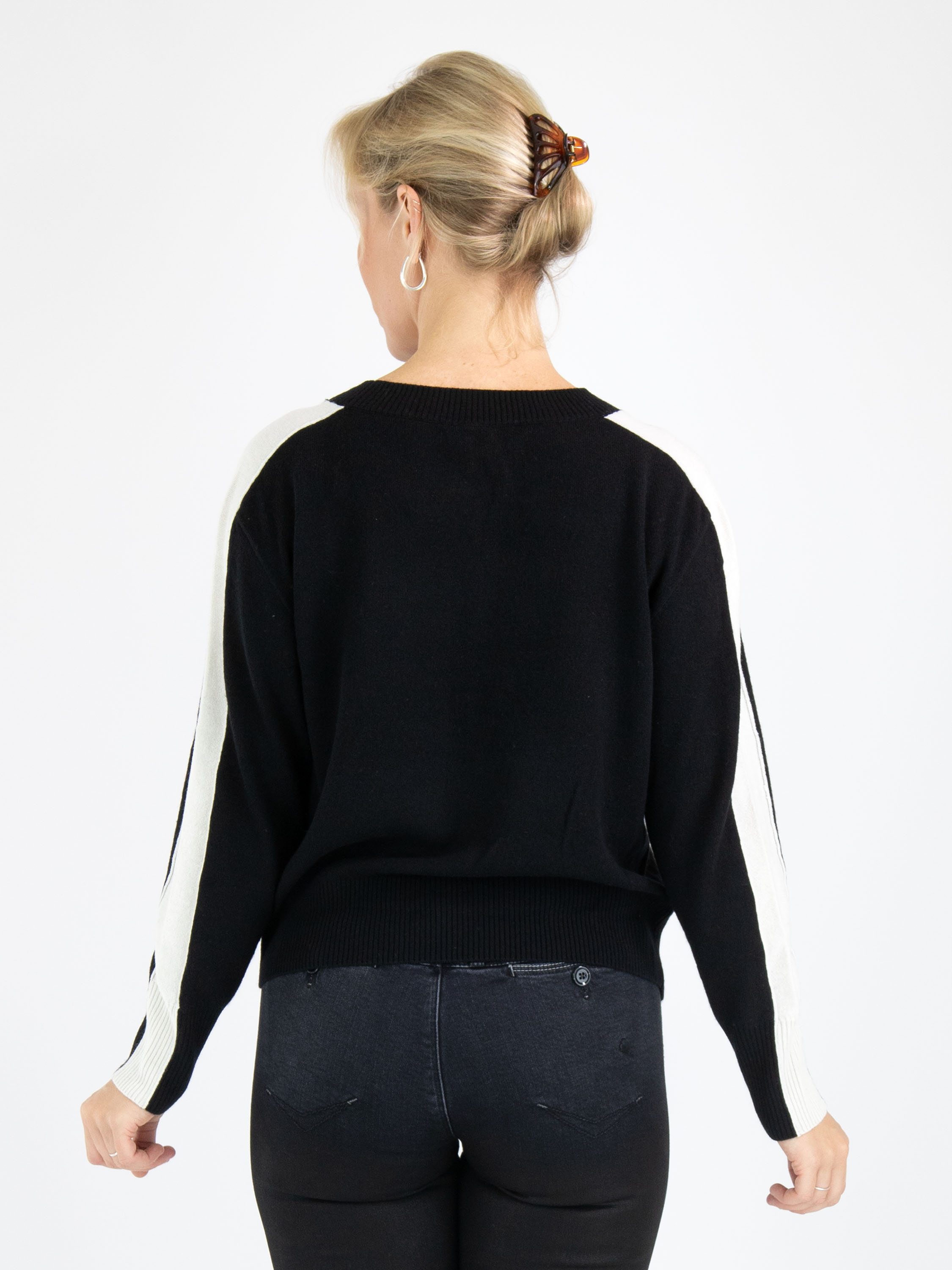 A pullover by Marc Cain in black color. From the shoulders down the entire length of the long sleeves runs a wide cream-white trim. Along the edge of the round neckline, the cuffs, and the hem of the pullover is a finely ribbed knit trim. There is an inverted seam in the center of the front. This pullover can be hand-washed.