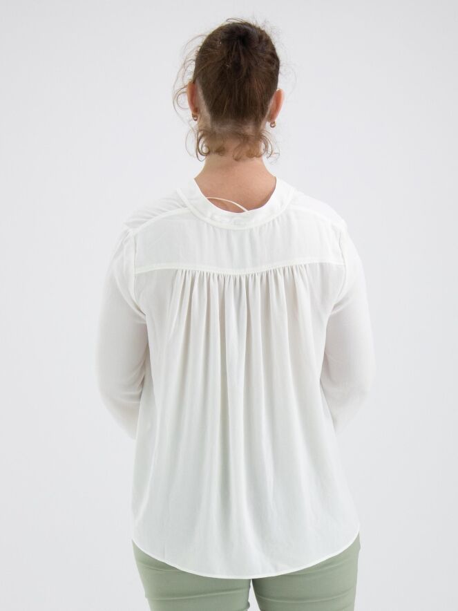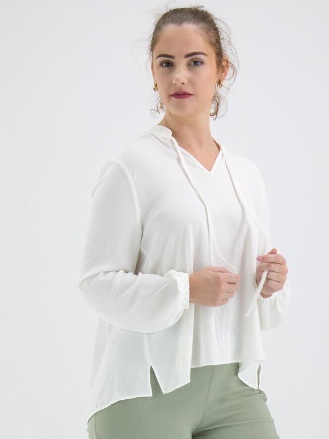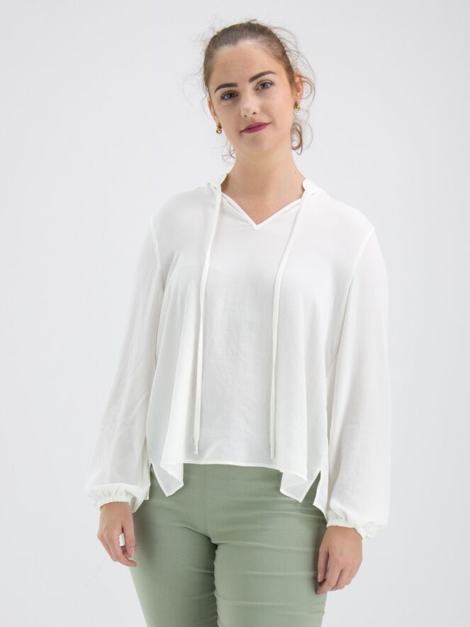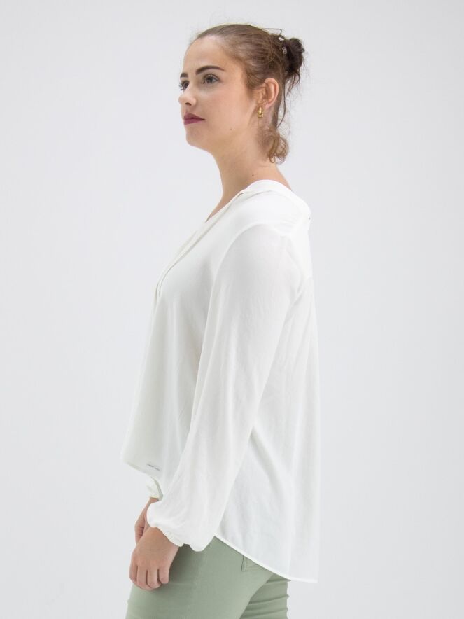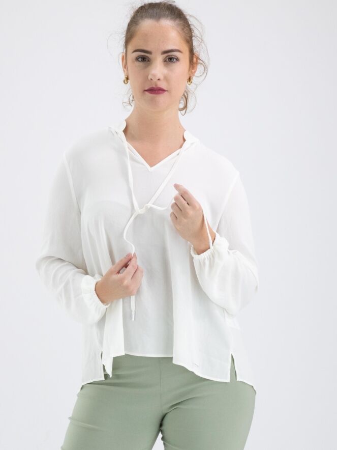 A Marc Cain shirt in cream white color. The shirt has a V-neckline and from the collar, there are two cords that can be tied into a decorative bow. On the back, at shoulder blade height, there is a seam along which the fabric is finely pleated. This blouse can be washed at 30 degrees.