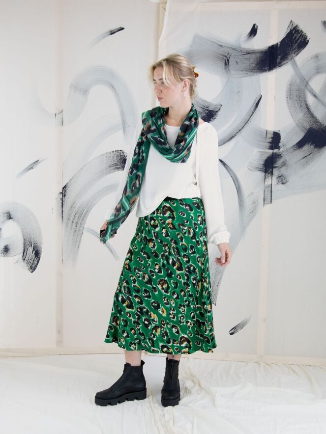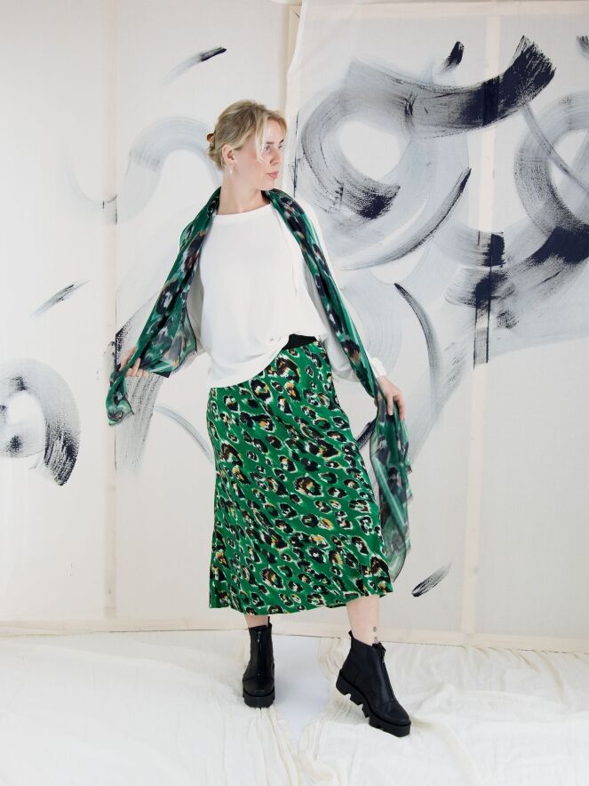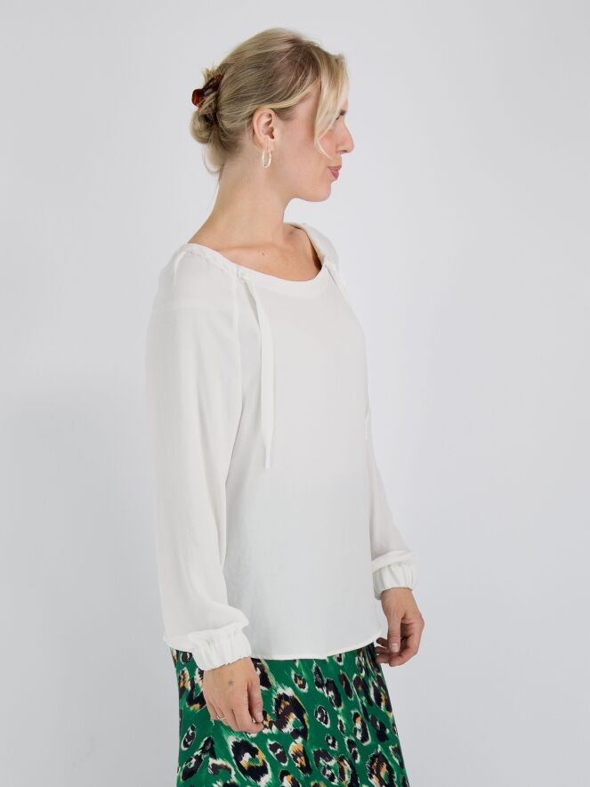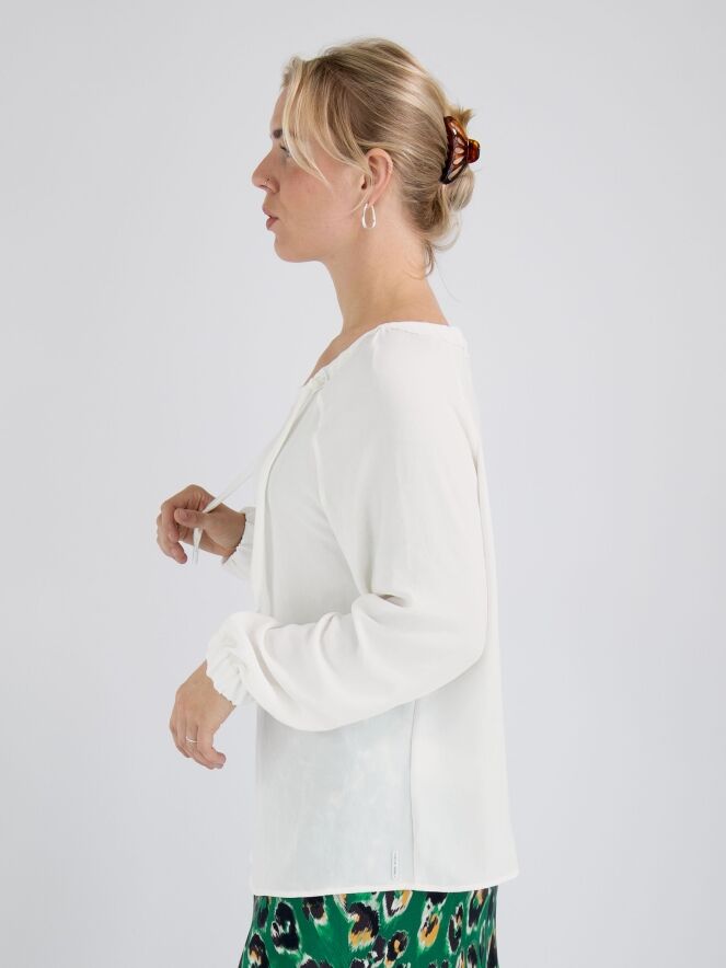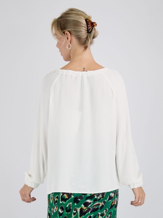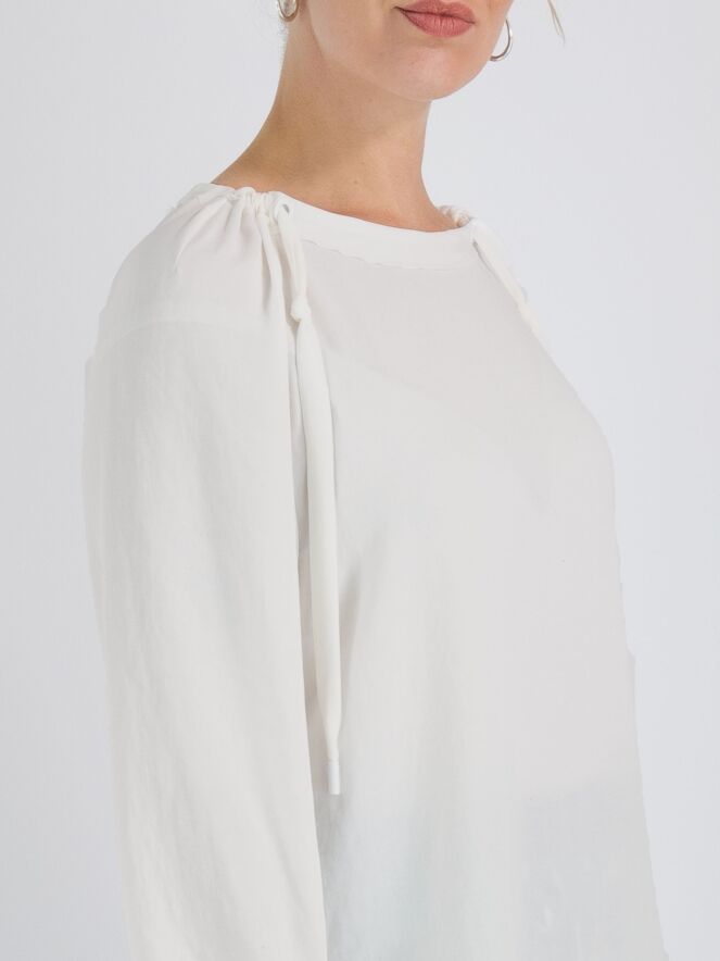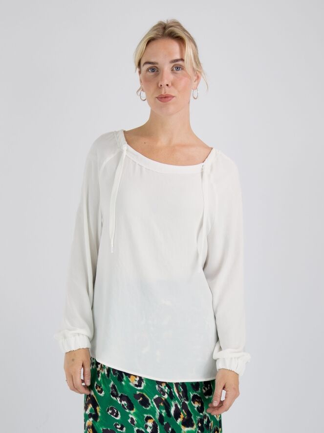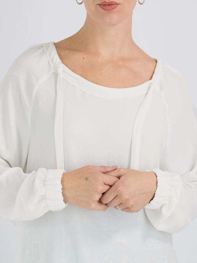 A shirt by Marc Cain in cream white color. In the edge of the wide round neckline is a ribbon that can create a pleated effect. At the ends of the long sleeves, there is a pleated trim with elastic. This shirt can be washed at 30 degrees.