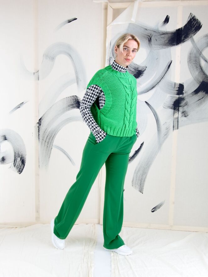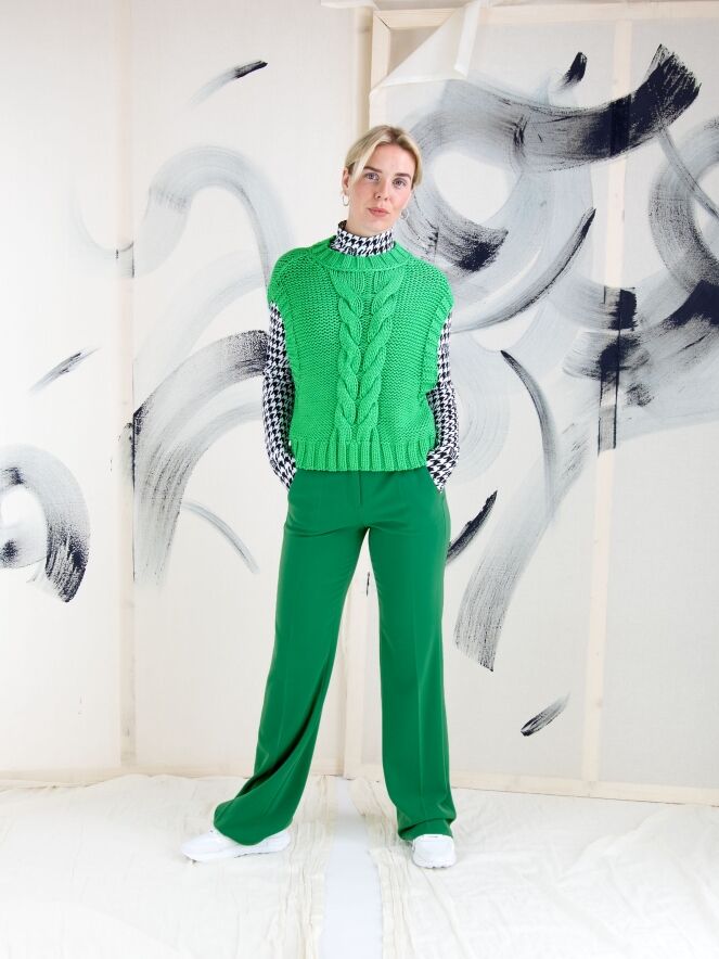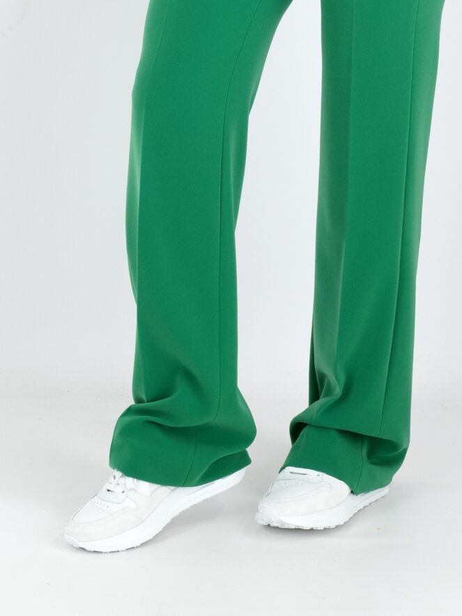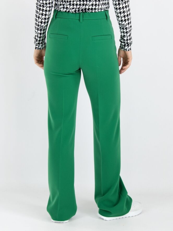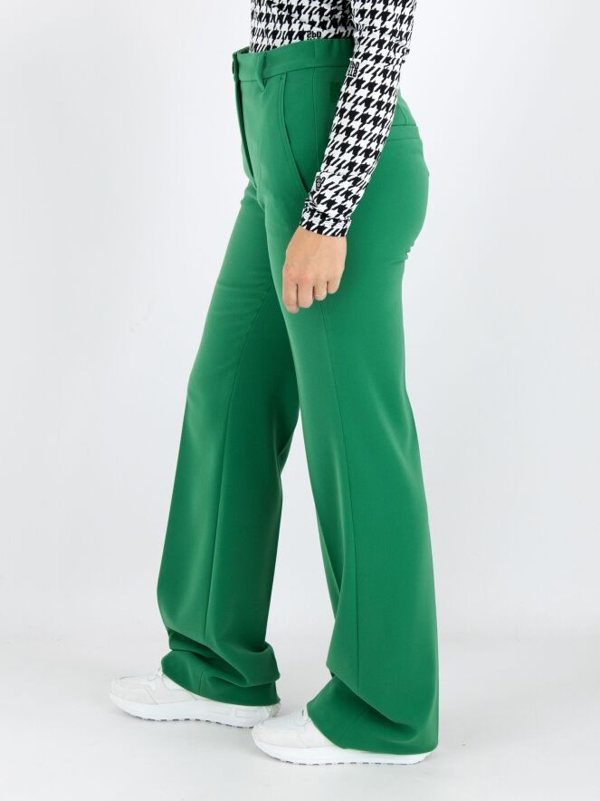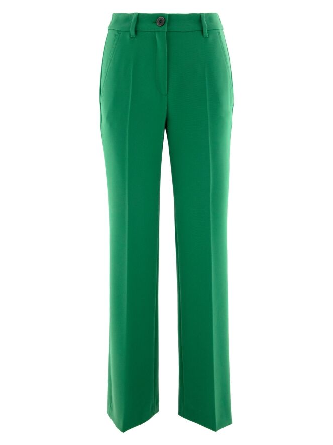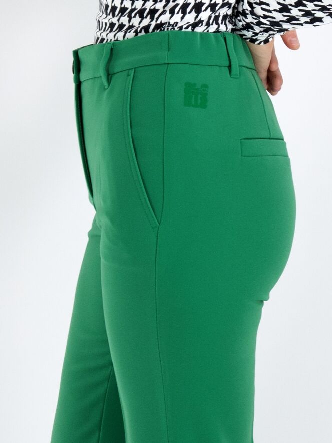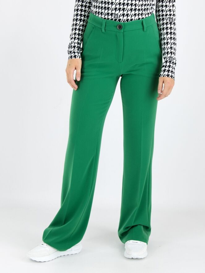 Een broek van Marc Cain in de kleur groen. In de taille is een elastische band. De broek heeft recht gesneden pijpen en steekzakken. In het midden van de pijpen is een ingestreken plooi. Deze broek mag op 30 graden worden gewassen.